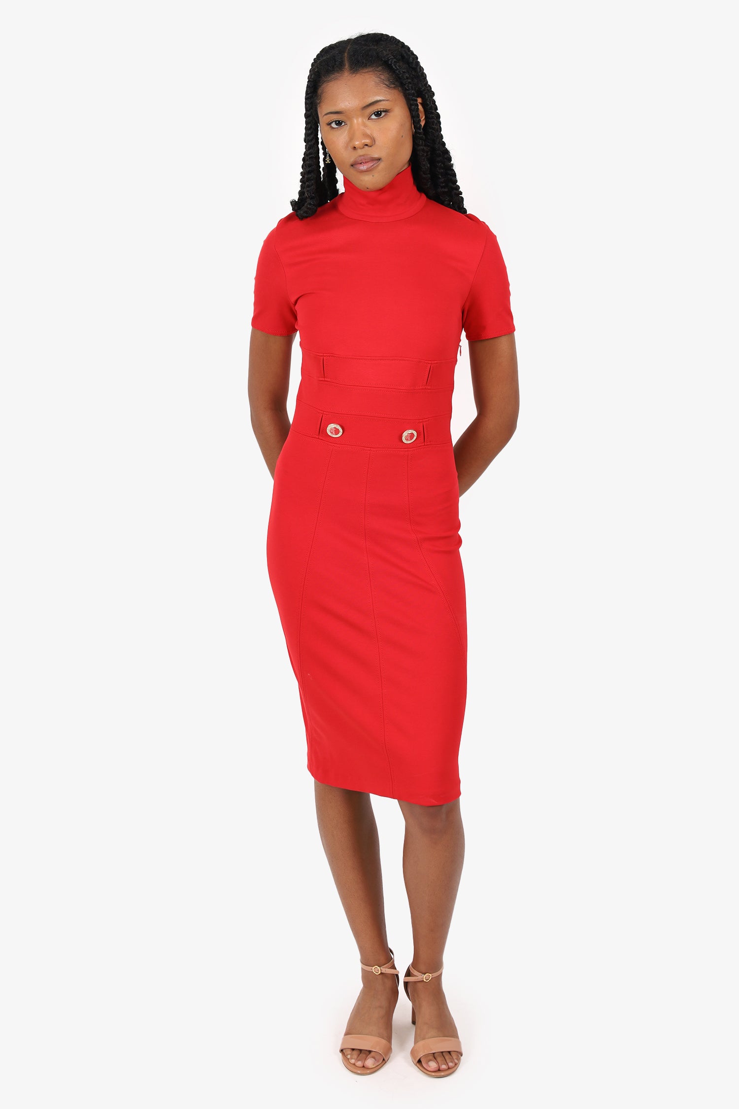 Refresh availabilityVersace Collection Red Knit Button Detail Mock Neck Midi Dress. Slip-on. Mock neckline. Rear zip and hook closure. Rear cut out at waistline. Tonal stitching.