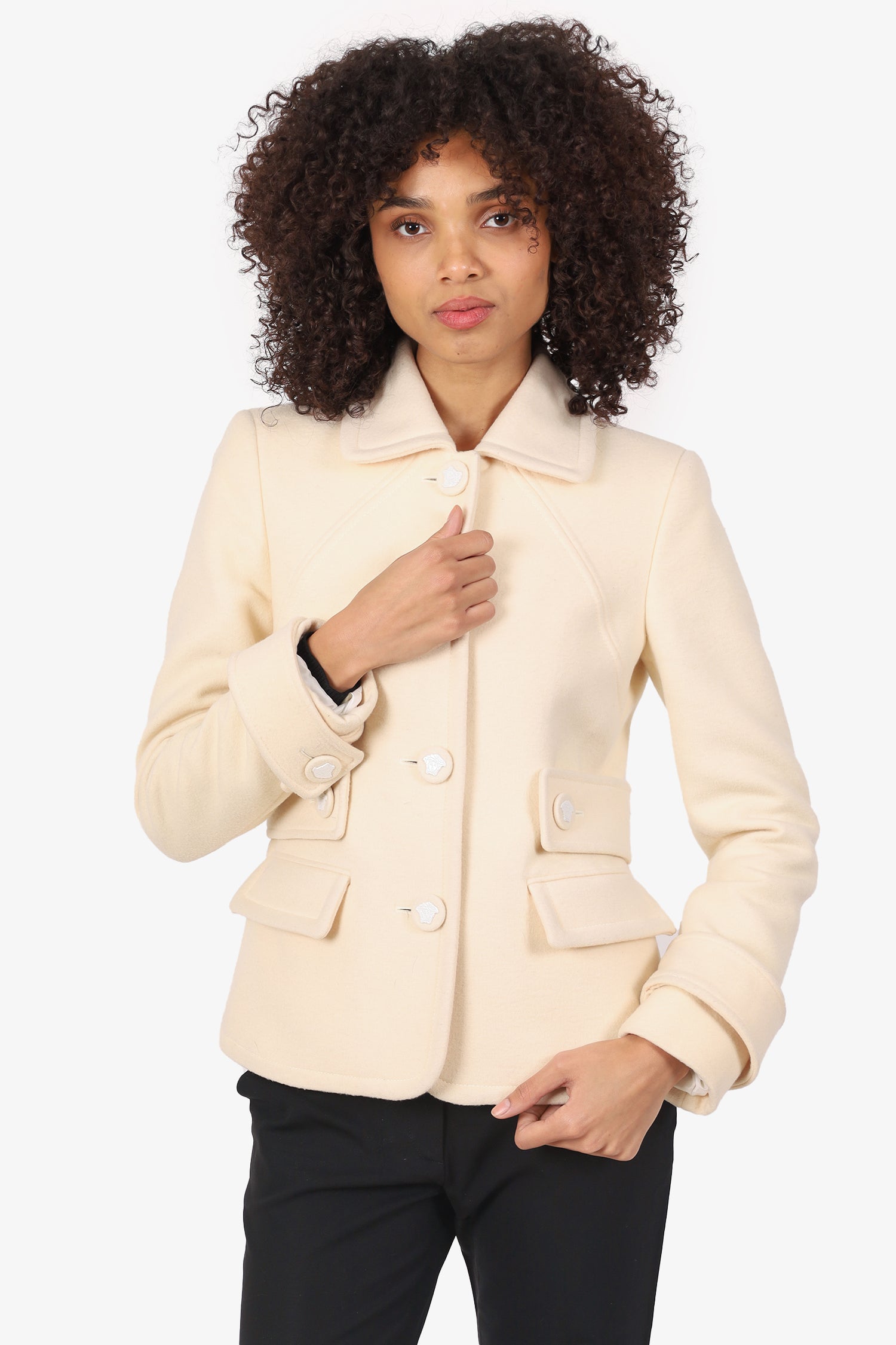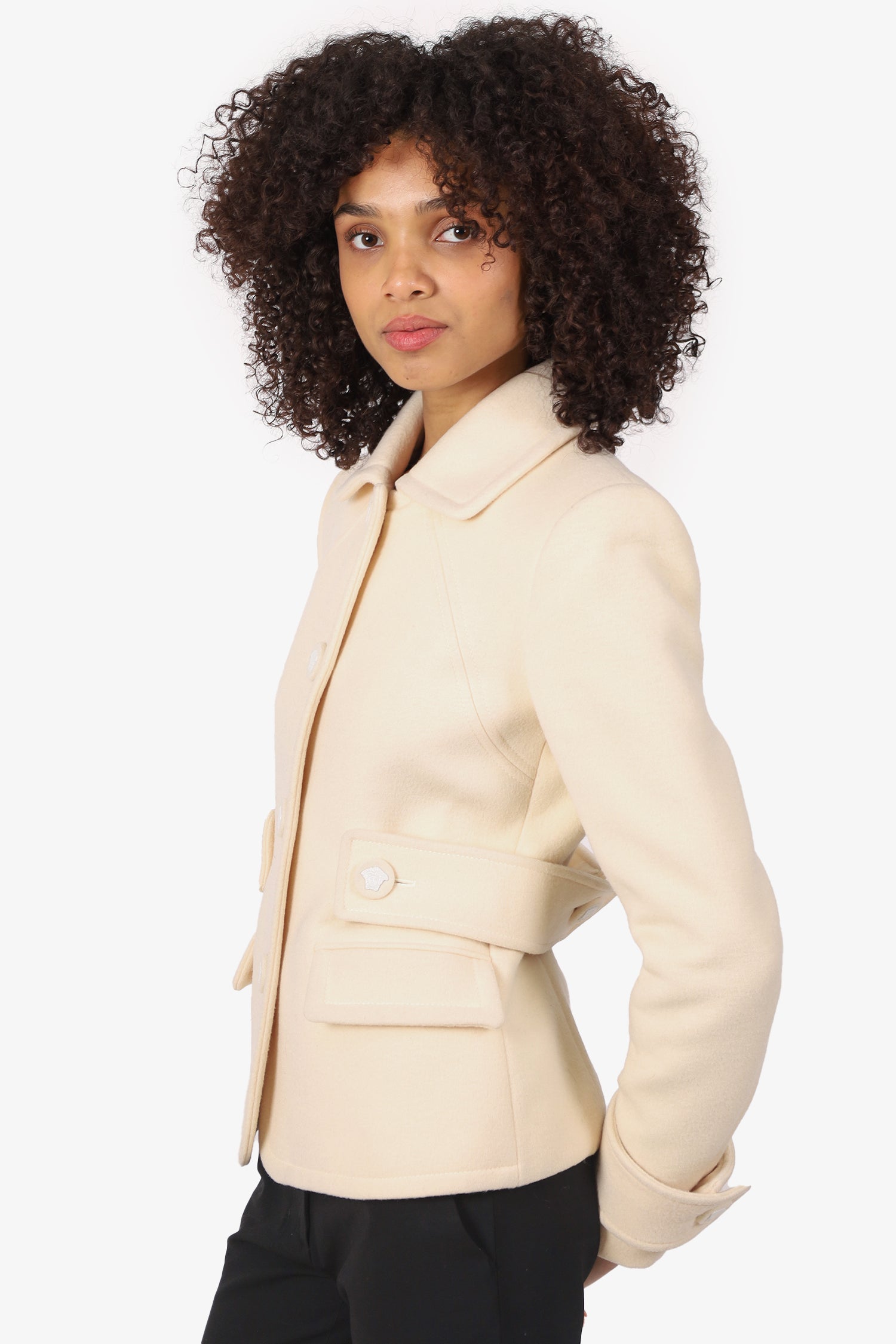Refresh availabilityVersace Cream Wool Coat. Pull-on. Collared neckline. Front button-up closure. 2 front exterior flap pockets. Lined interior. Tonal stitching. Gold-tone hardware.