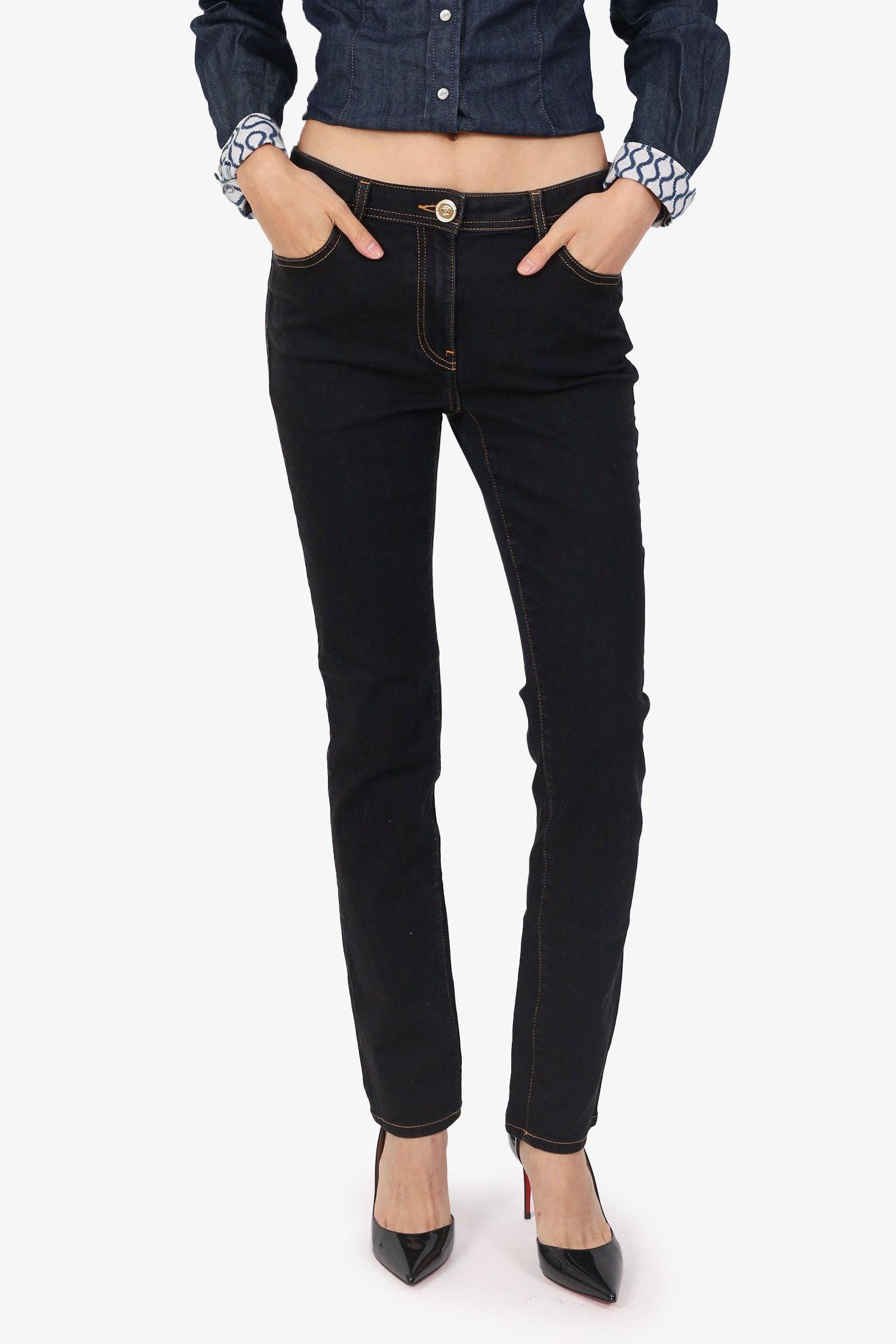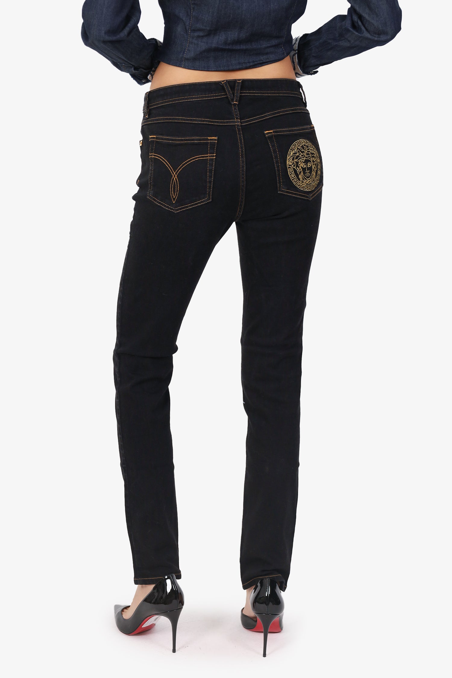 Refresh availabilityVersace Dark Denim Logo Back Pocket Straight Leg Jeans. Slip on. Front zip with button-up closure. Waistband belt loops. 5 exterior pockets; 2 front slip, 1 mini compartment, and 2 rear slip. Gold-tone hardware. Contrast stitching.