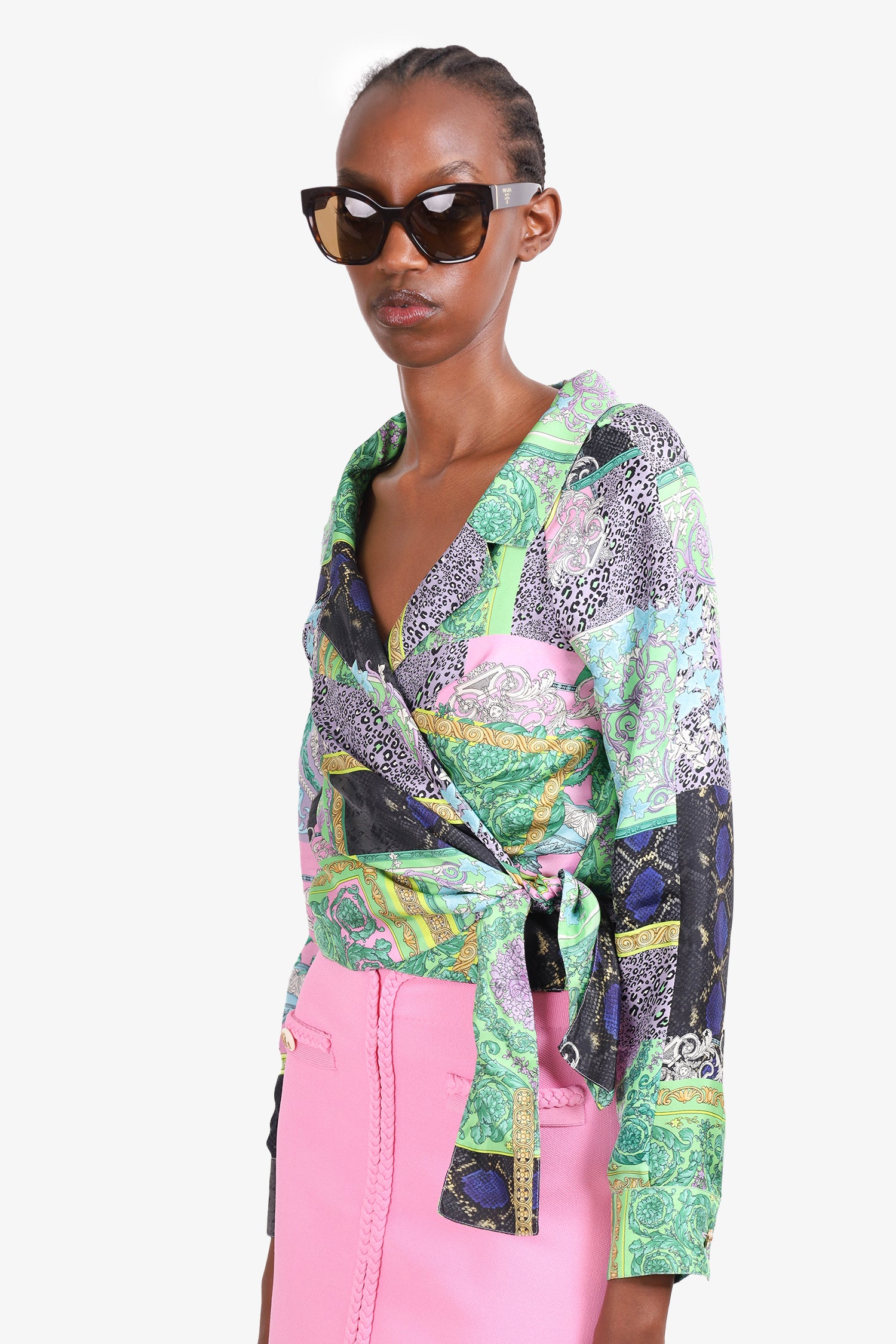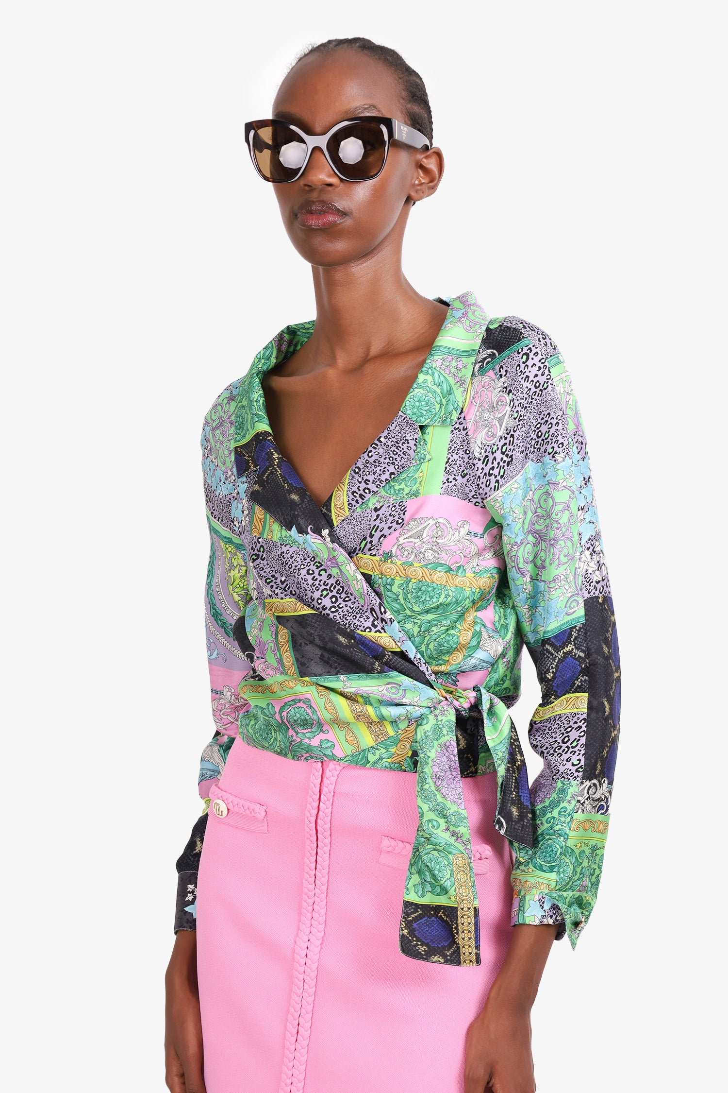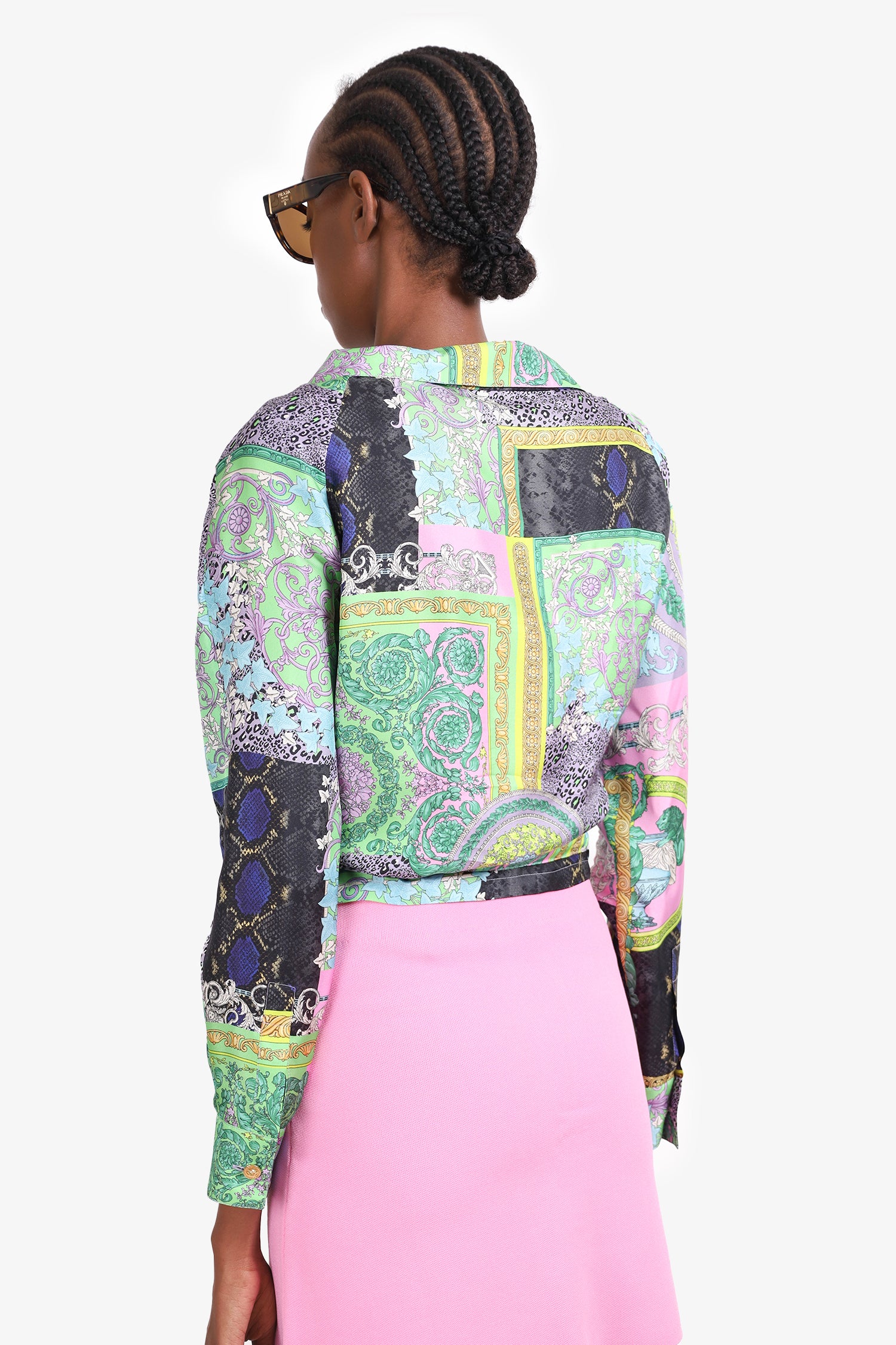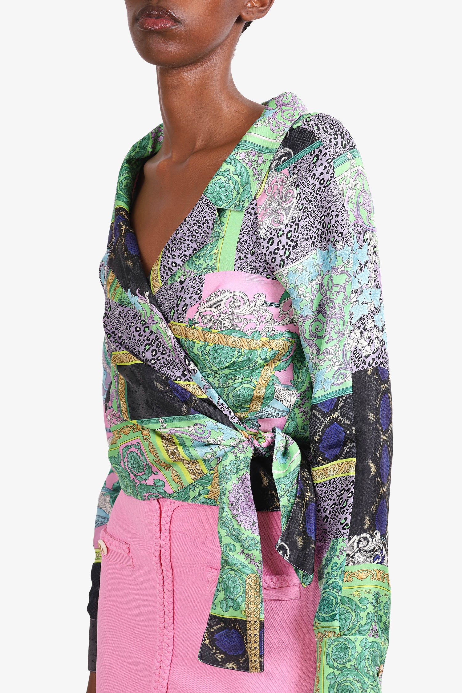 Refresh availabilityVersace Green/Multicolour Silk Barocco Patchwork Print Cropped Shirt. V-neck collar. Front tie closure. Cuff sleeves with button closures. Tonal stitching. Comes with hanger and garment bag.