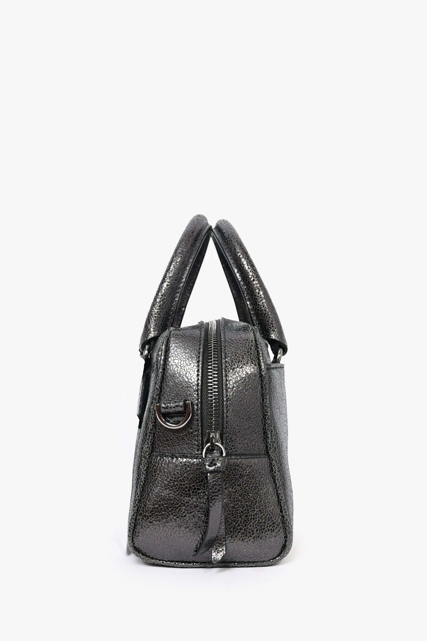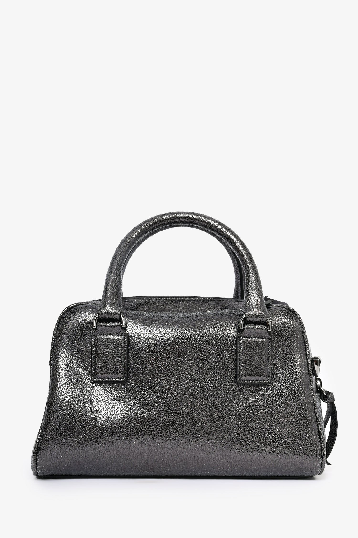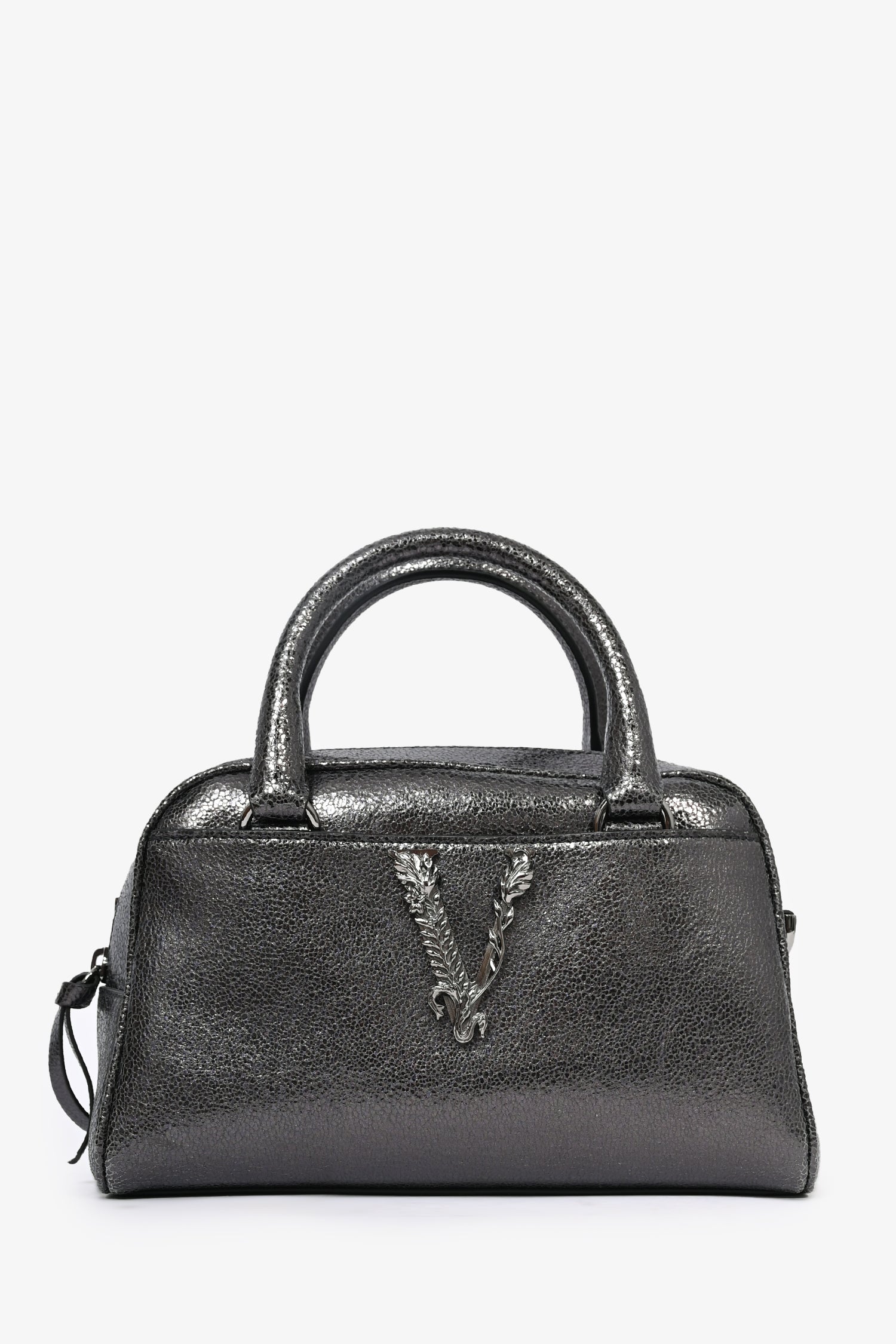 Refresh availabilityVersace Gunmetal Crackle Leather Small Virtus Bowling Bag with Strap. Dual top handles. Tonal topstitching. Top zipper with leather pull tab. Exterior compartment. Lined interior. 1 interior compartment. Silver-toned hardware. Comes with strap.