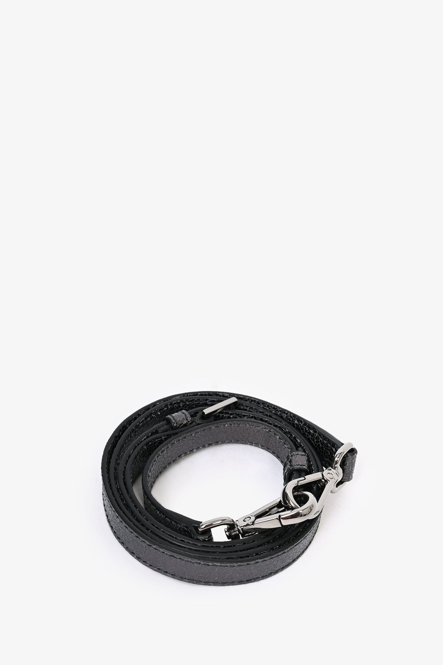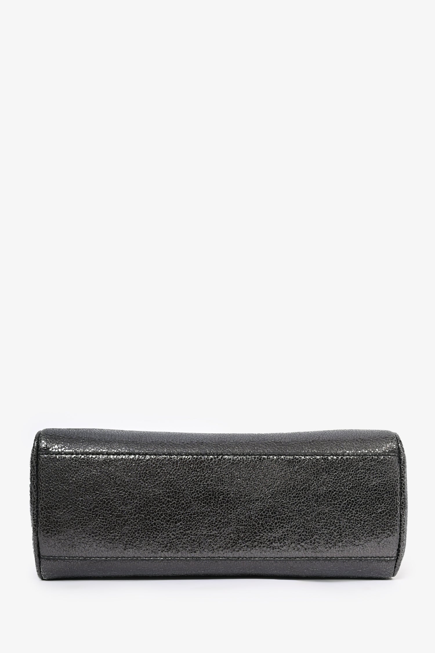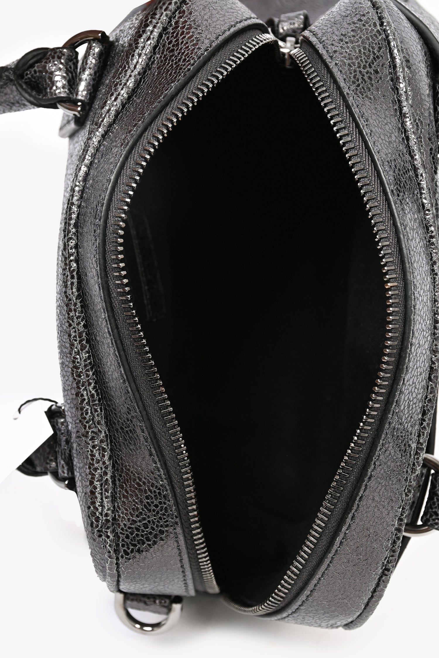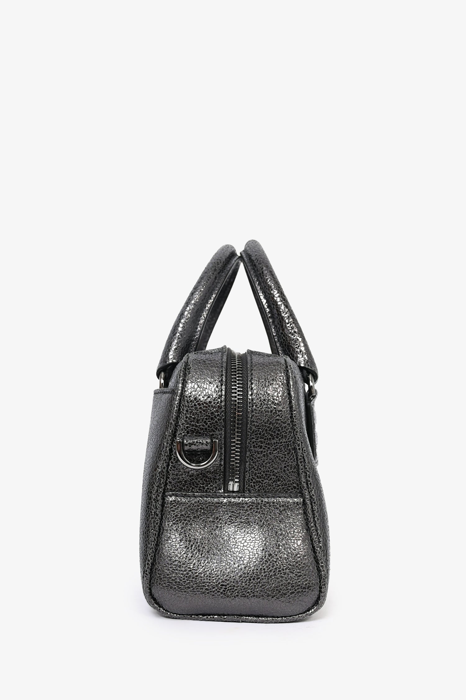 Refresh availabilityVersace Gunmetal Crackle Leather Small Virtus Bowling Bag with Strap. Dual top handles. Tonal topstitching. Top zipper with leather pull tab. Exterior compartment. Lined interior. 1 interior compartment. Silver-toned hardware. Comes with strap.