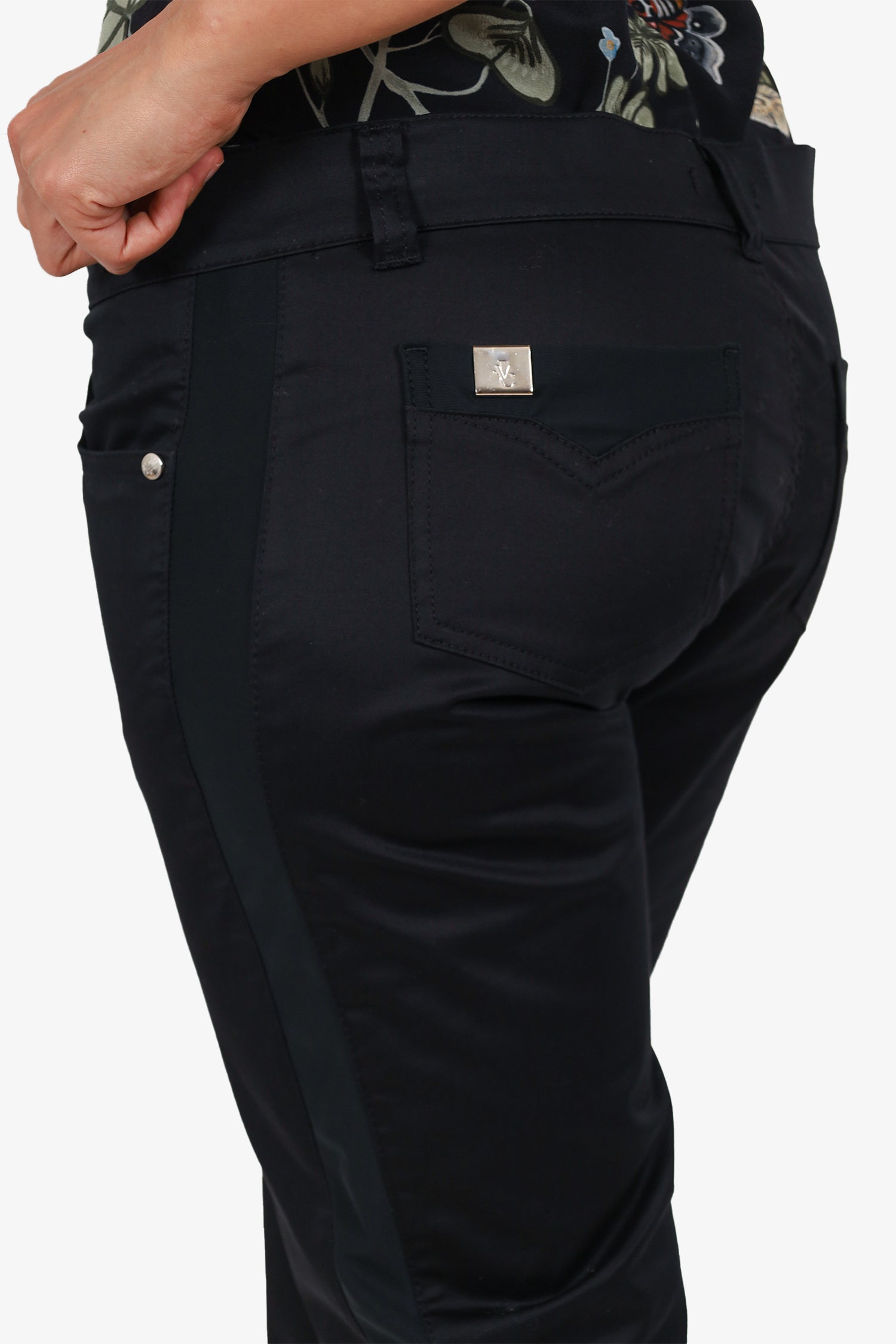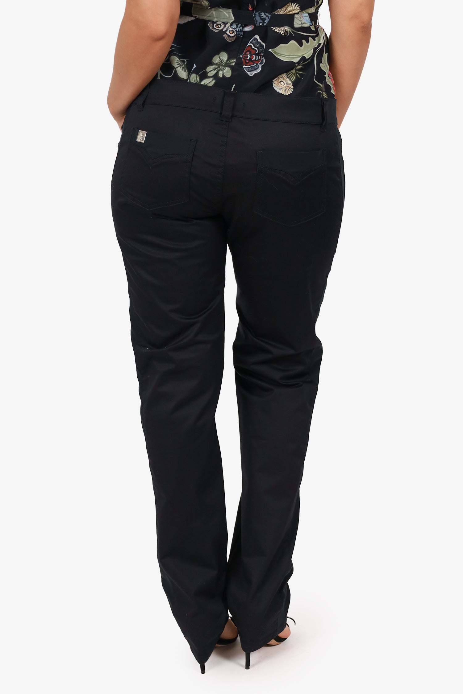Refresh availabilityVersace Jeans Couture Black Cotton Pants. Slip-on. Front zip with button closure. Waistband belt loops. 5 exterior pockets; 2 front side slip and 1 mini compartment, 2 rear slip. Silver-tone hardware. Tonal stitching.
