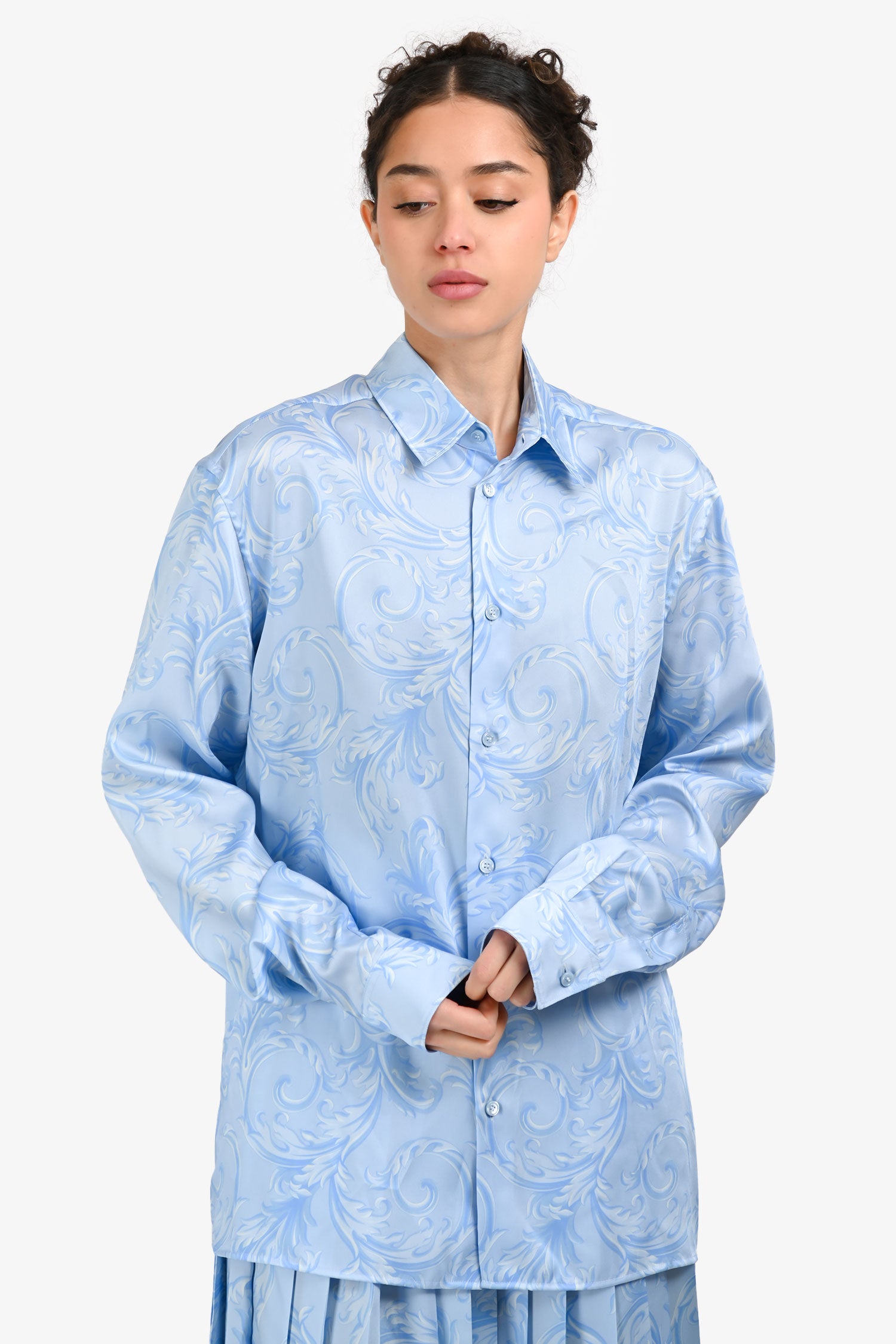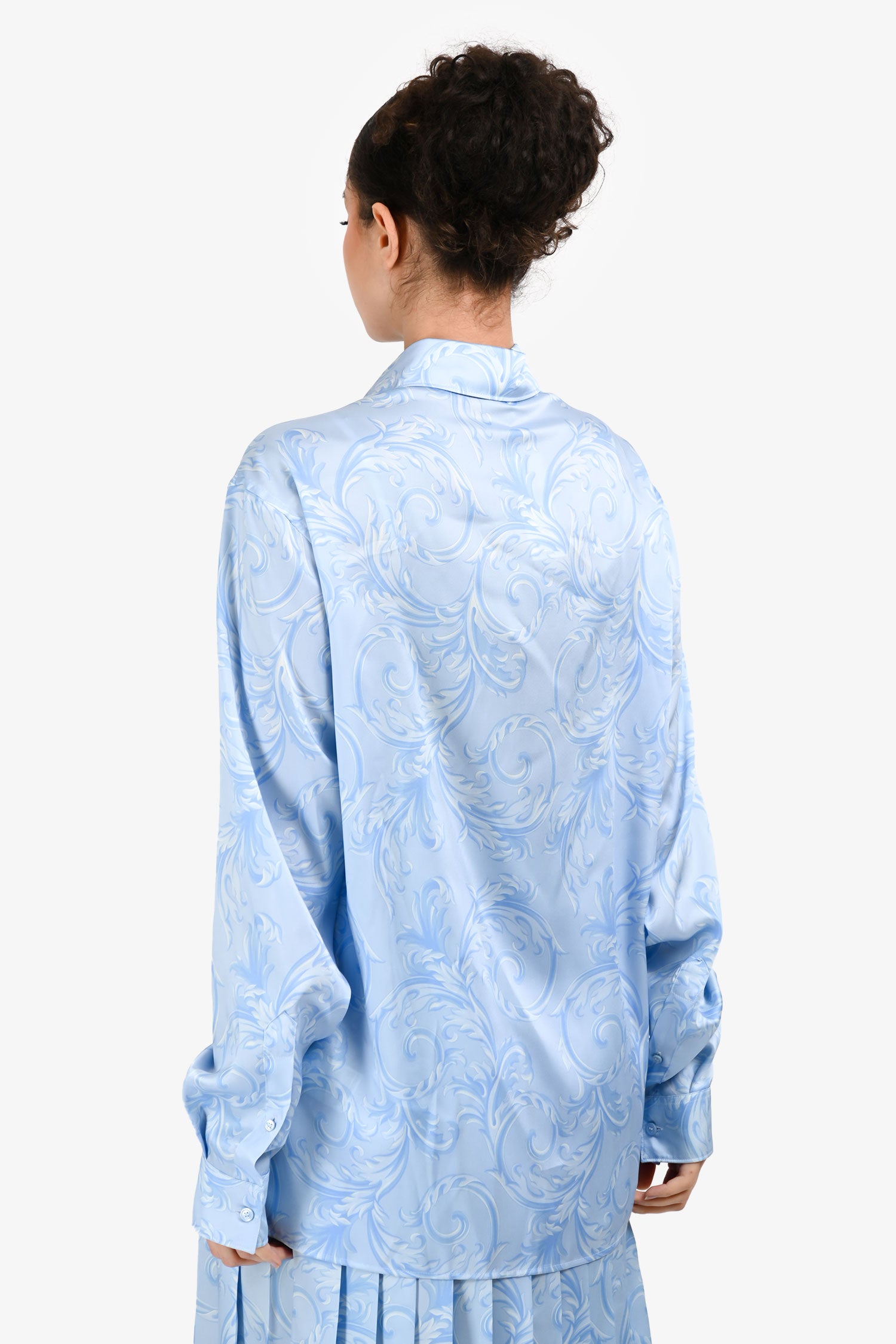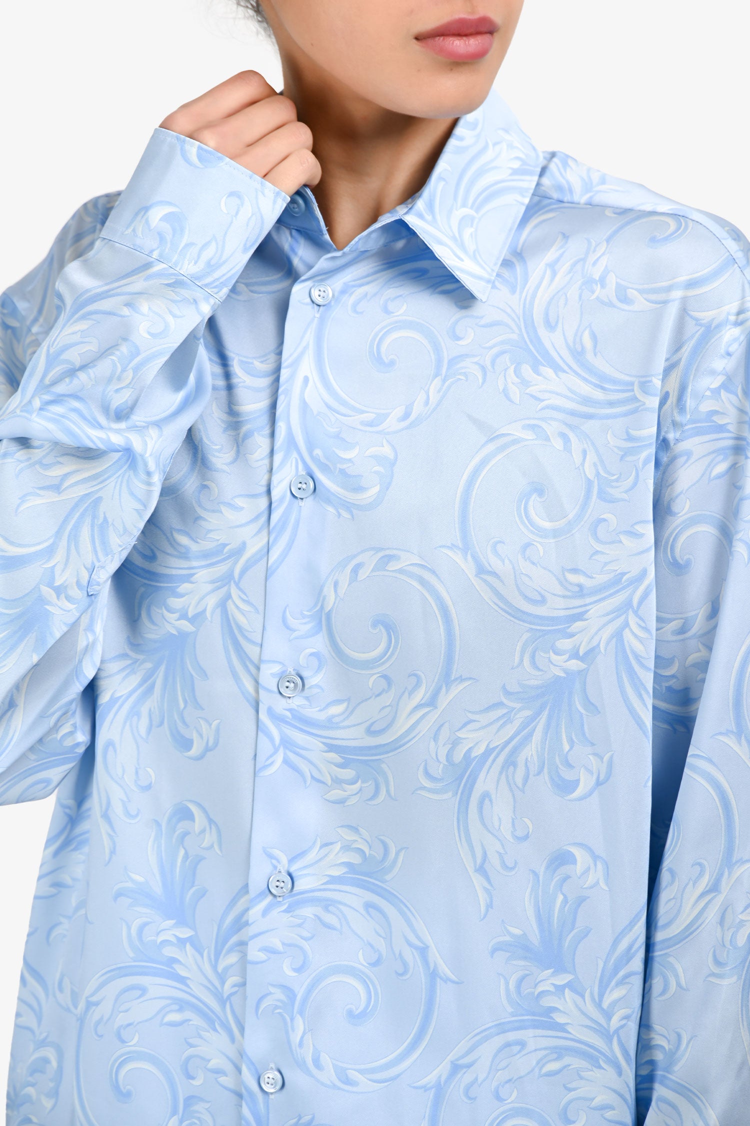 Refresh availabilityVersace Light Blue Satin Baroque Long Sleeve Button-Down Shirt. Point collar neckline. Front button-up closure. Cuffs with button-up closure. Tonal stitching.