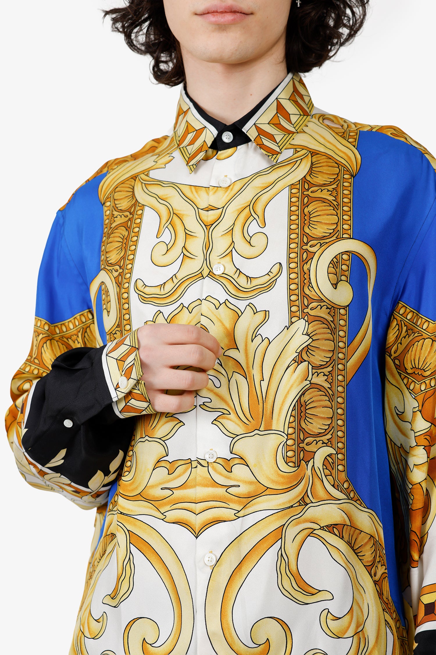 Refresh availabilityVersace Multicolour Silk Baroque Print Long Sleeve Button Down Shirt. Collared neckline. Front button-up closure. Sleeve cuffs with button-up closure. Tonal stitching.