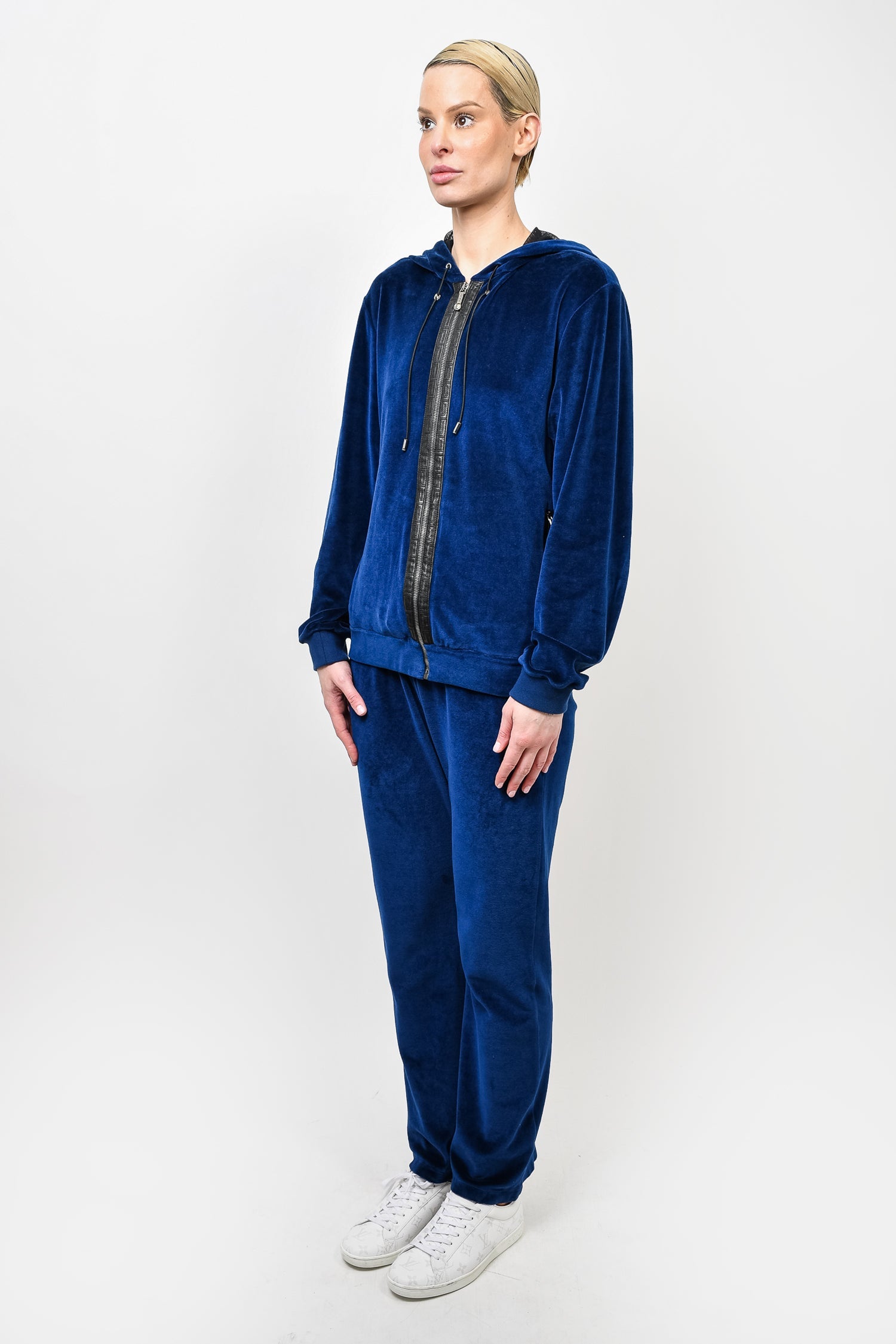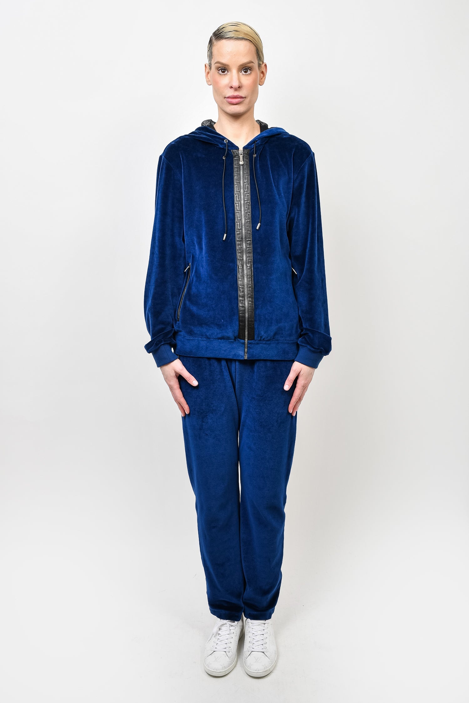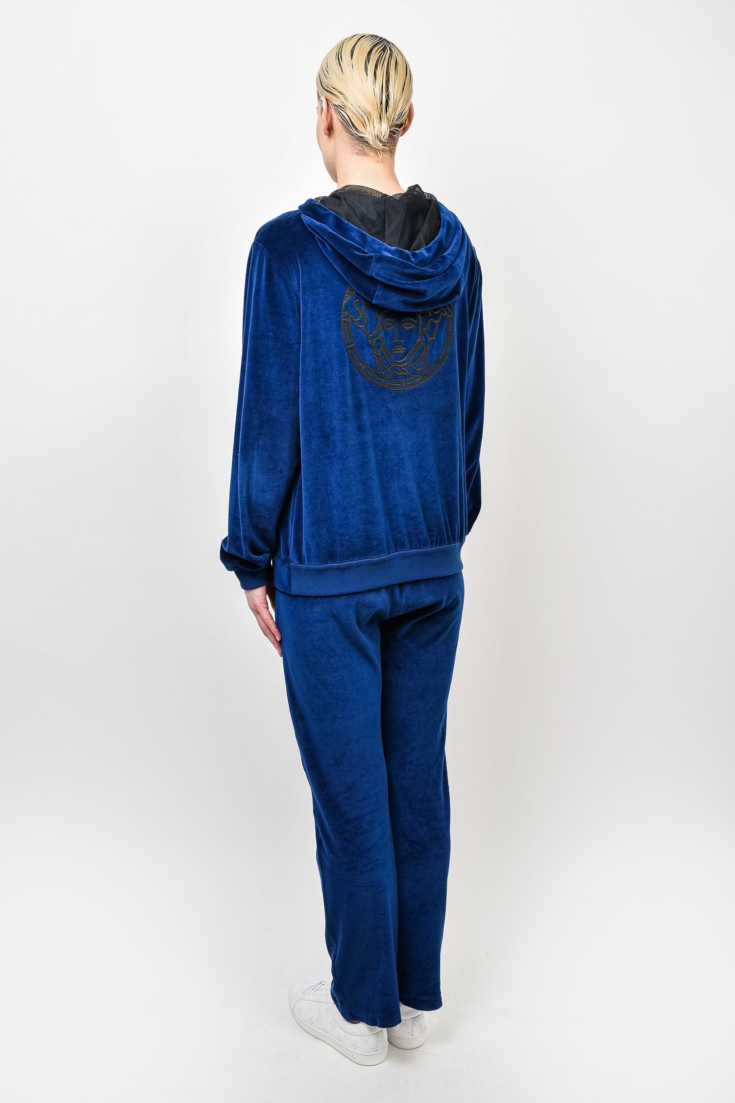 Refresh availabilityVersace Navy Blue Velour Leather Medusa Track Suit Set. Top: Full front zip closure. 2 zippered hand pockets. Leather trim details. Bottoms: Drawstring adjustable elasticized waistband. 2 pockets with zip closures. Tonal stitching.