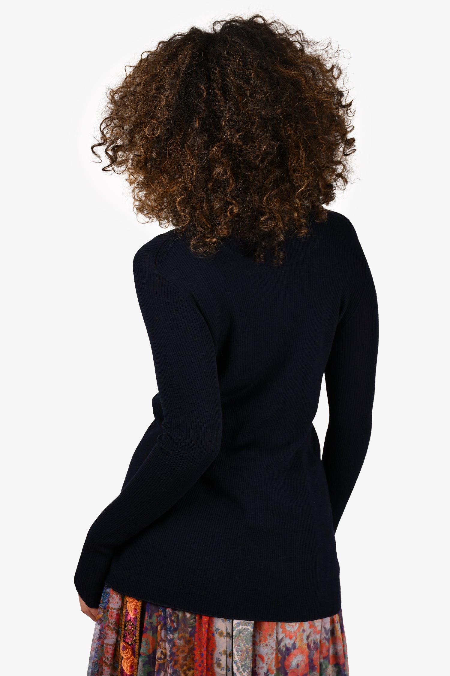 Refresh availabilityVersace Navy Blue Wool Ribbed Gold Button Down Cardigan. Front button-up closure. V-neck. Tonal stitching.