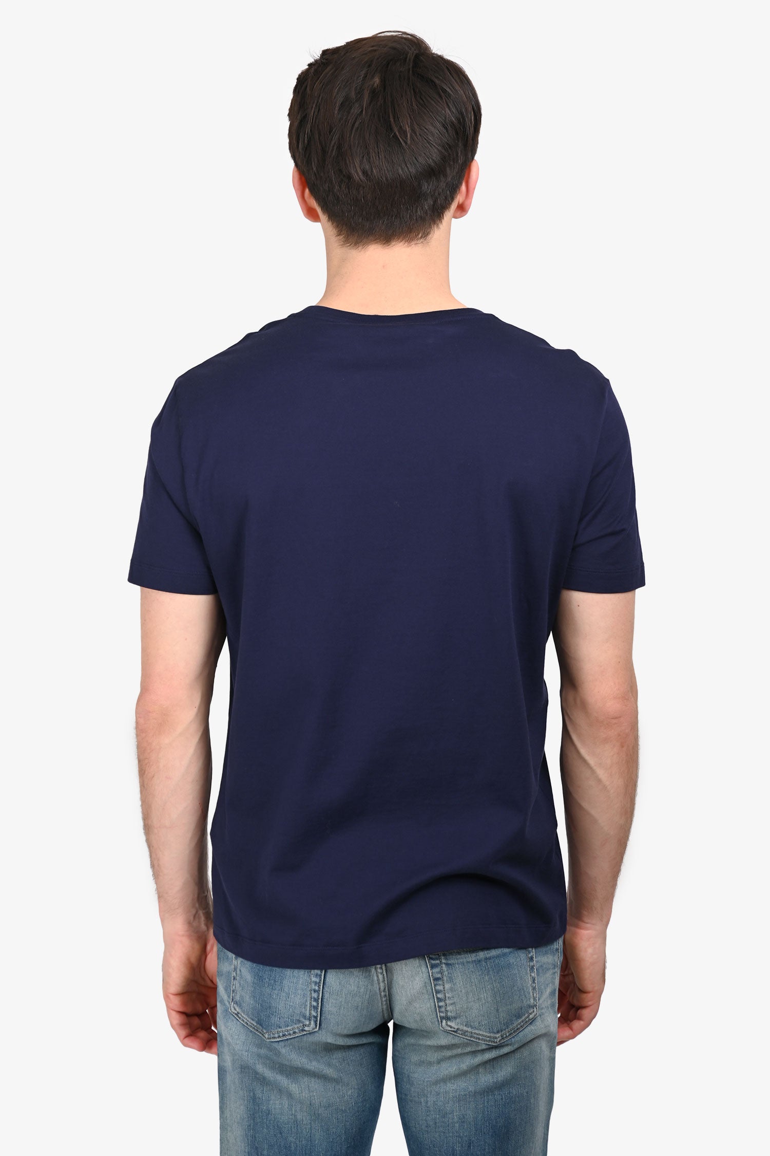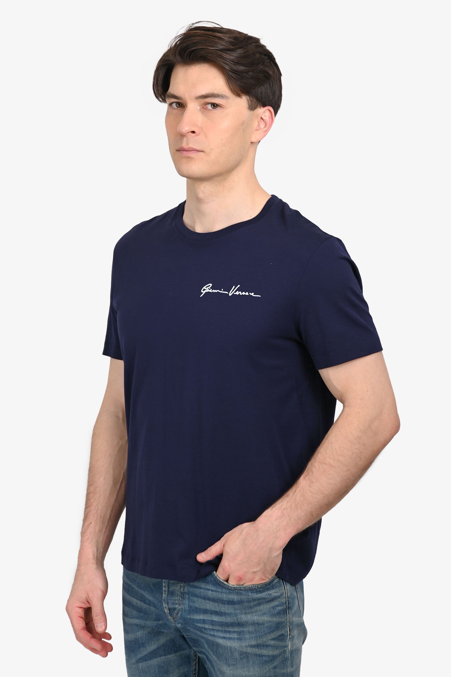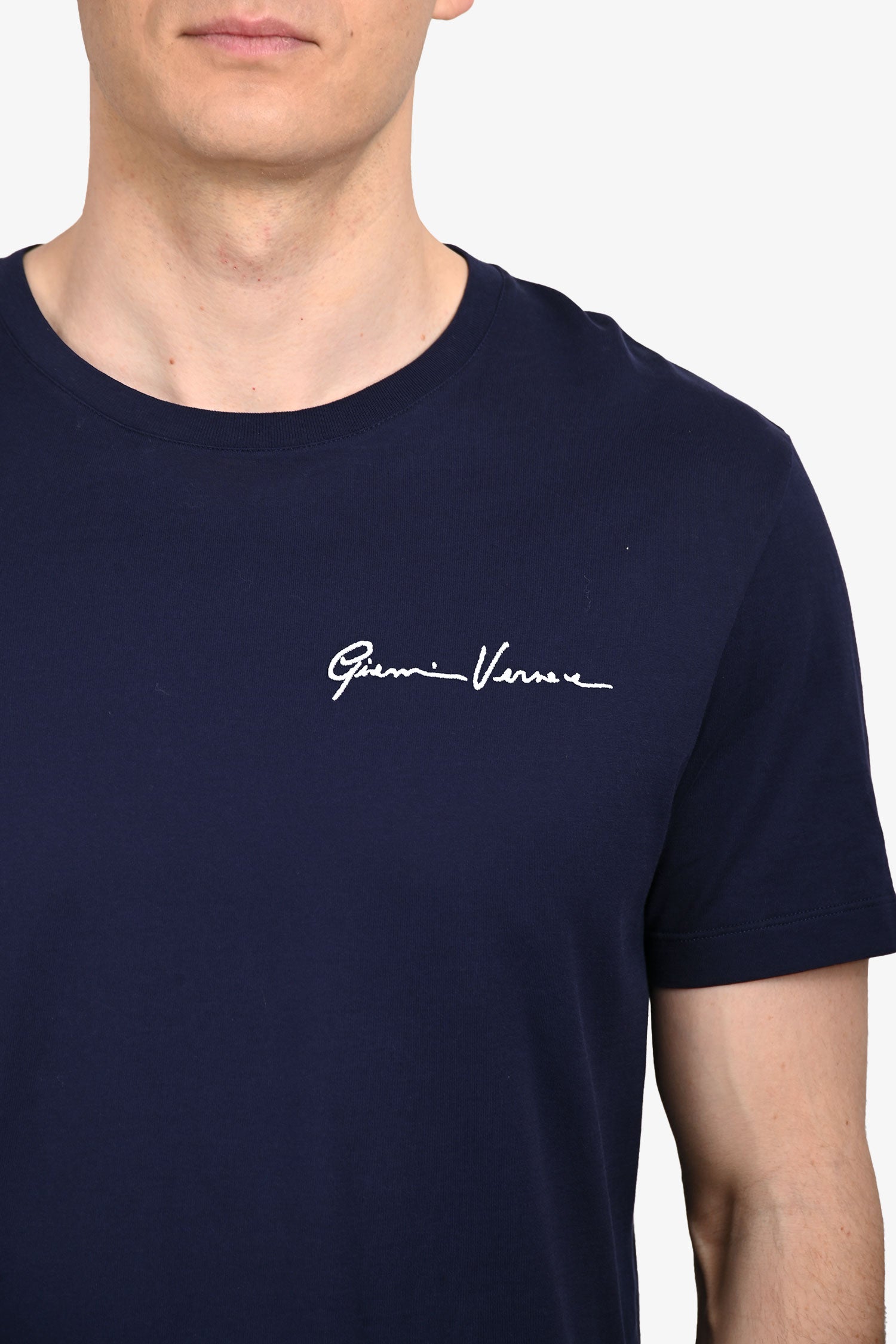 Refresh availabilityVersace Navy White Cursive Logo T-Shirt. Round and ribbed neckline. Tonal stitching.