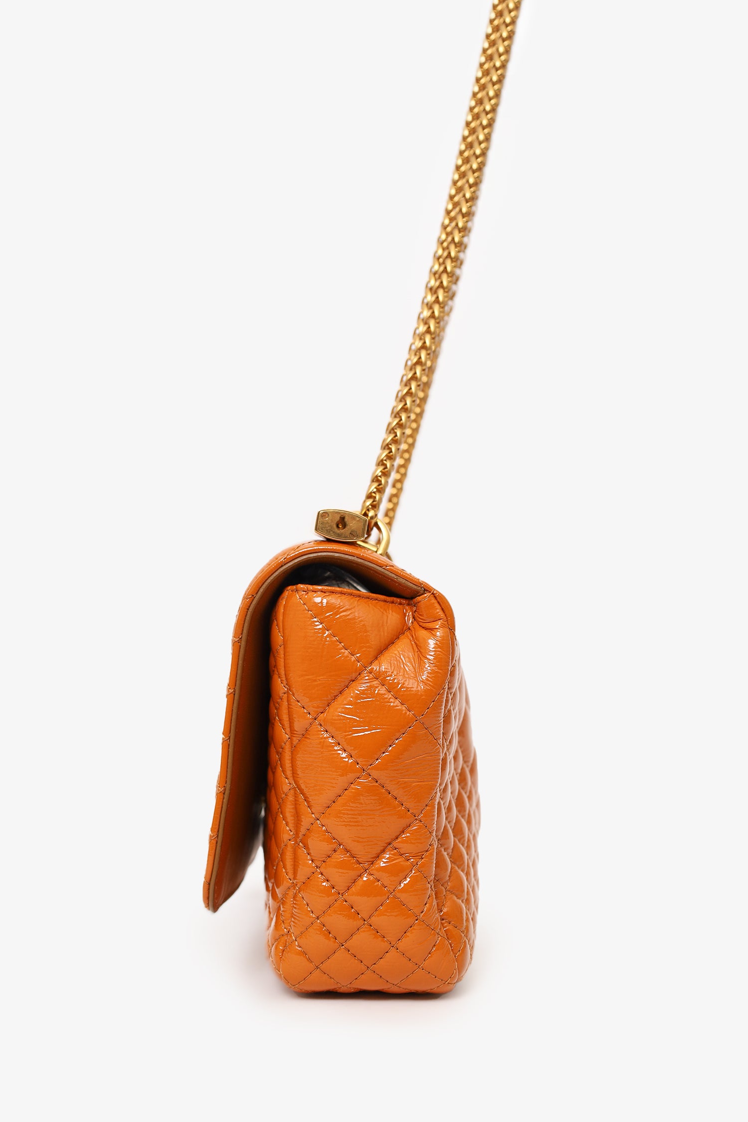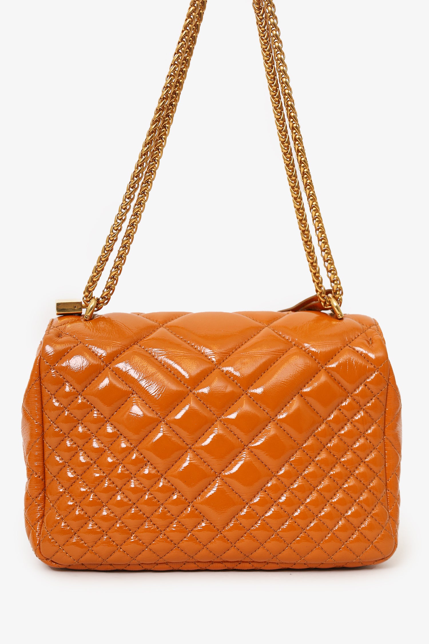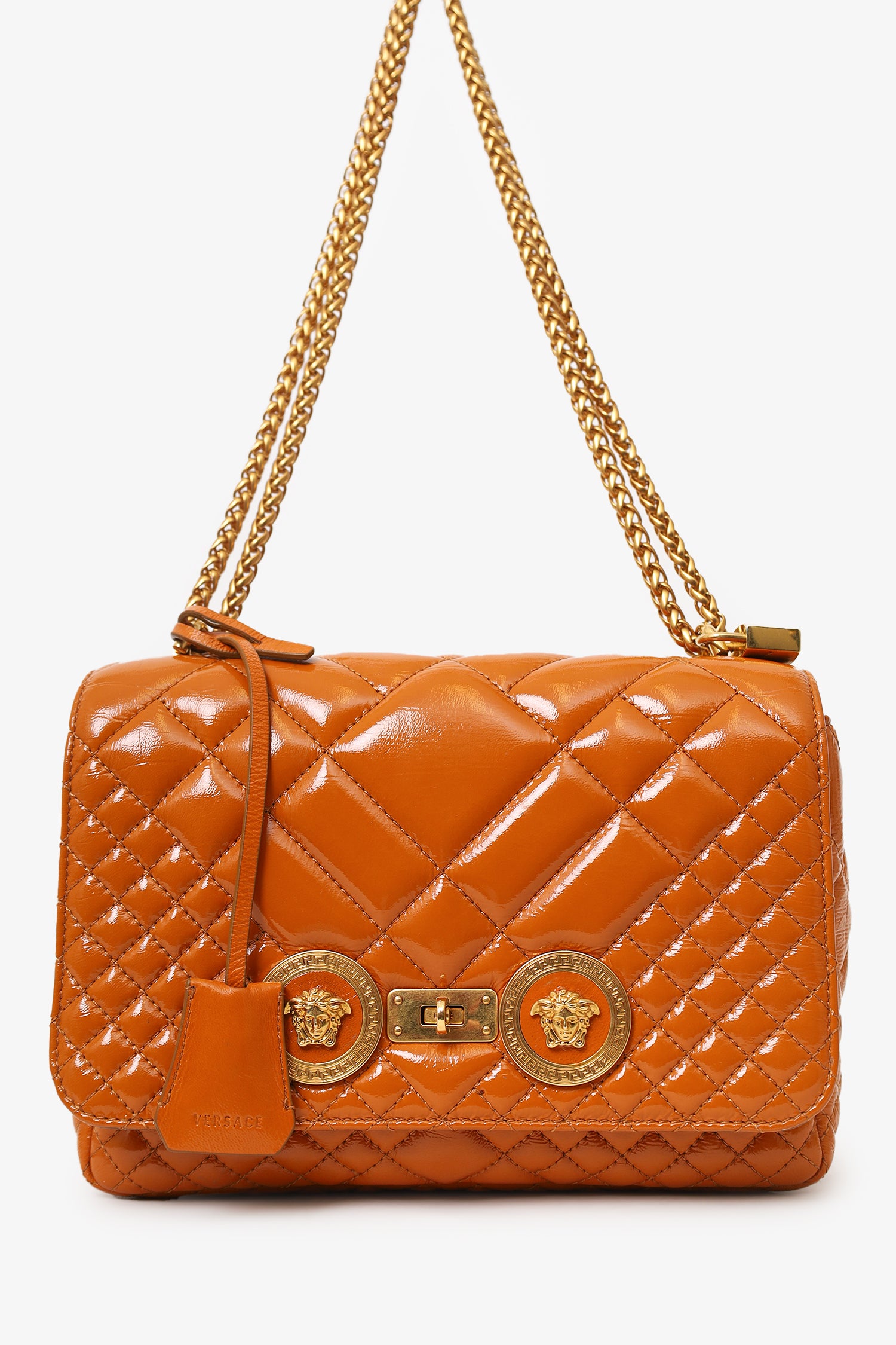 Versace Orange Quilted Patent Leather Medusa Medium Shoulder Bag. Front fold-over flap with turn-lock closure. Twin chainlink straps that can be pulled into one long strap. Lined interior. 2 interior slip pockets. Includes removable clochette (keys and lock). Gold-tone hardware. Tonal stitching.