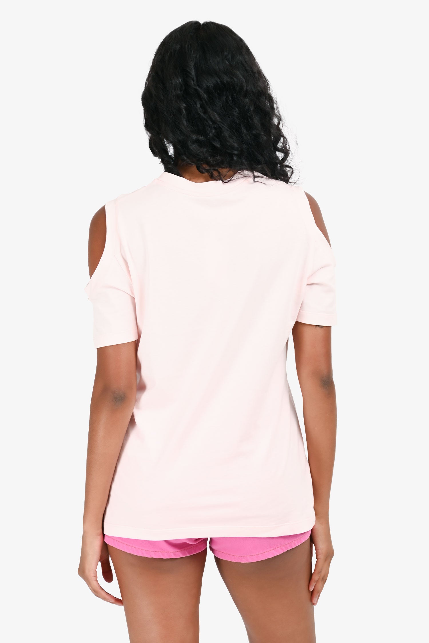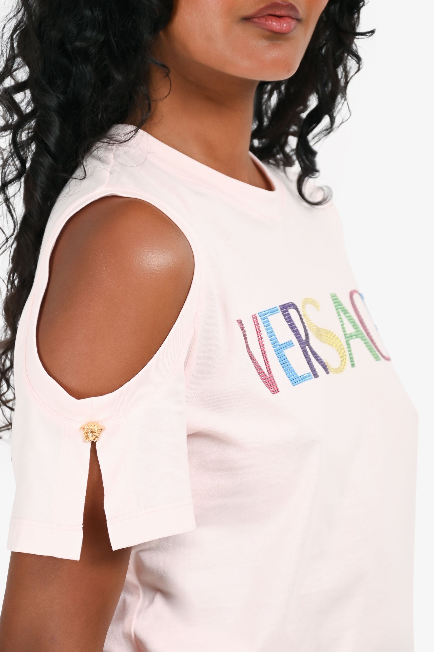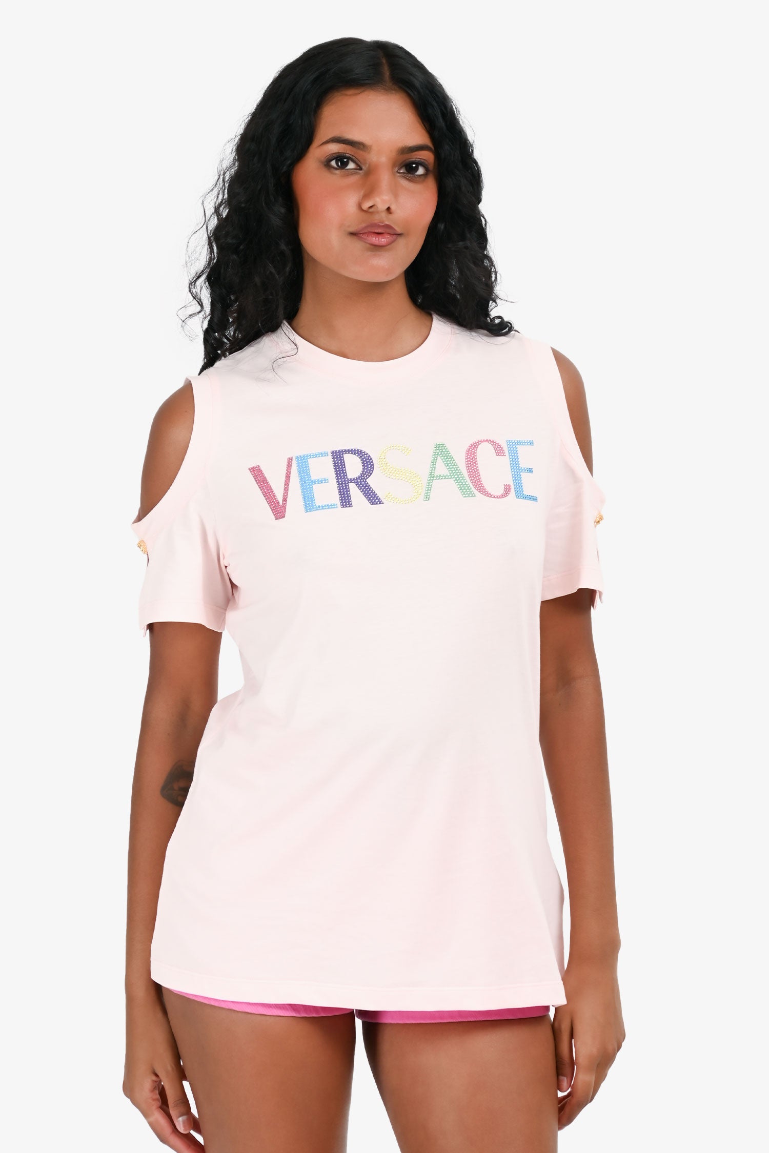 Refresh availabilityVersace Pink Cut-Out Crystal Logo Shirt. Crew neckline. Short sleeves. Cut-out detail at shoulders. Tonal stitching.