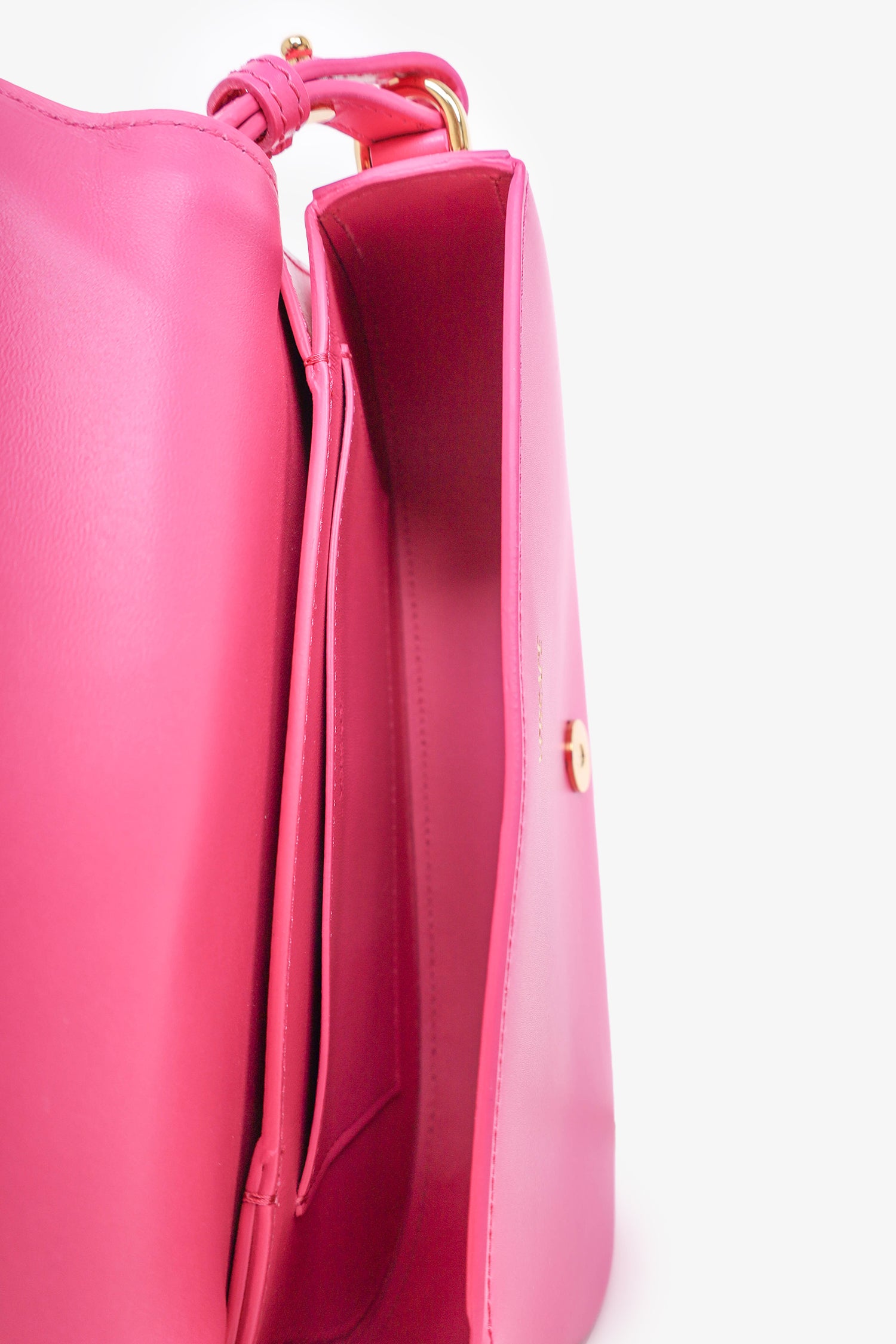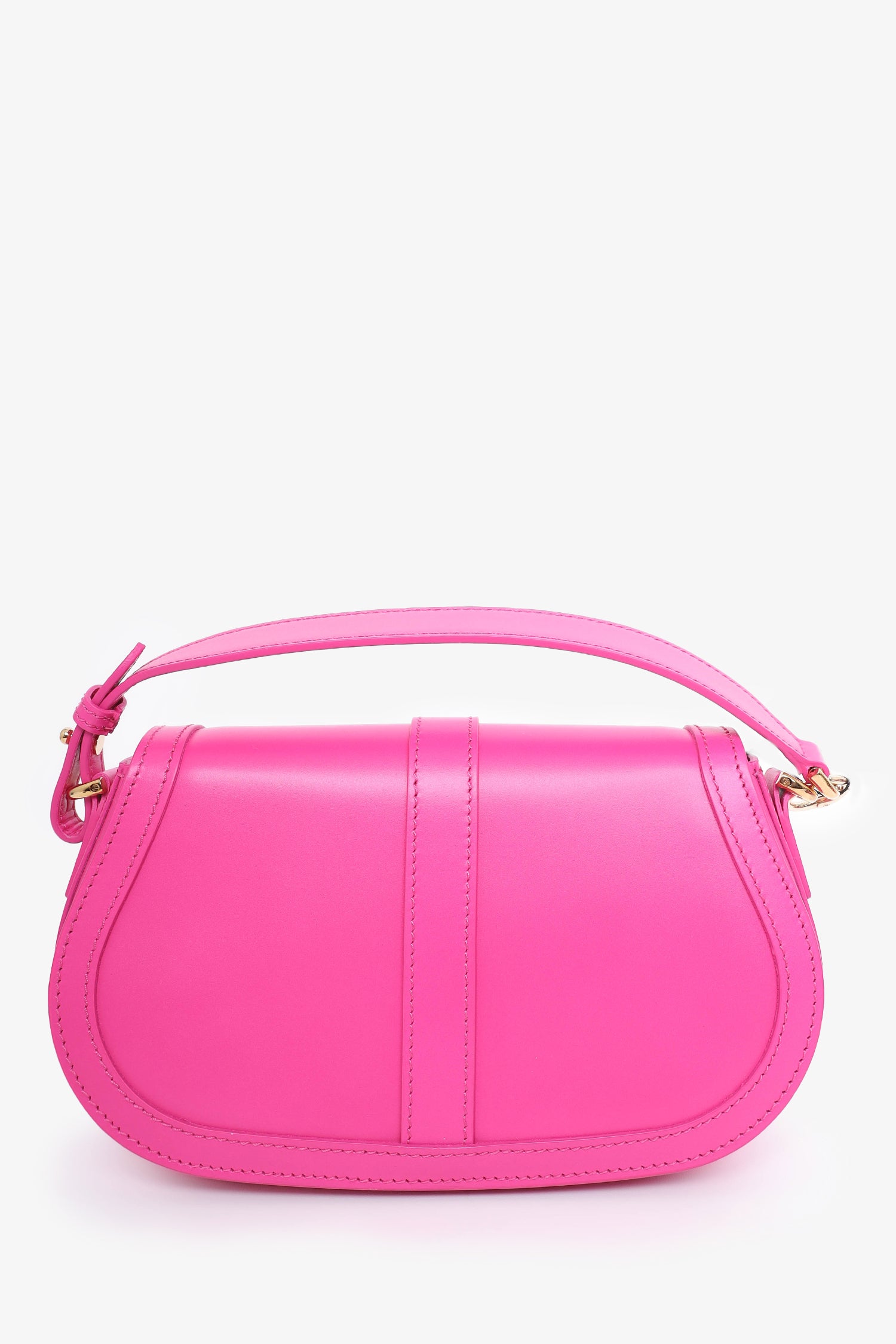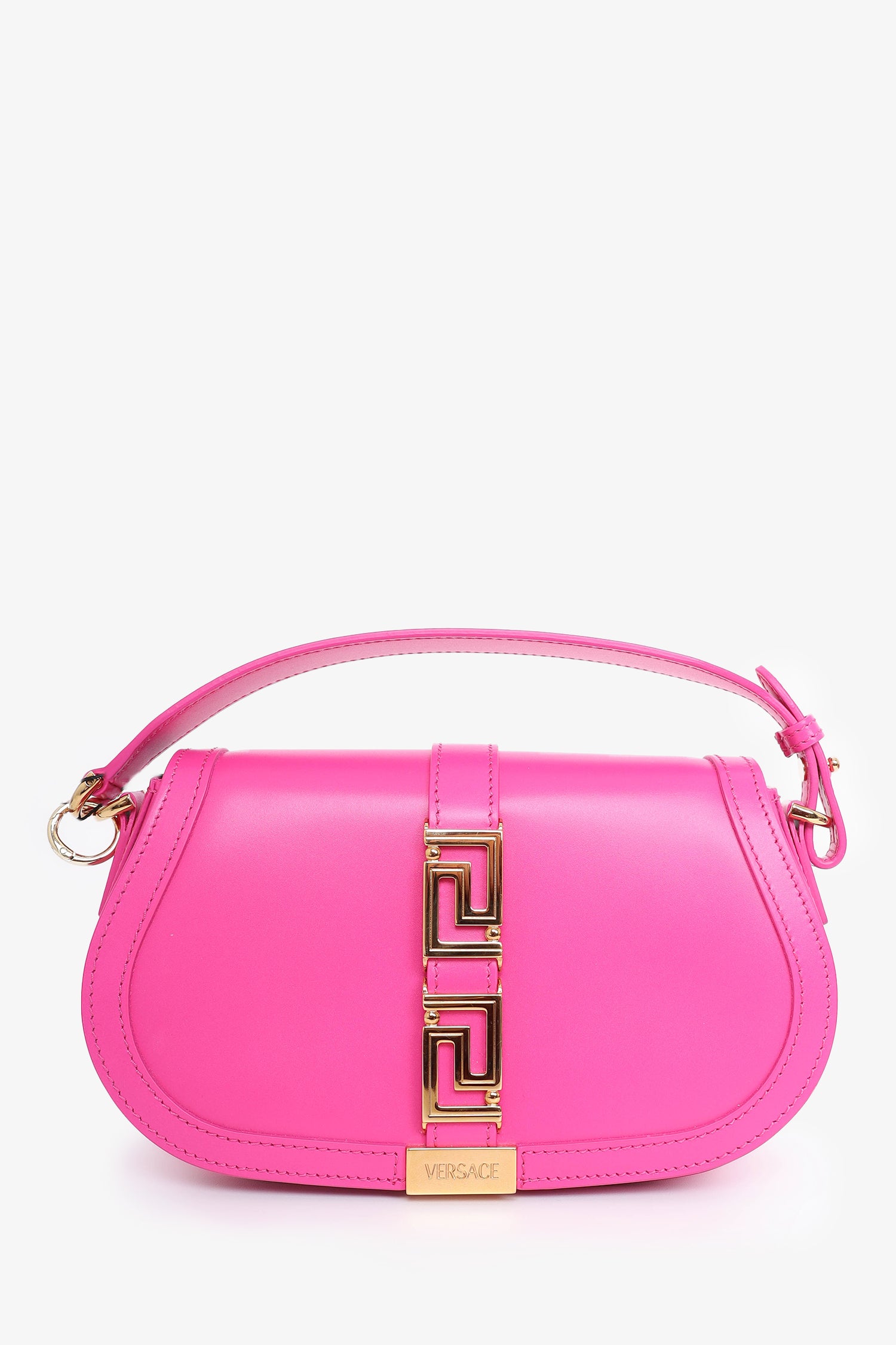 Refresh availabilityVersace Pink Leather Greca Goddess Shoulder Bag With Strap. Removable top handle. Front fold-over flap with magnetic button closure. Open leather interior. Single interior wall slip pocket. Back interior wall slip pouch. Removable crossbody strap and shoulder strap. Tonal stitching. Gold-tone hardware.