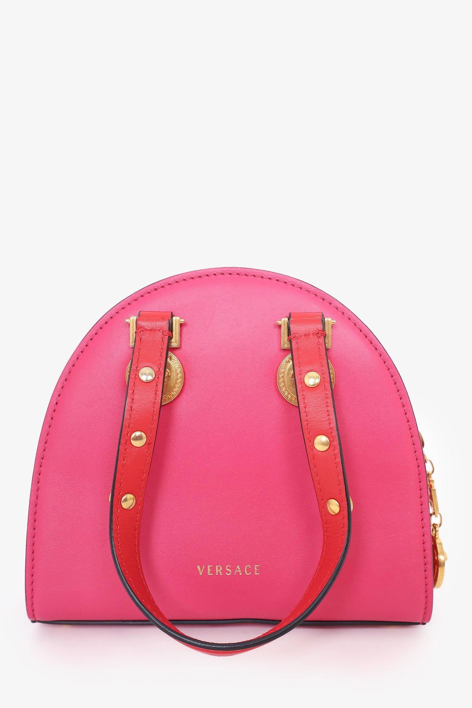 Refresh availabilityVersace Pink/Red Leather Tribute Medallion Bag with Strap. Top zip closure. Open leather interior with single wall slip pocket. Adjustable/removable crossbody strap. Protective studs on bottom. Gold-tone hardware. Tonal stitching.