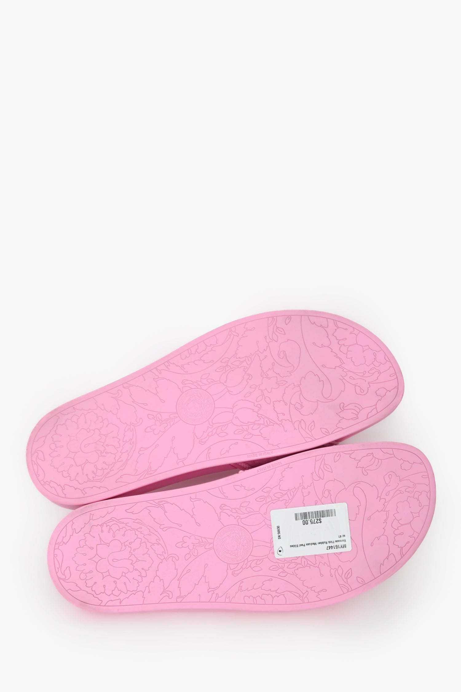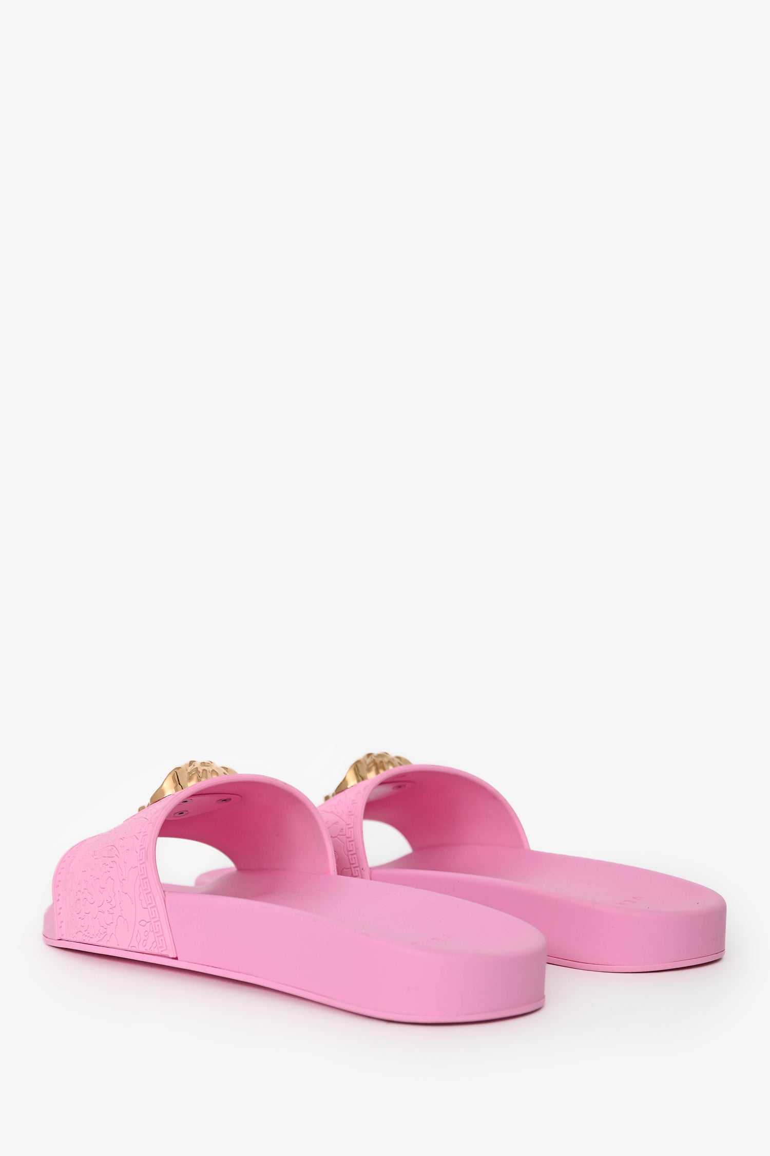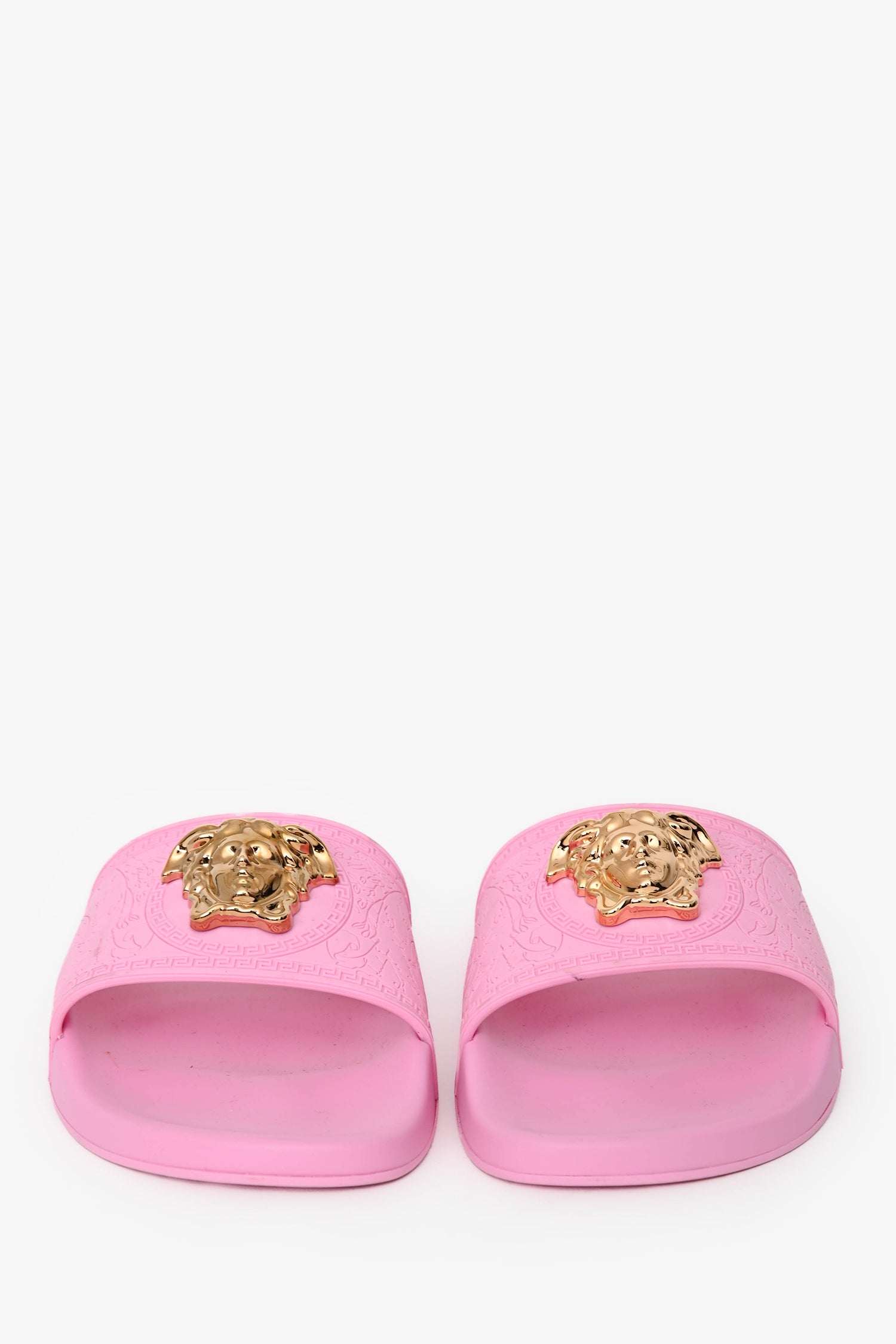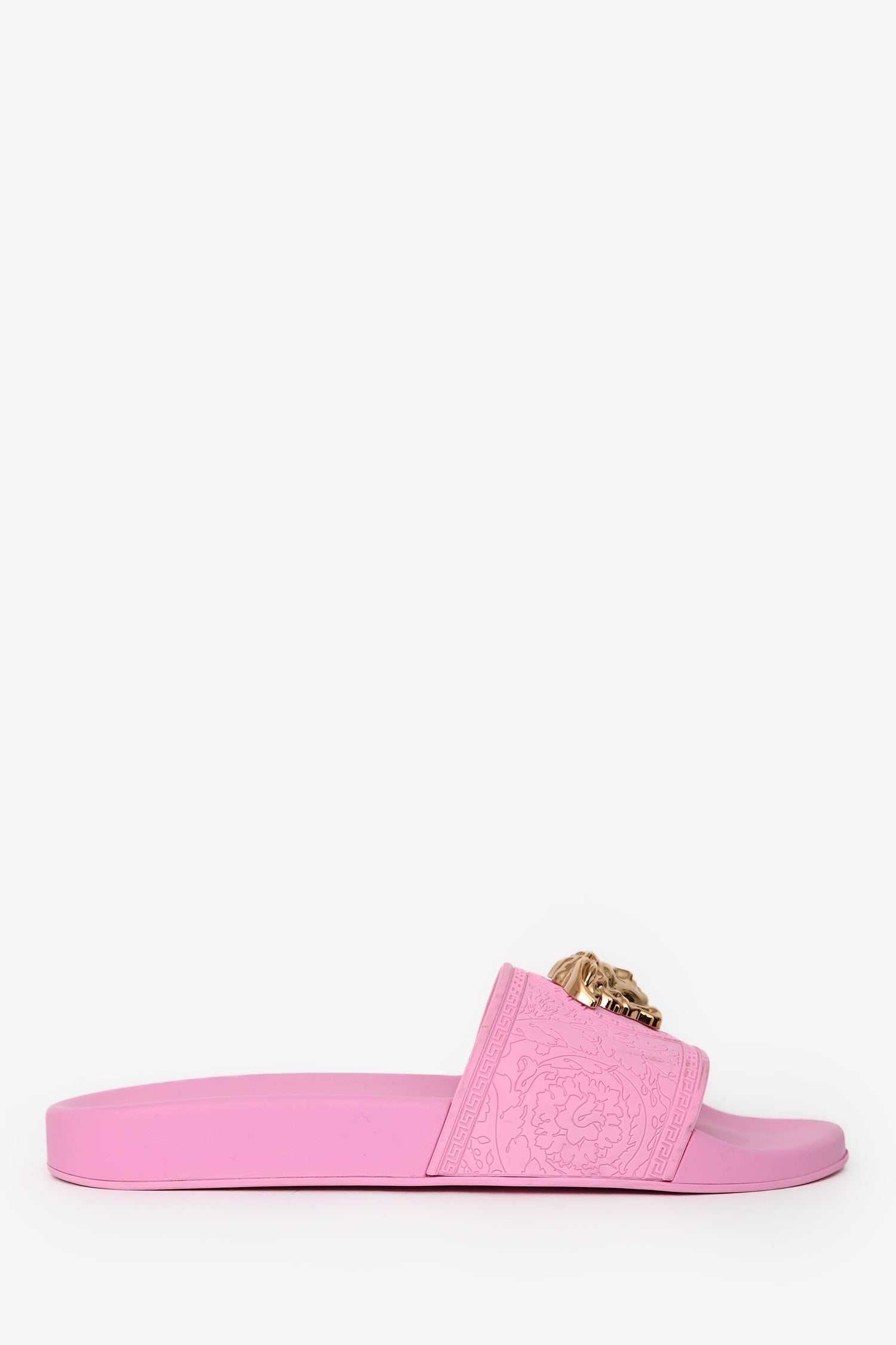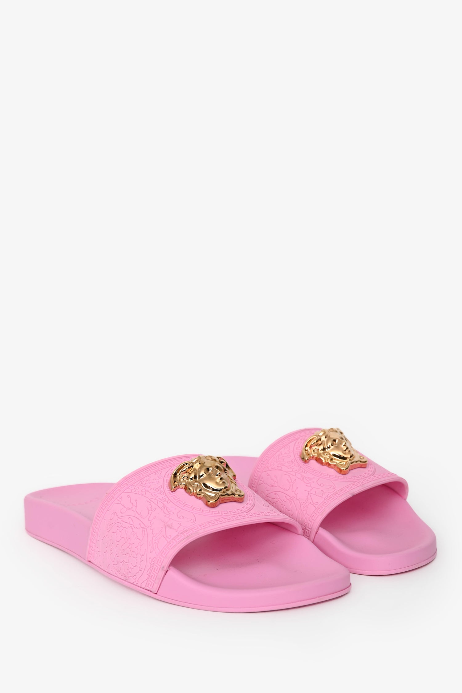 Refresh availabilityVersace Pink Rubber Medusa Pool Slides. Rounded, open toe. Rubber soles and vamp. Gold-tone hardware.