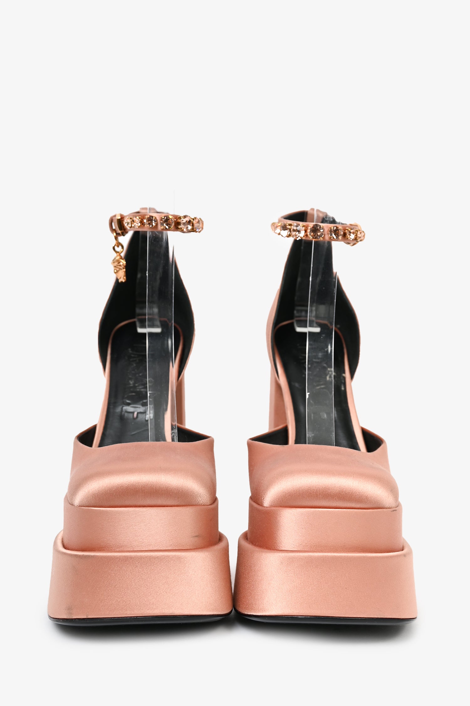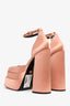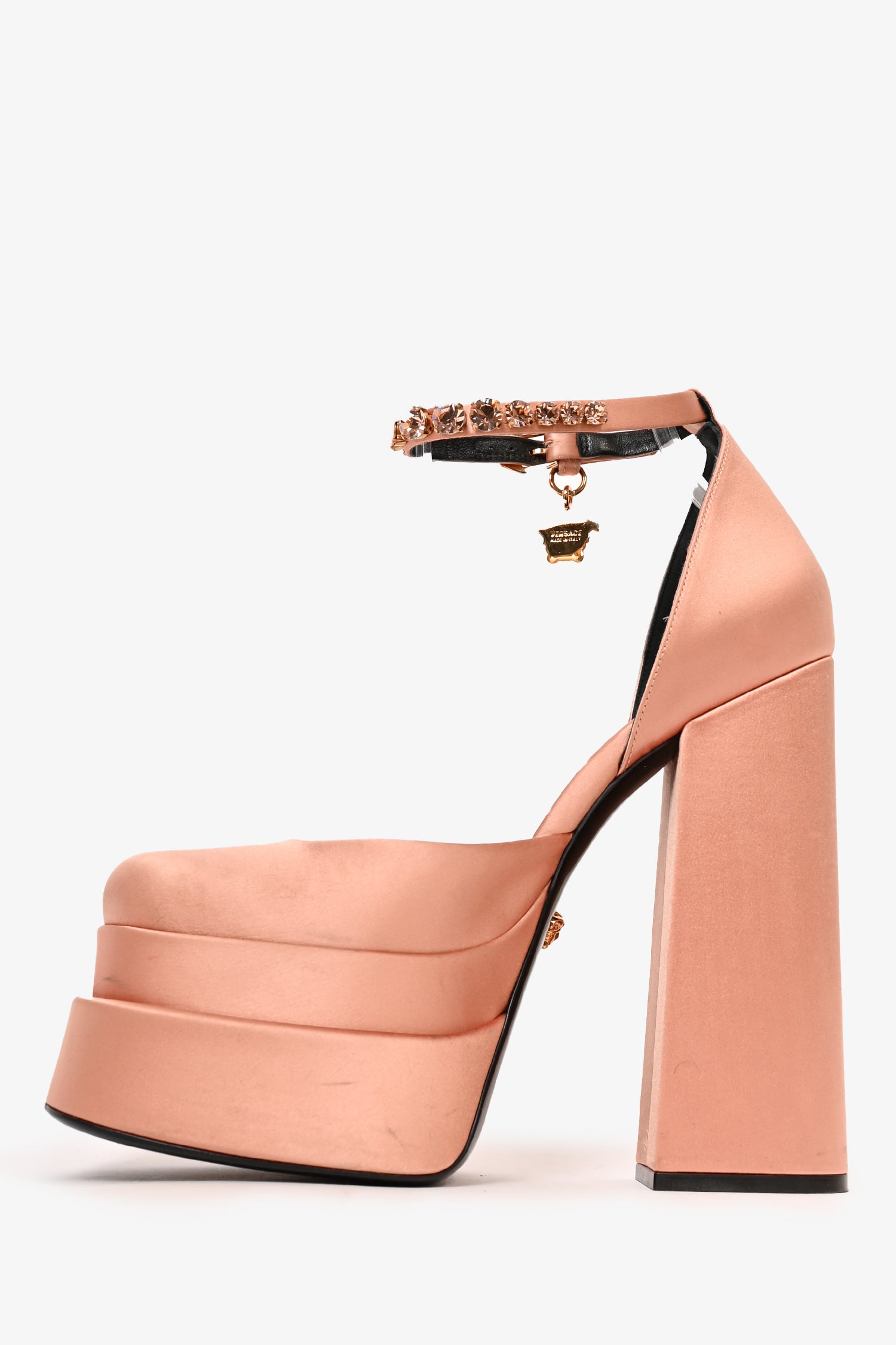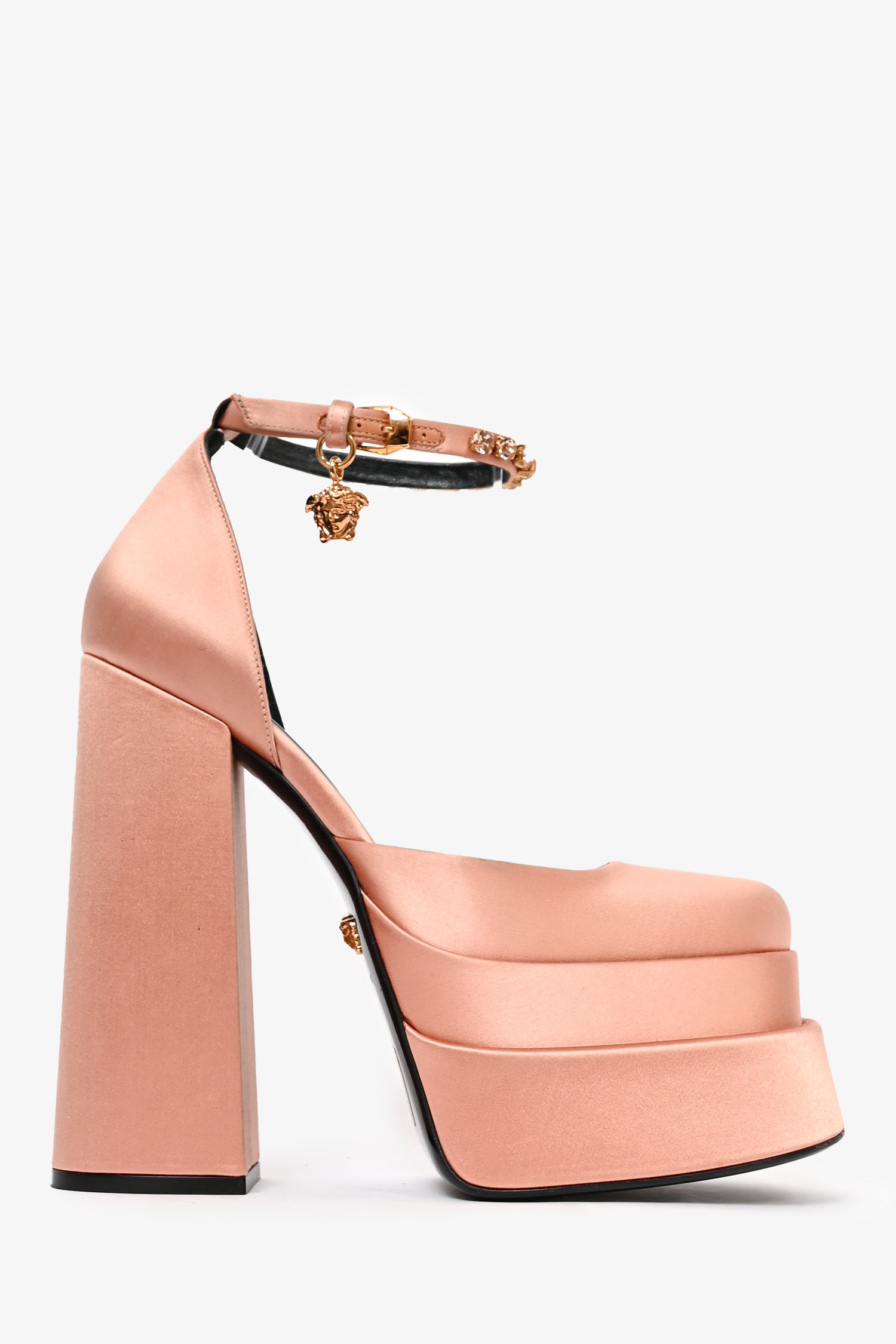 Refresh availabilityVersace Pink Satin Medusa Aevitas Platform Heels. Square toe. Ankle strap with buckle closure. Block heel.