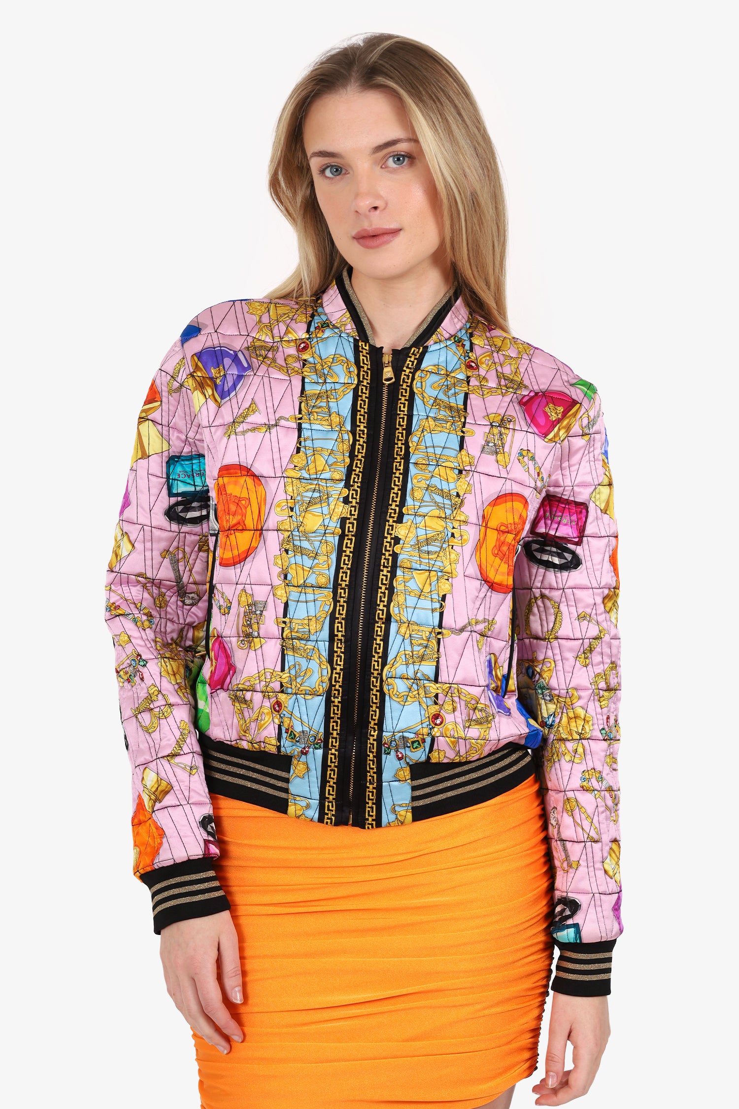 Refresh availabilityVersace Pink Silk Printed Bomber Jacket. Pull-on. Collared neckline. Front zip closure. 2 exterior pockets with zip closure. Lined interior. Gold-tone hardware. Tonal stitching.