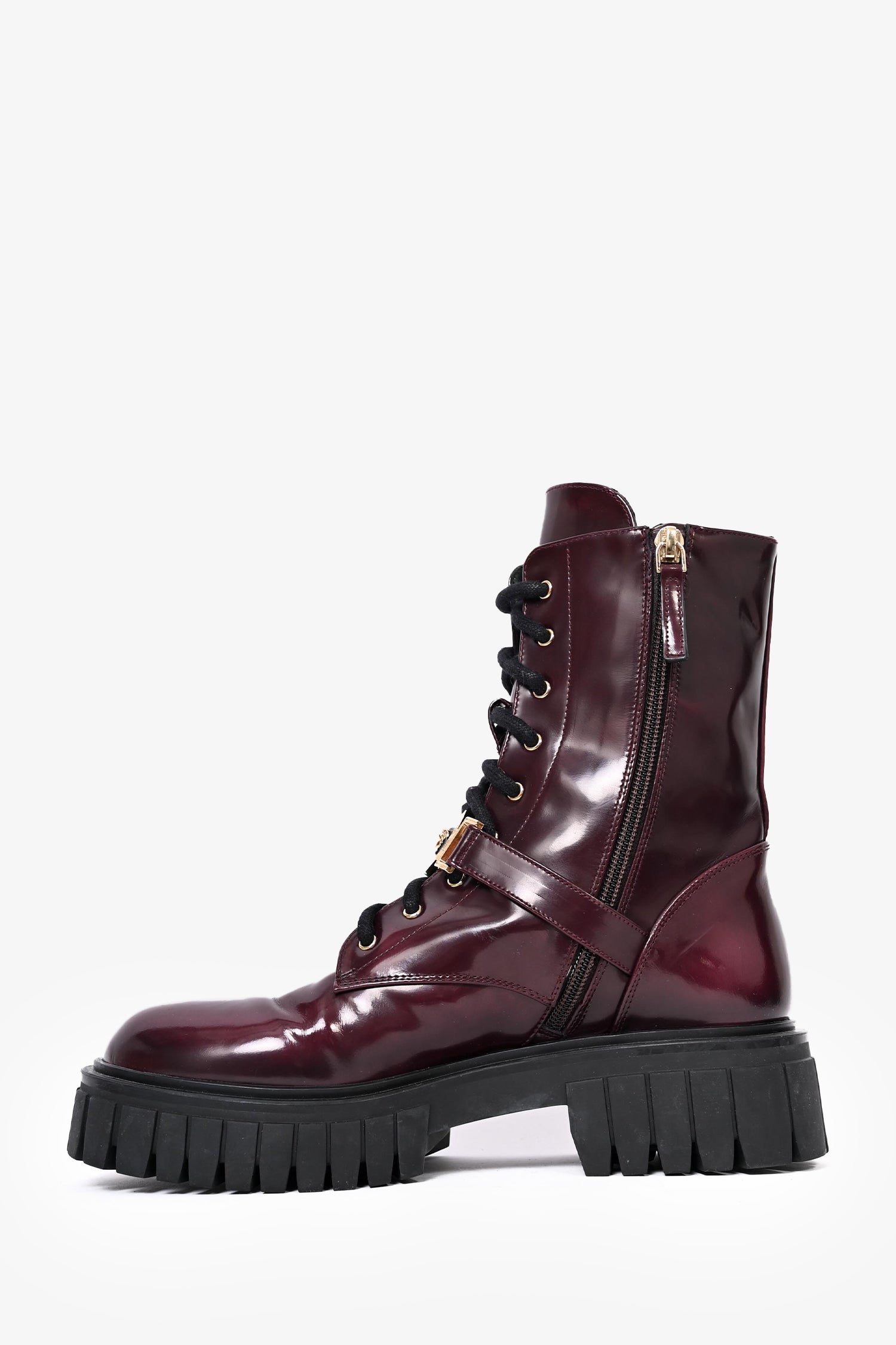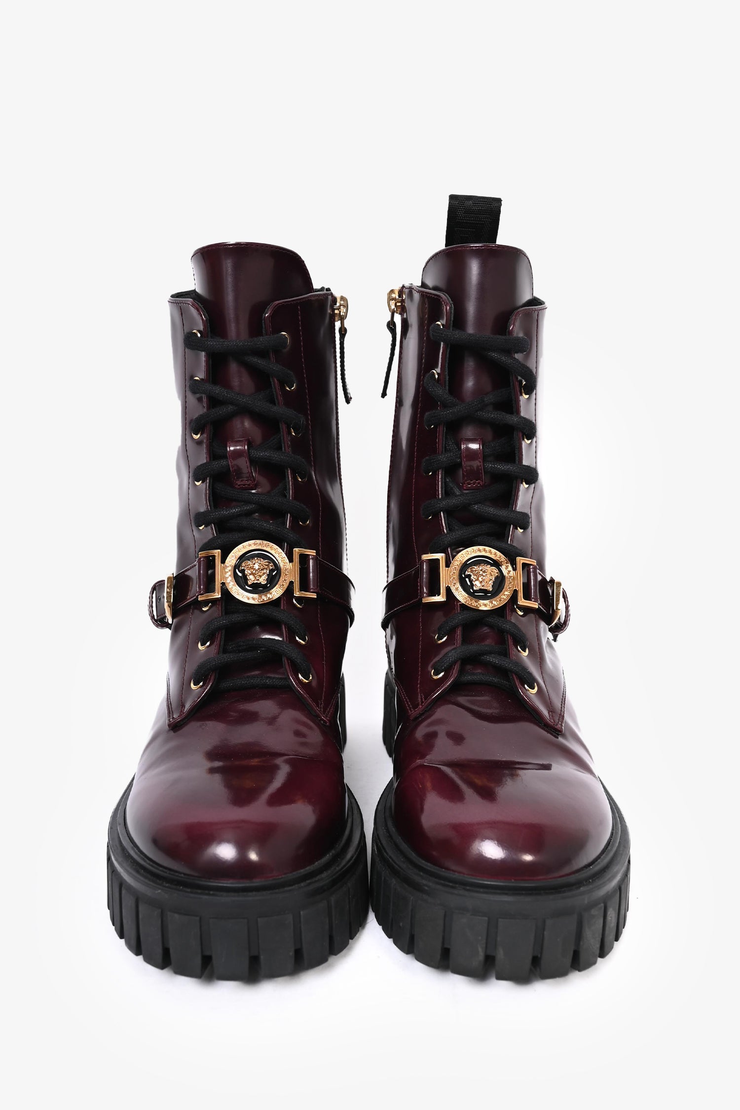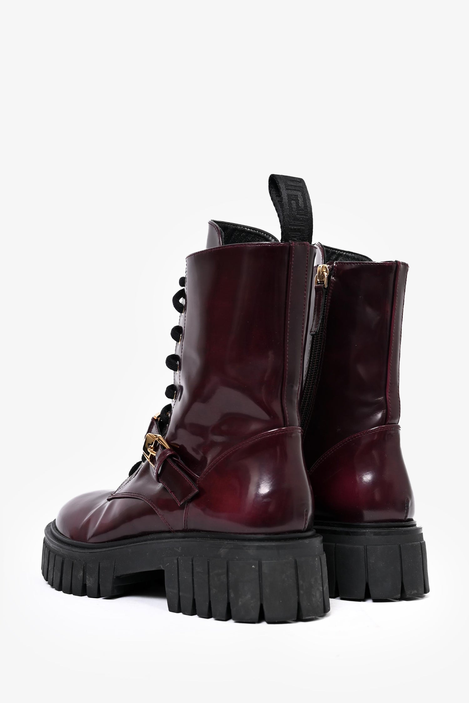 Refresh availabilityVersace Burgundy Patent Leather Combat Boots. Round toe. Side zip and strap with buckle closure. Front lace-up closure.