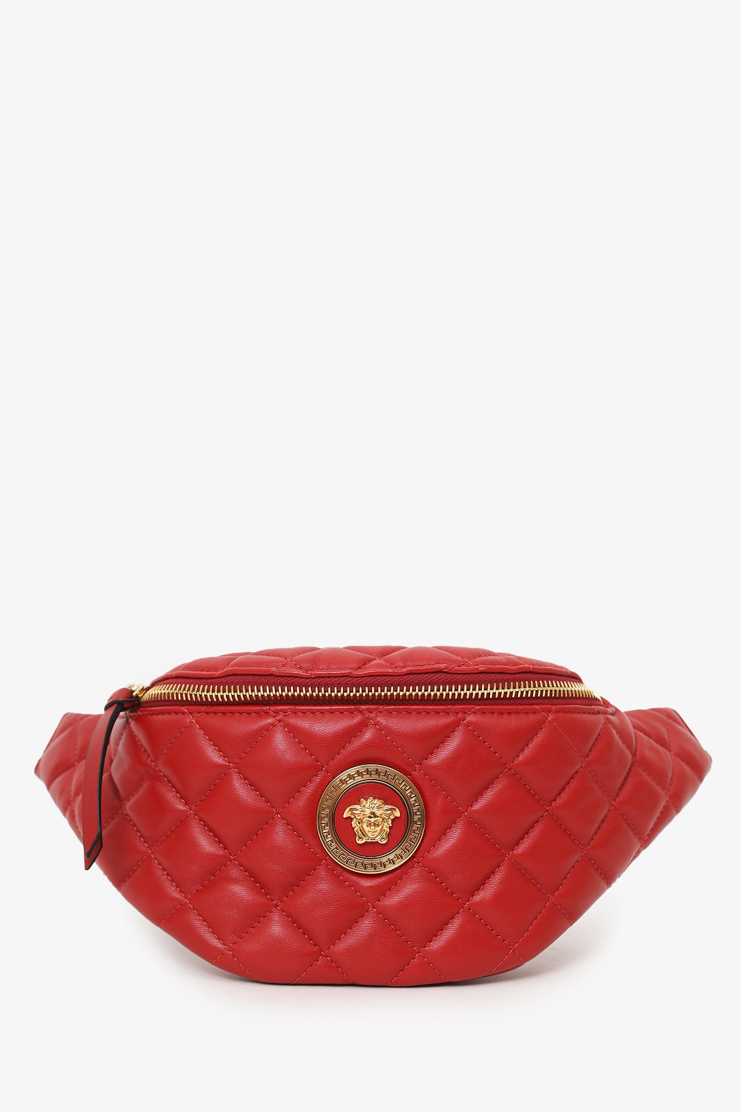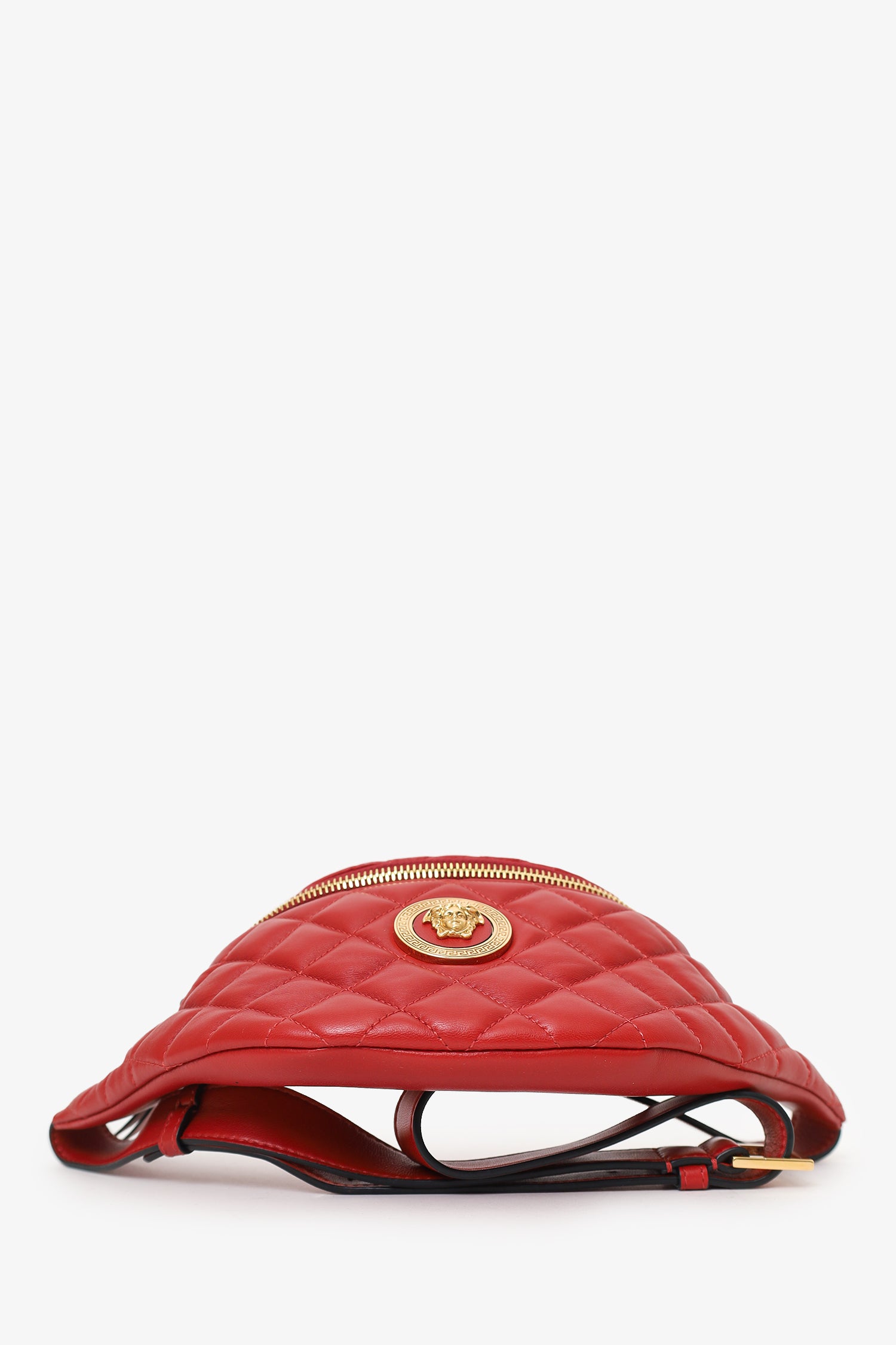 Refresh availabilityVersace Red Leather Quilted Belt Bag. Top zip closure with leather pull tabs. Rear belt strap with adjustable buckle closure. Lined interior with single interior slip pocket. Gold-tone hardware. Tonal stitching.