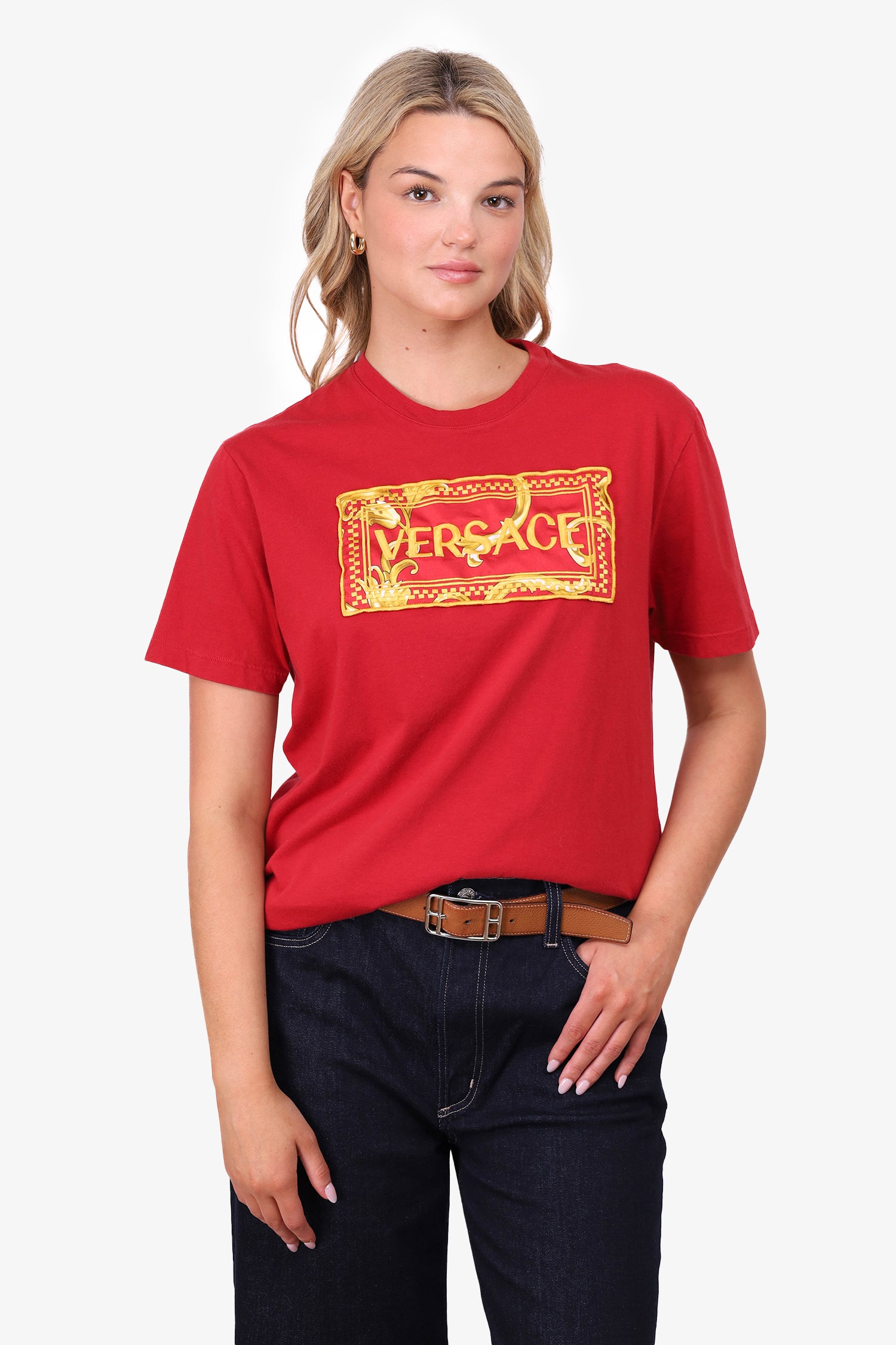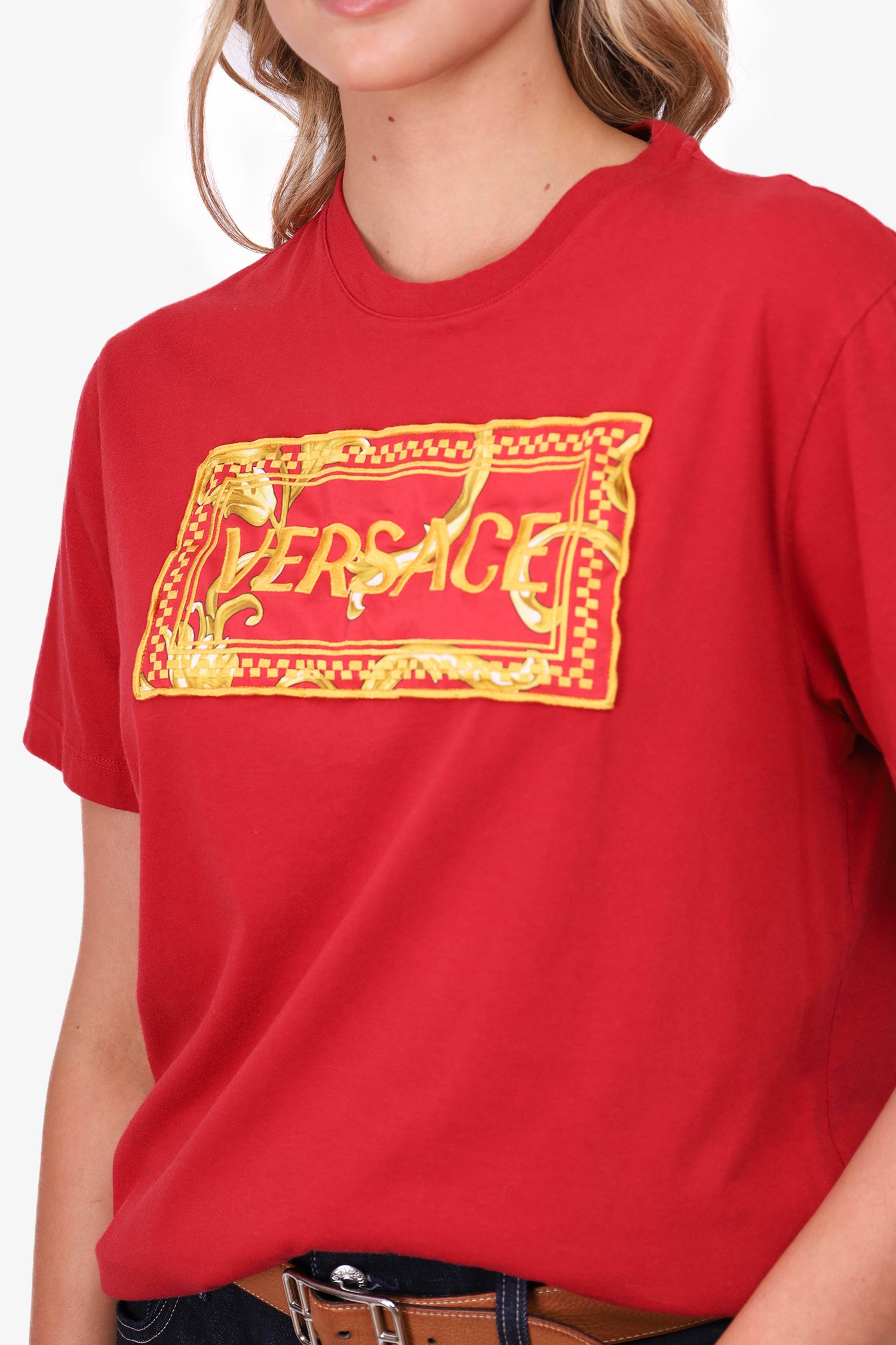 Refresh availabilityVersace Red Logo Embroidery T-Shirt. Crew neck. Ribbed neckline. Yellow embroidered logo on front. Unlined. Tonal stitching.