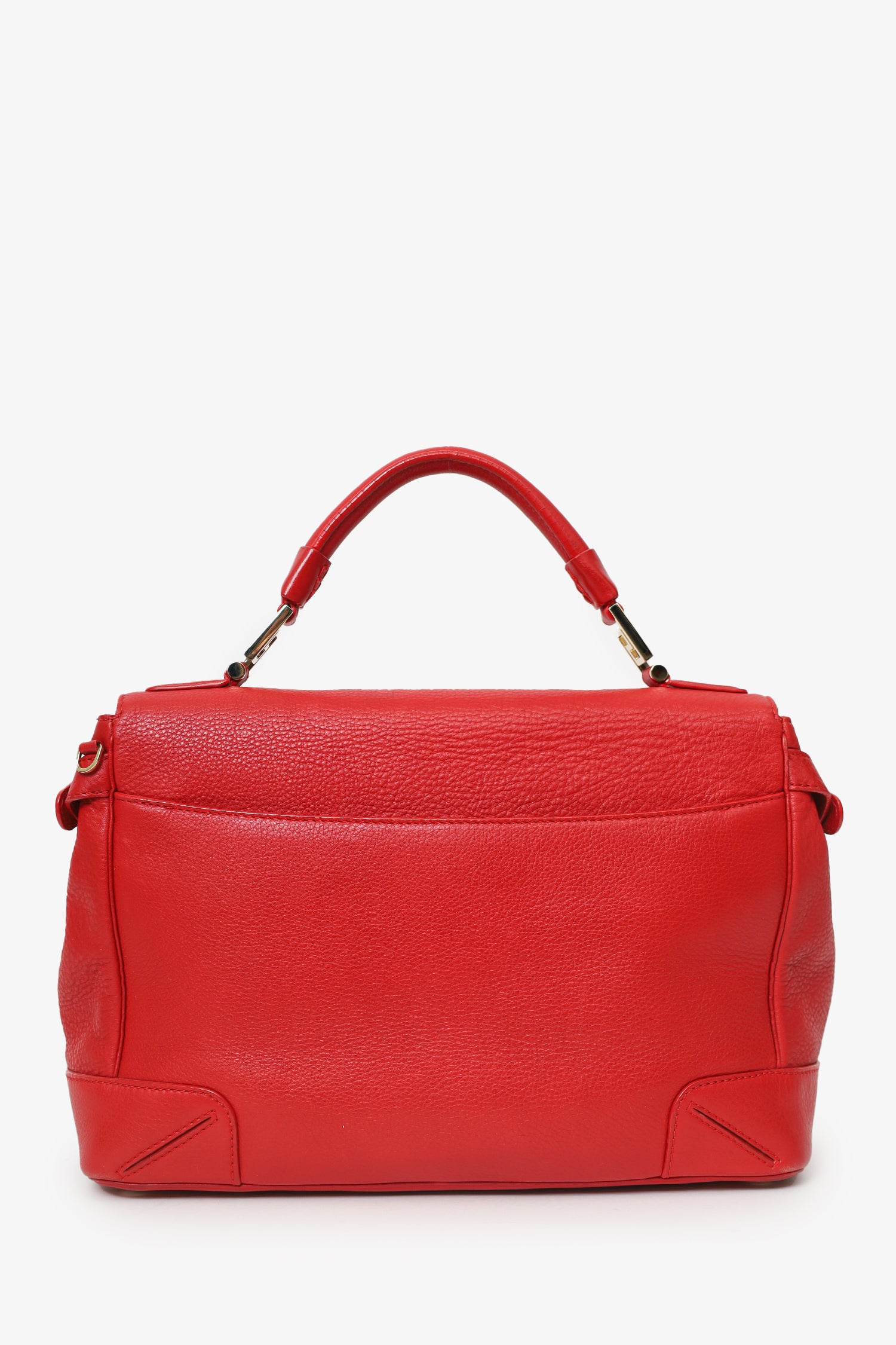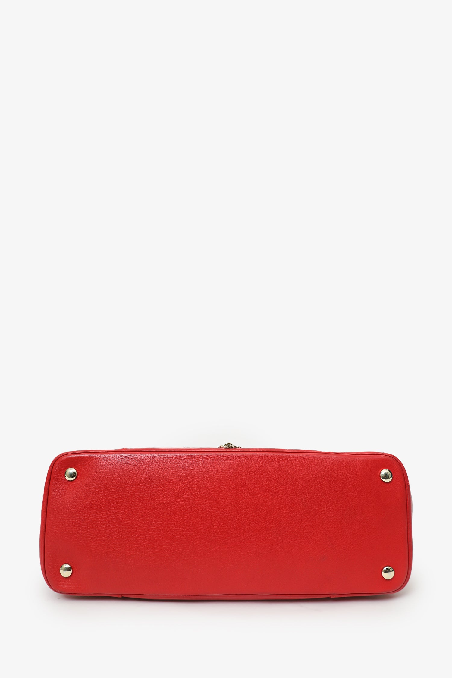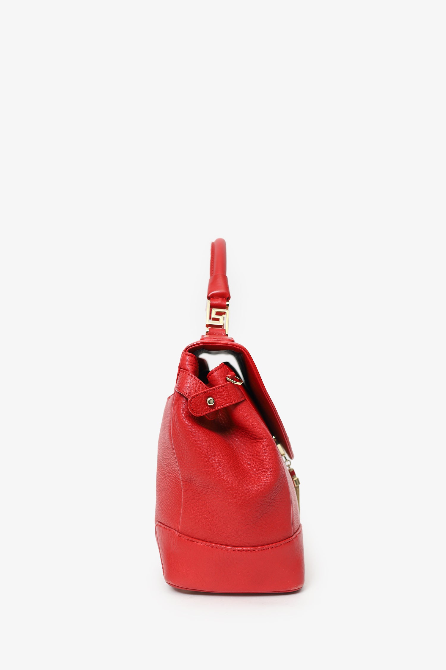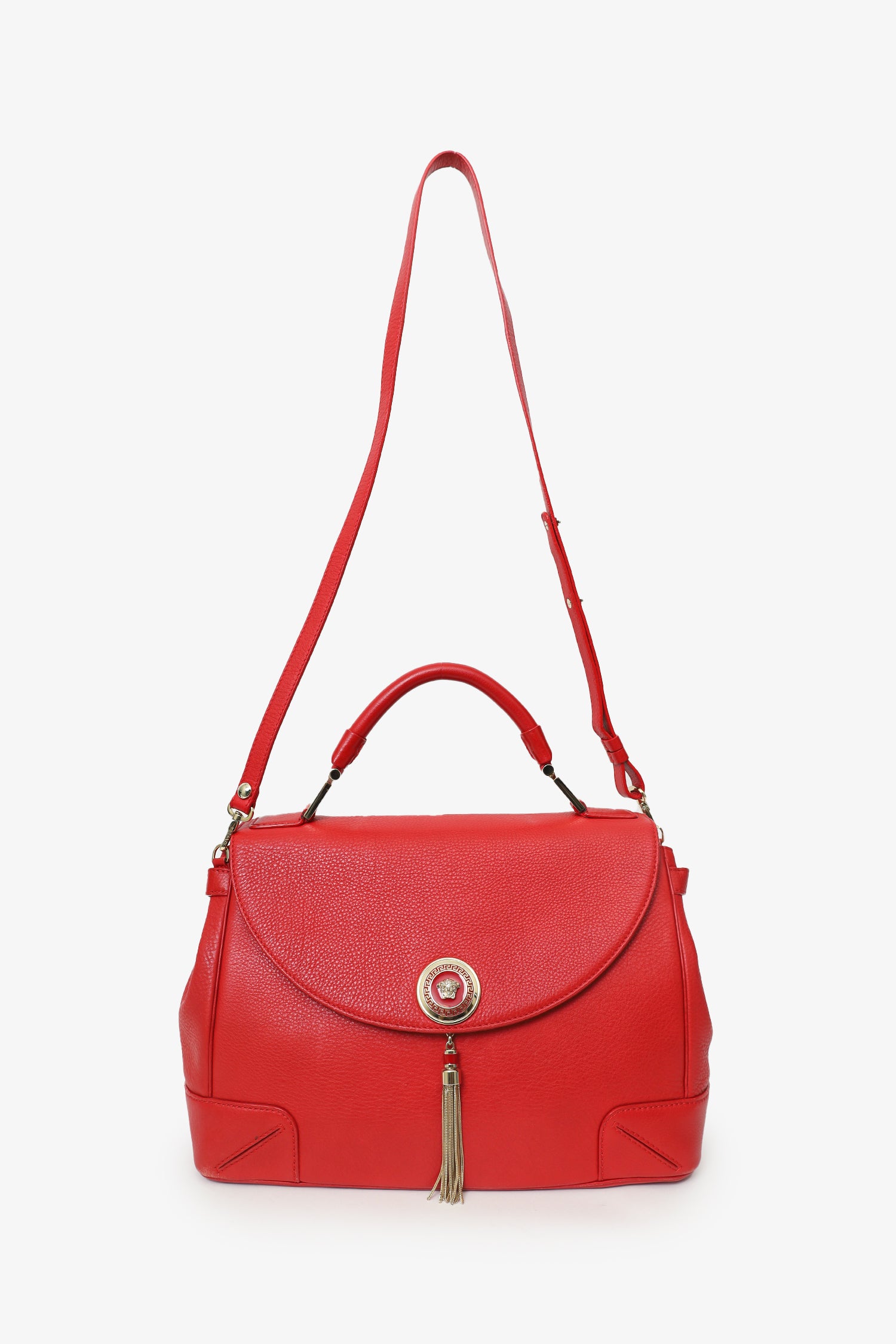 Refresh availabilityVersace Red Medusa Tassel Handbag. Front fold-over flap with push-lock closure. Top handle. Adjustable and removable shoulder strap with clasp closure. Side buckles with push-pin closure. Protective base studs. Lined interior. 3 interior pockets; 2 slip and 1 zip. Gold-tone hardware. Tonal stitching.