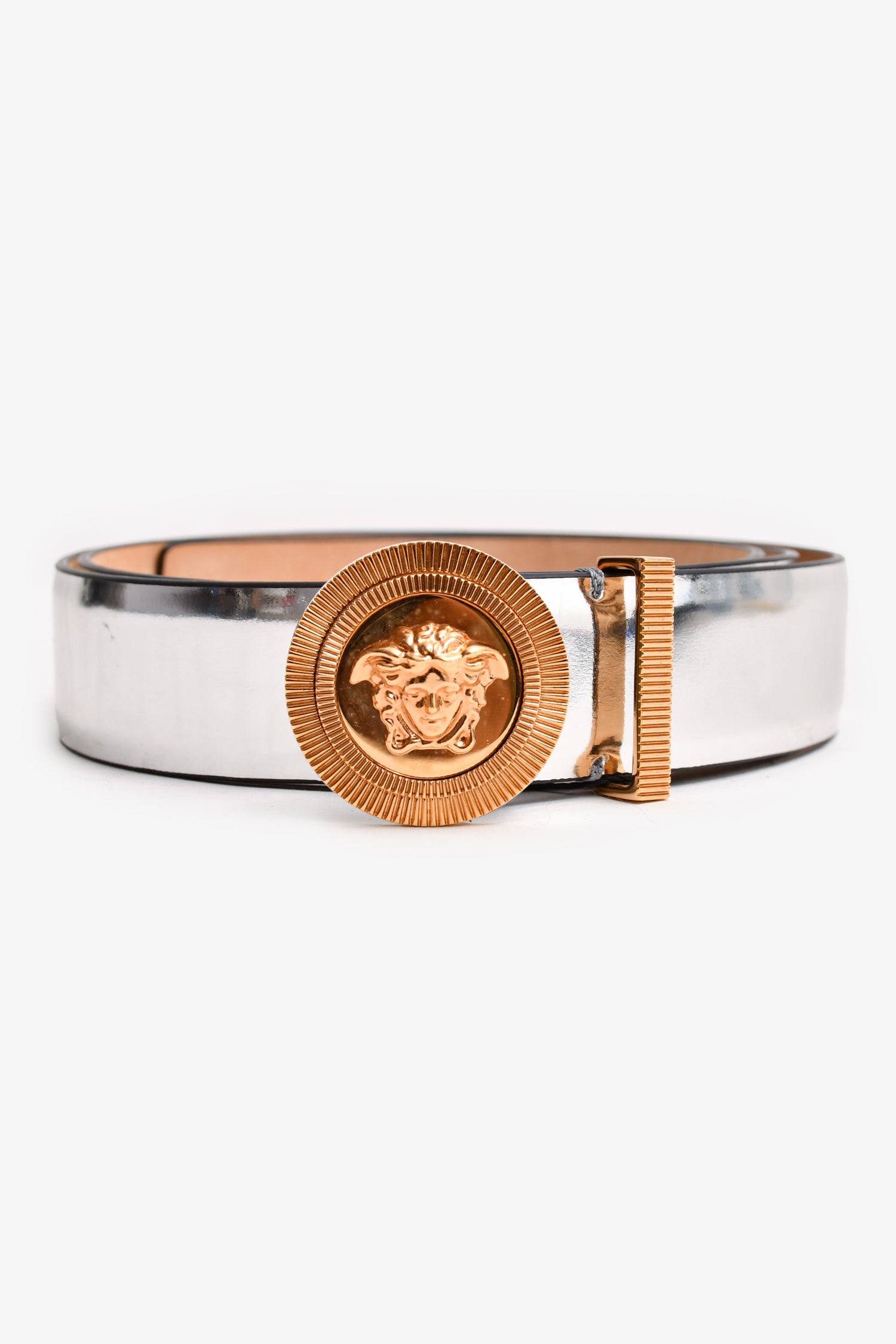 Refresh availabilityVersace Silver/Gold Leather 'Medusa' Belt Push tab closure. Gold-tone hardware. Tonal stitching.