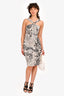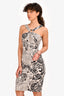 Refresh availabilityVersace White/Black Text Printed Silk Mini Dress. Side hidden zip-up closure. Cutout detail on the front. Silver-tone metal detail on the front. Fully lined. Tonal stitching.