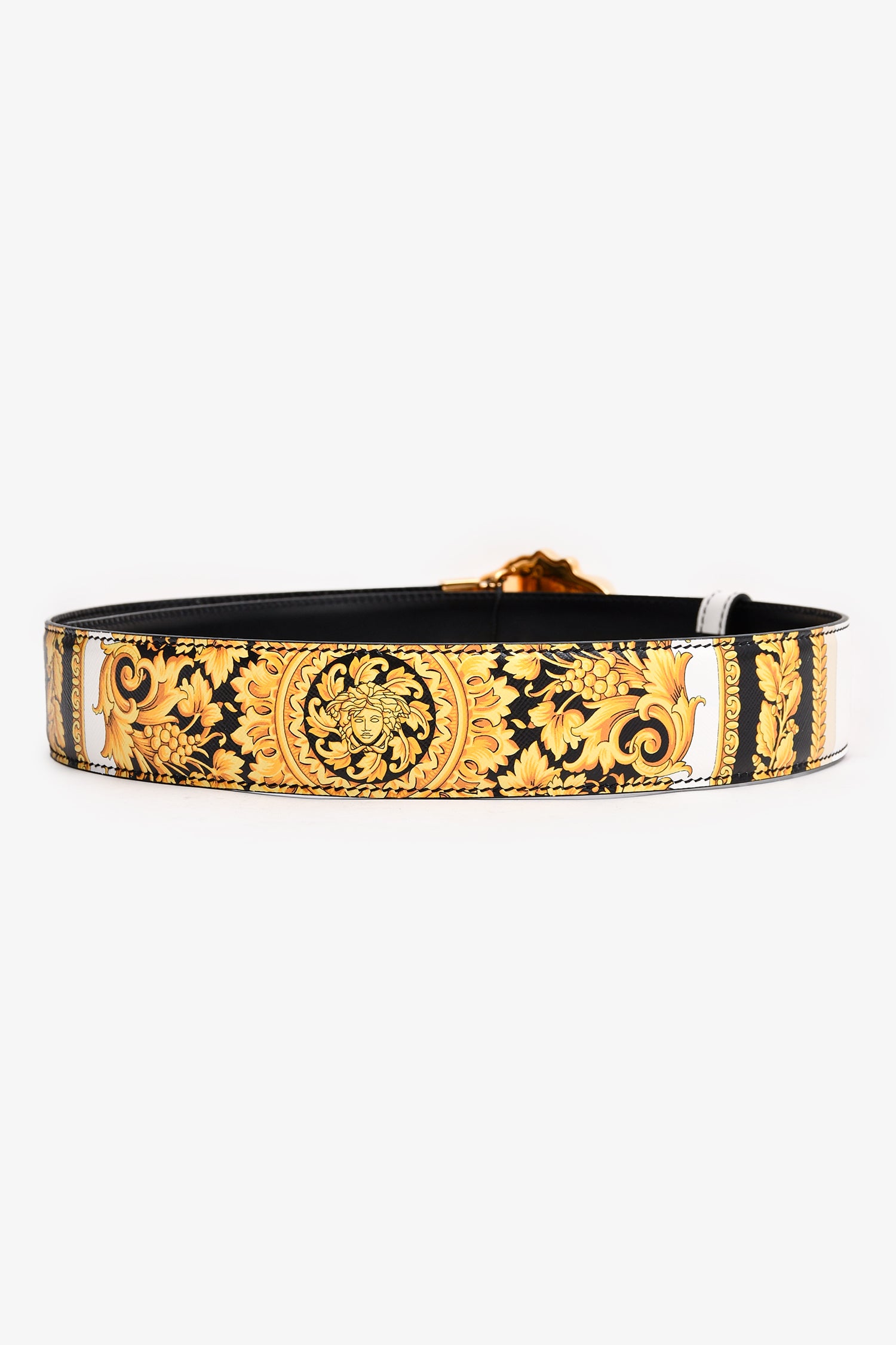 Refresh availabilityVersace White/Gold Medusa Buckle Printed Belt. Push tab closure. Gold-tone hardware. Tonal stitching.