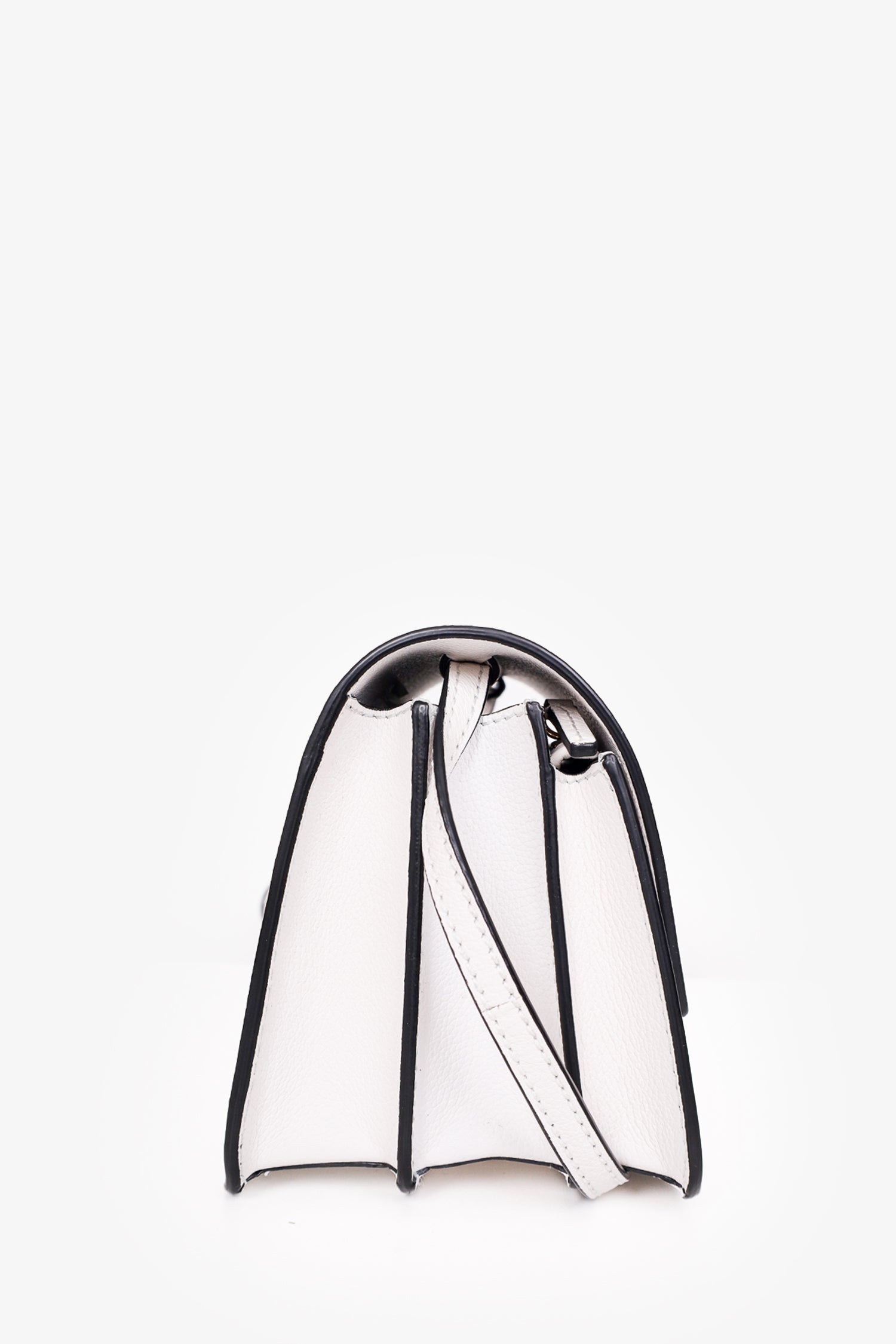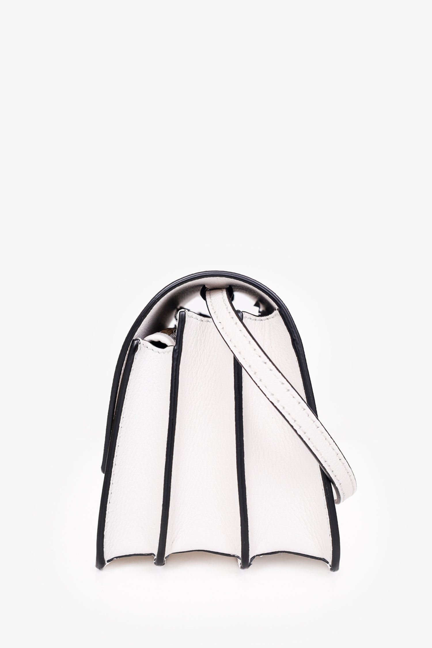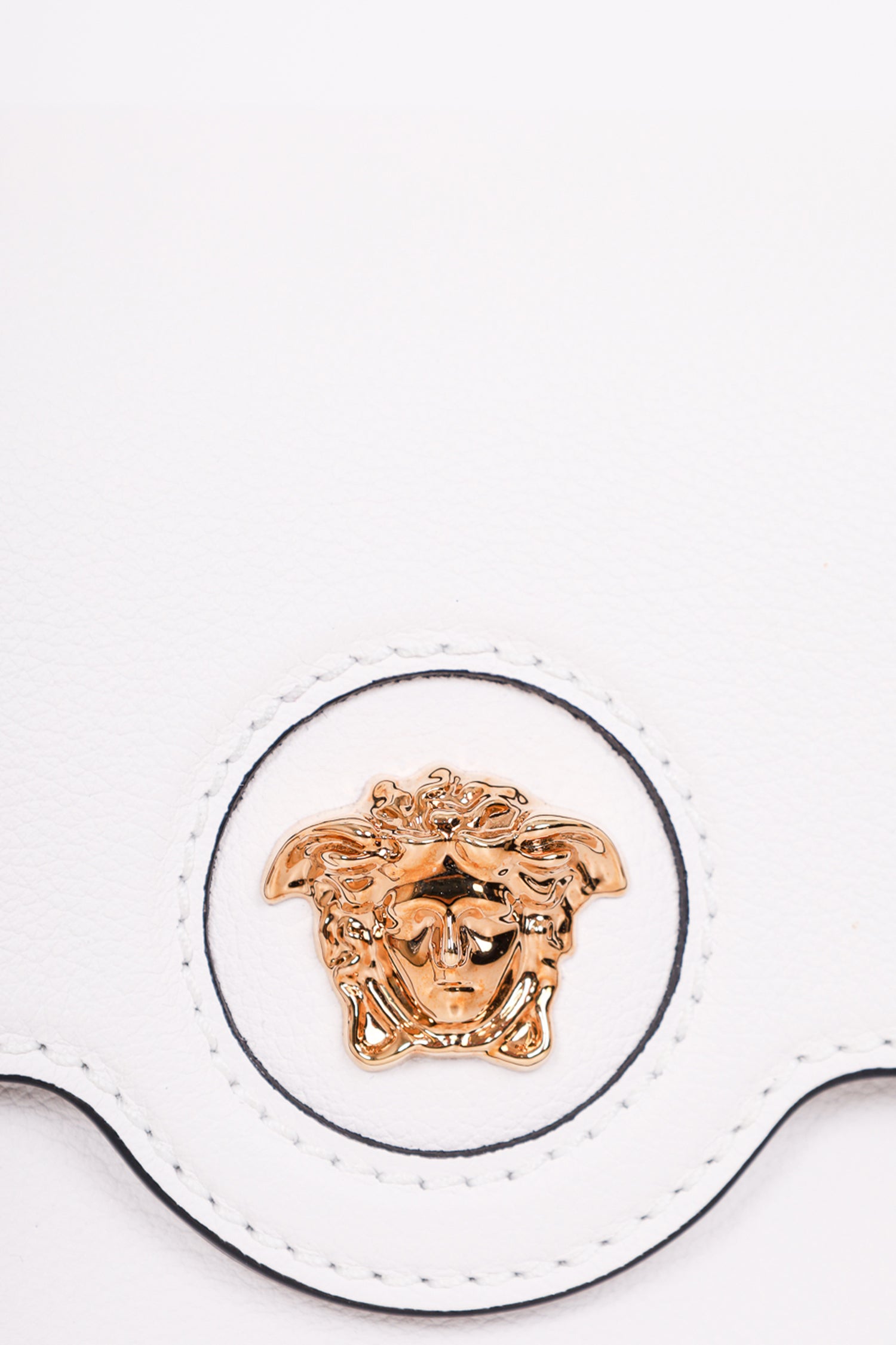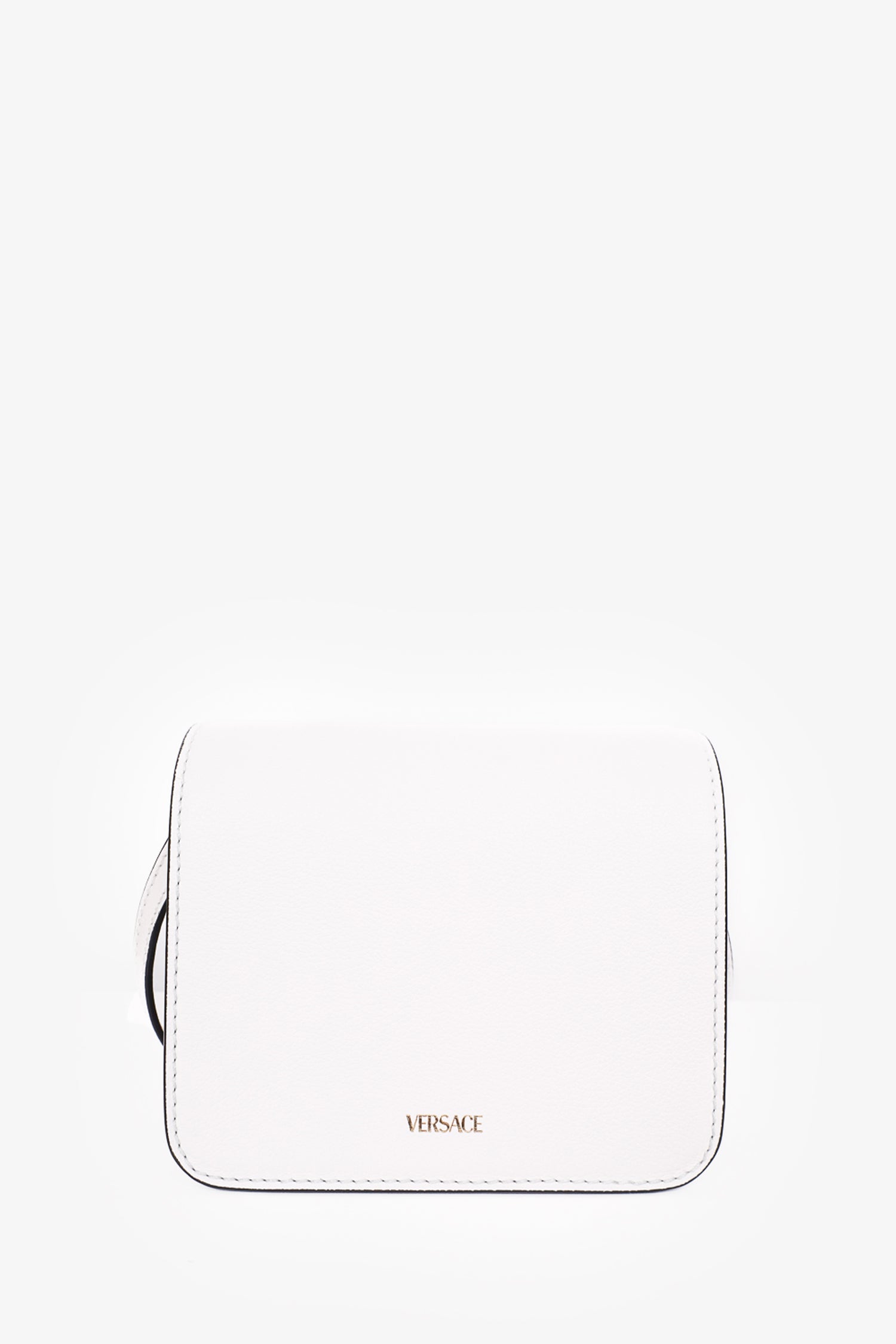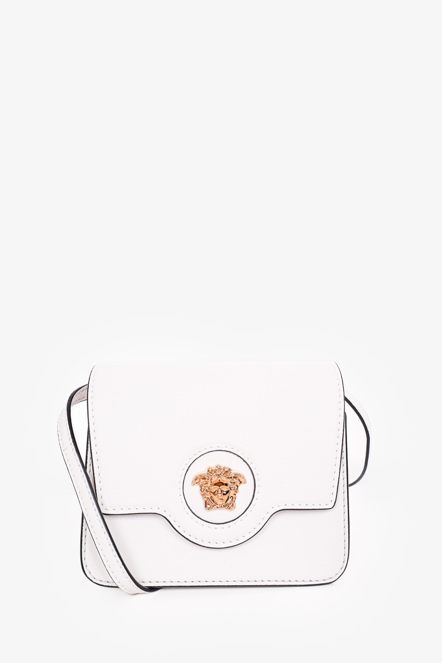 Refresh availabilityVersace White Leather Small La Medusa Crossbody Bag. Front fold-over flap with magnet button closure. Front pouch with zipper closure. Middle slip pocket. Adjustable cross-body strap. Tonal stitching. Silver-tone hardware.