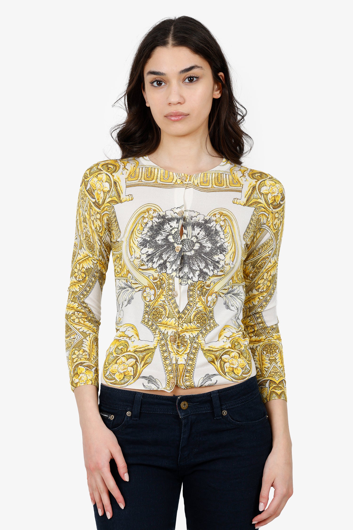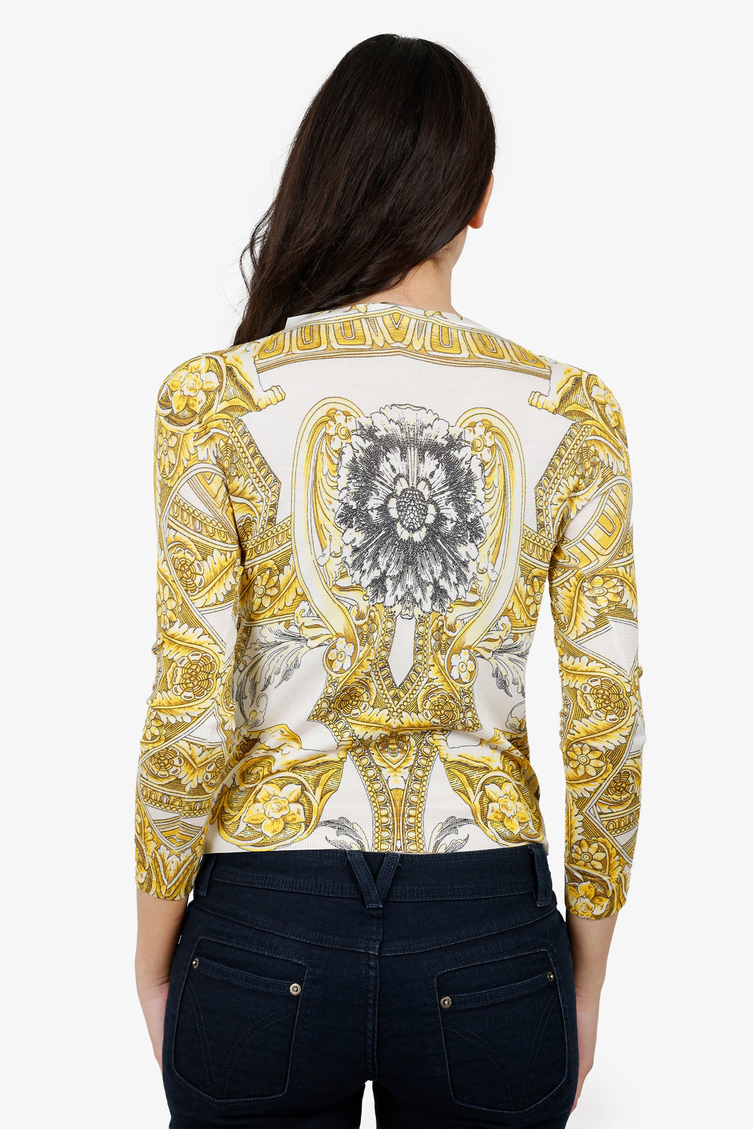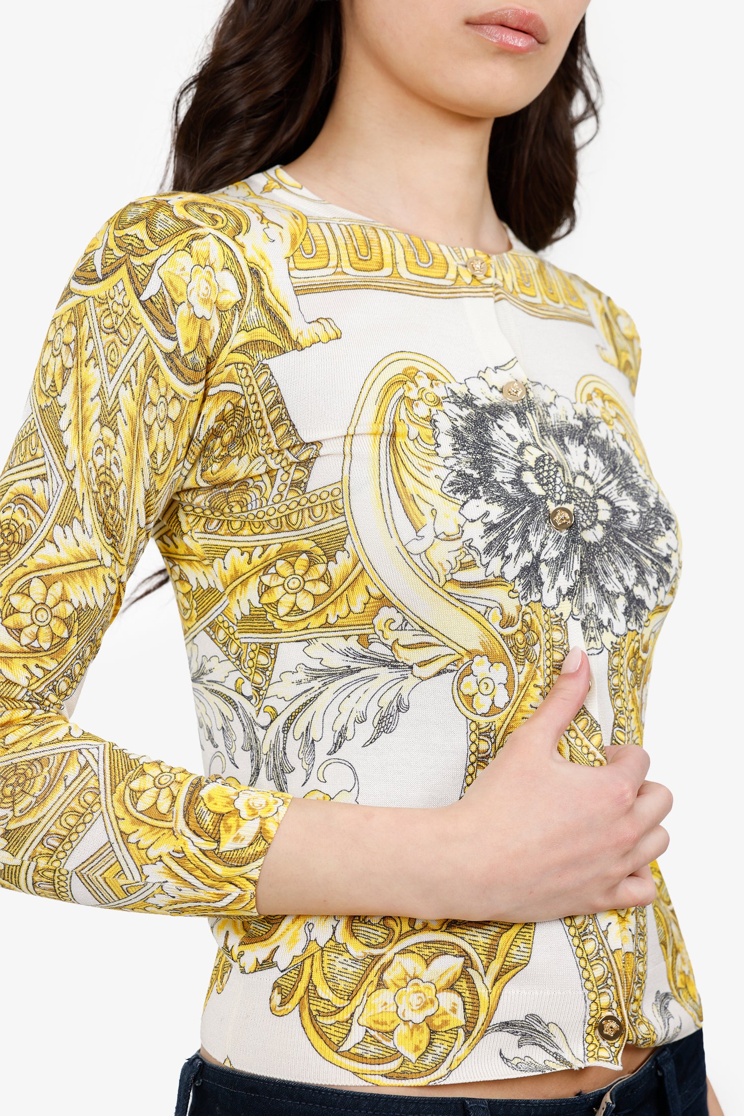 Refresh availabilityVersace White/Yellow Silk Baroque Print Knit Cardigan. Round neckline. Front button-up closure. Gold-tone hardware. Tonal stitching.