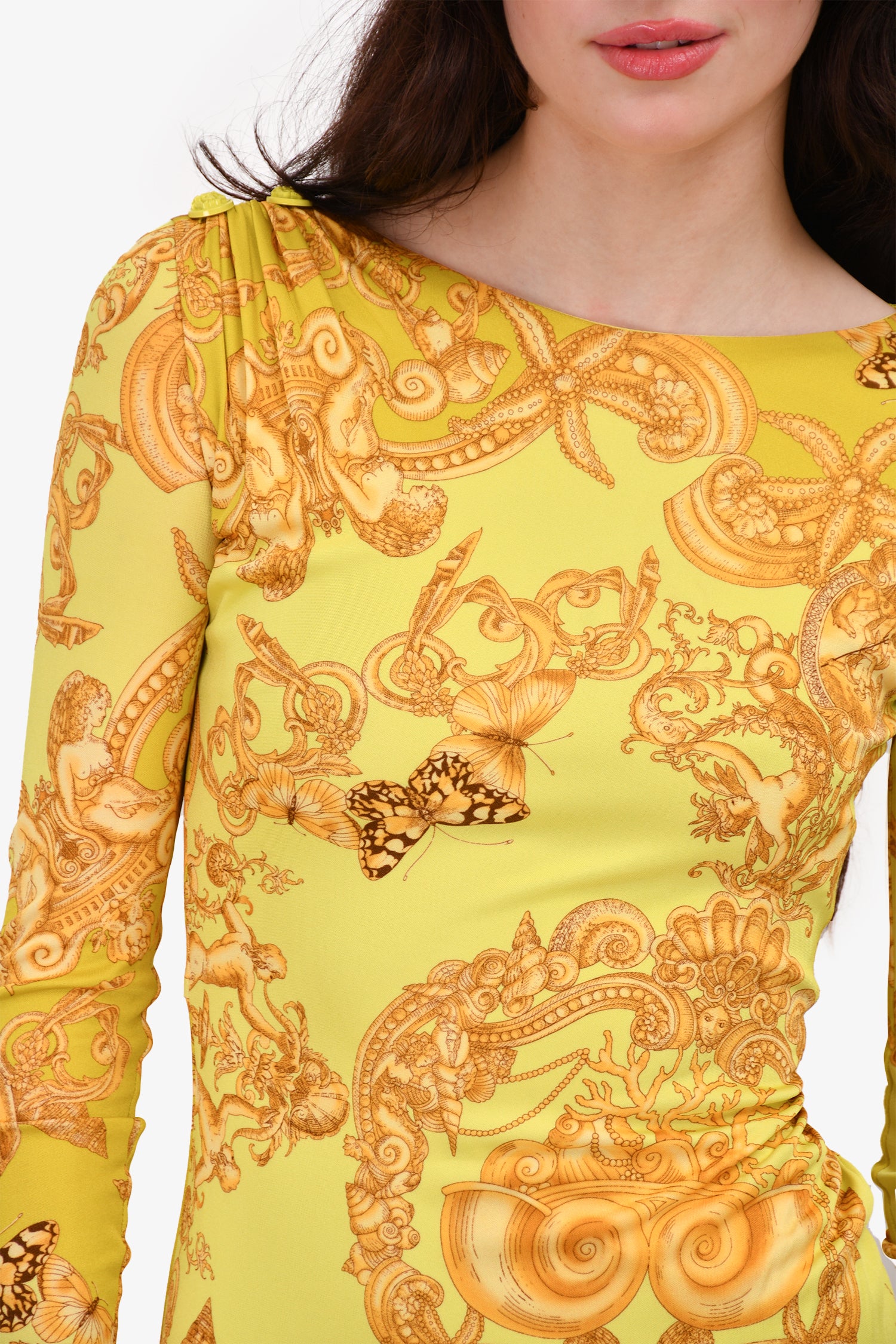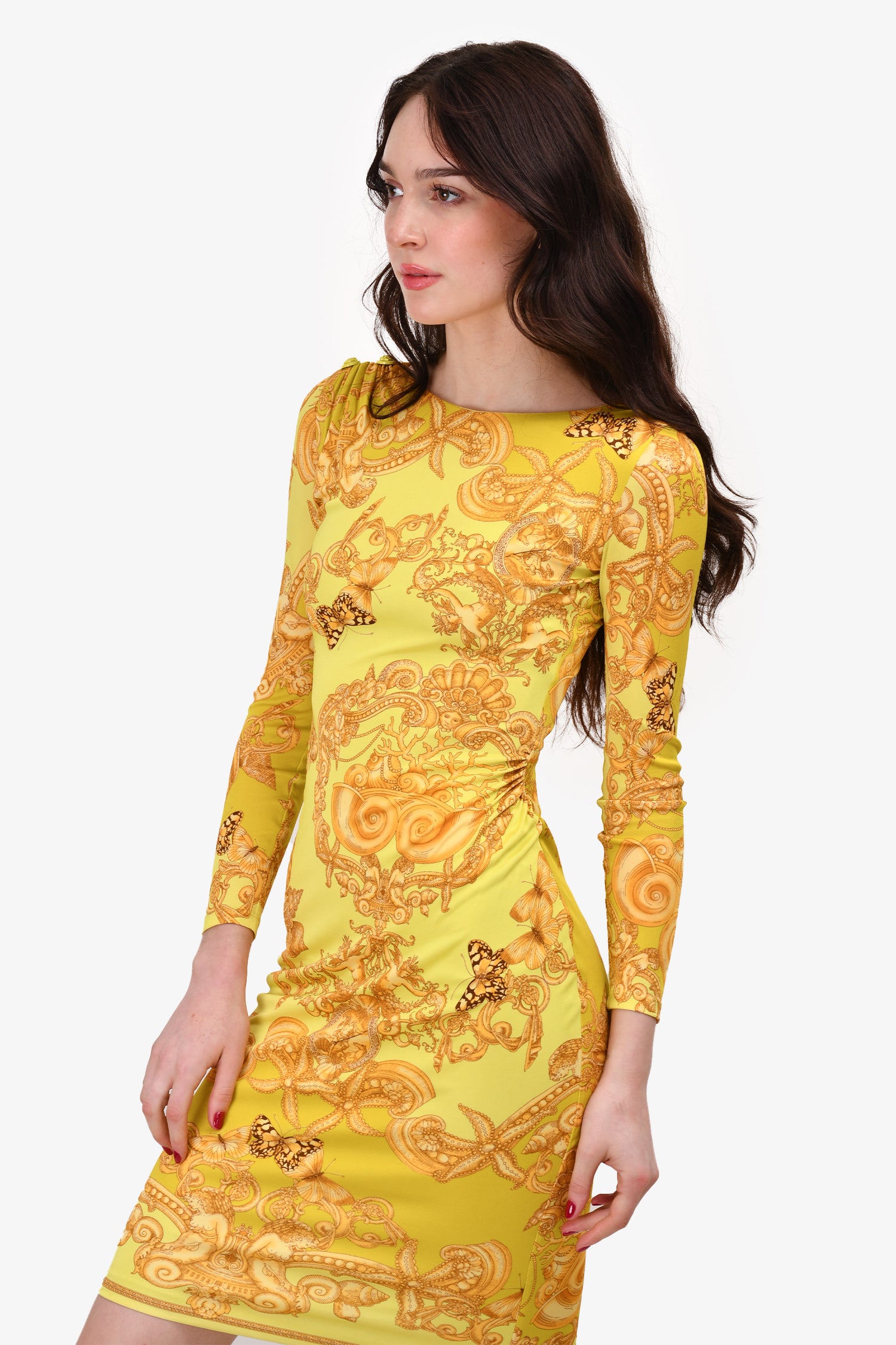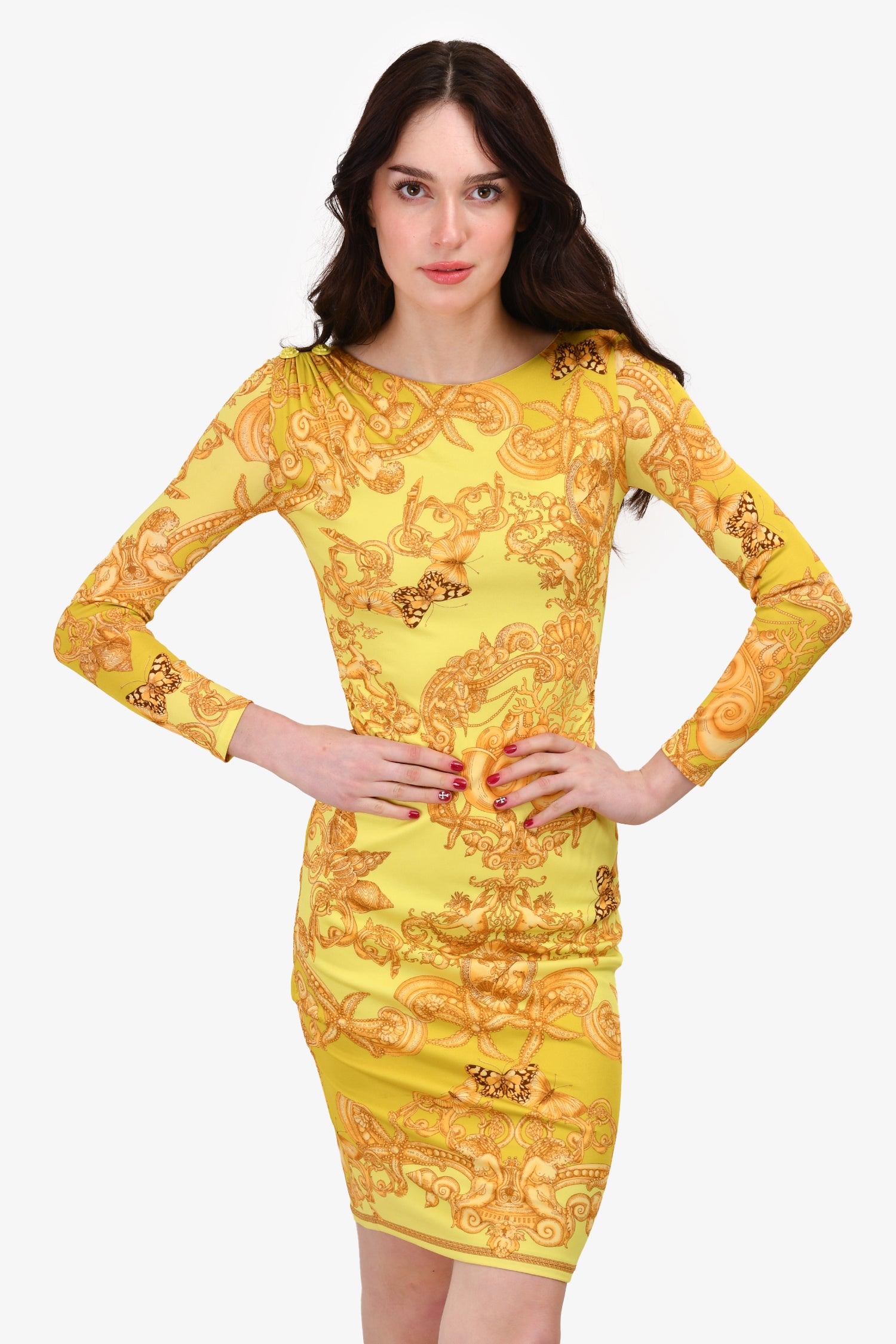 Refresh availabilityVersace Yellow Graphic Printed Bodycon Midi Dress. Round neck. Rear zip and hook closure. Lined.