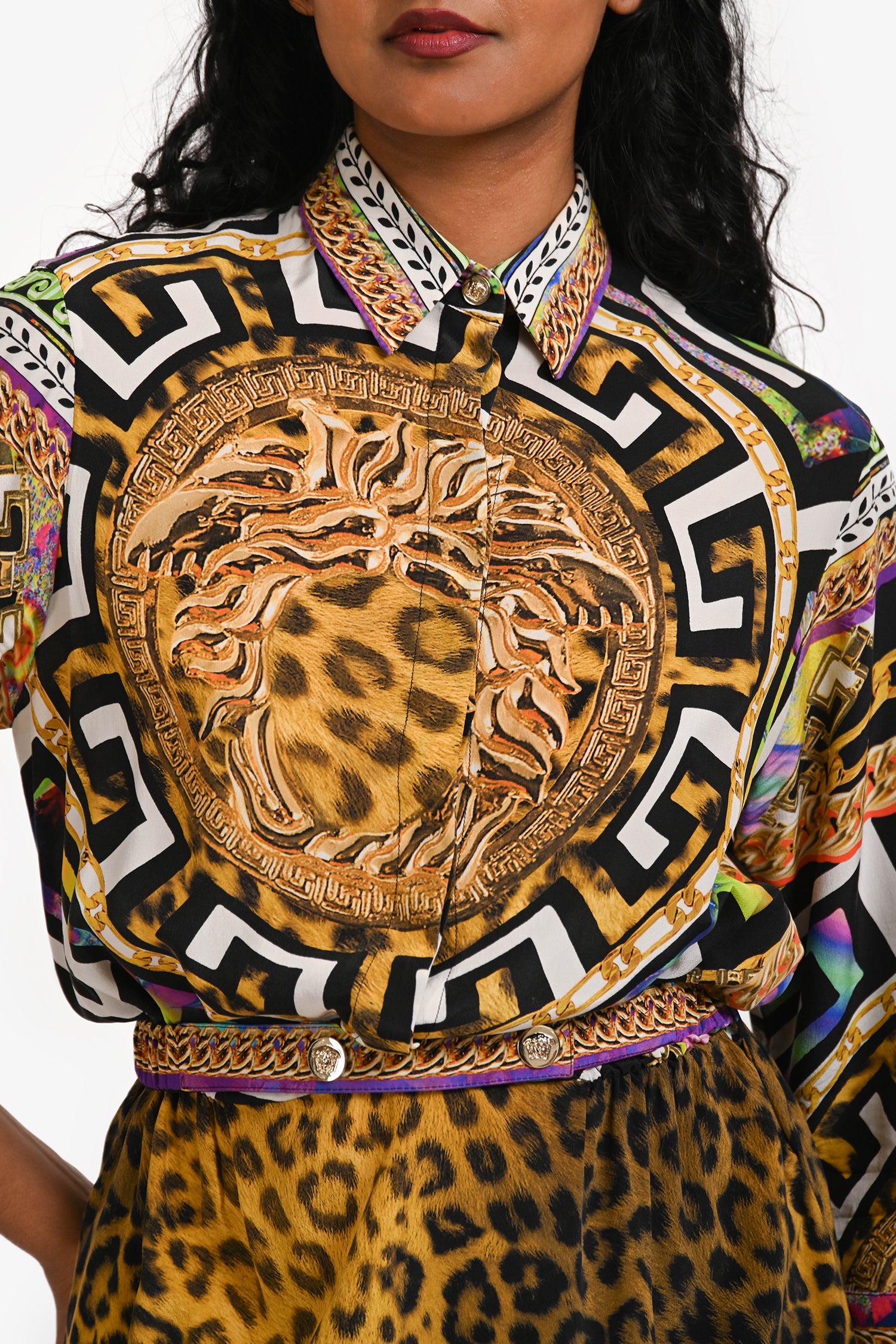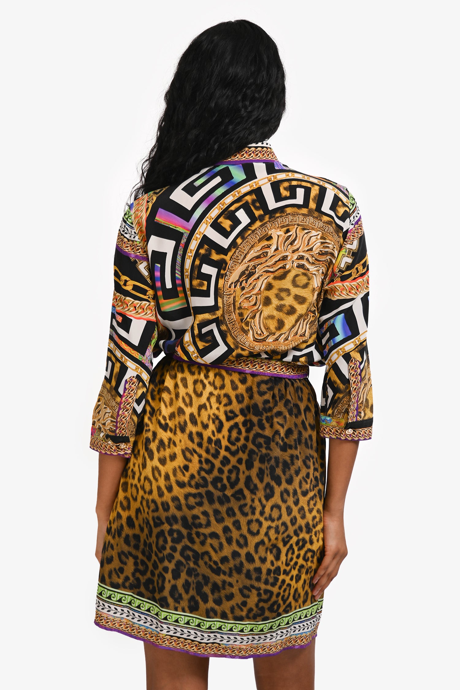 Refresh availabilityVersace Yellow and Multicolour Silk Patterned Shirt with Belt. Collared neckline. Front 1/4 button-up closure. Cuffs with button-up closures. Detachable belt at the waist with snap closures. Gold-tone hardware. Tonal stitching.