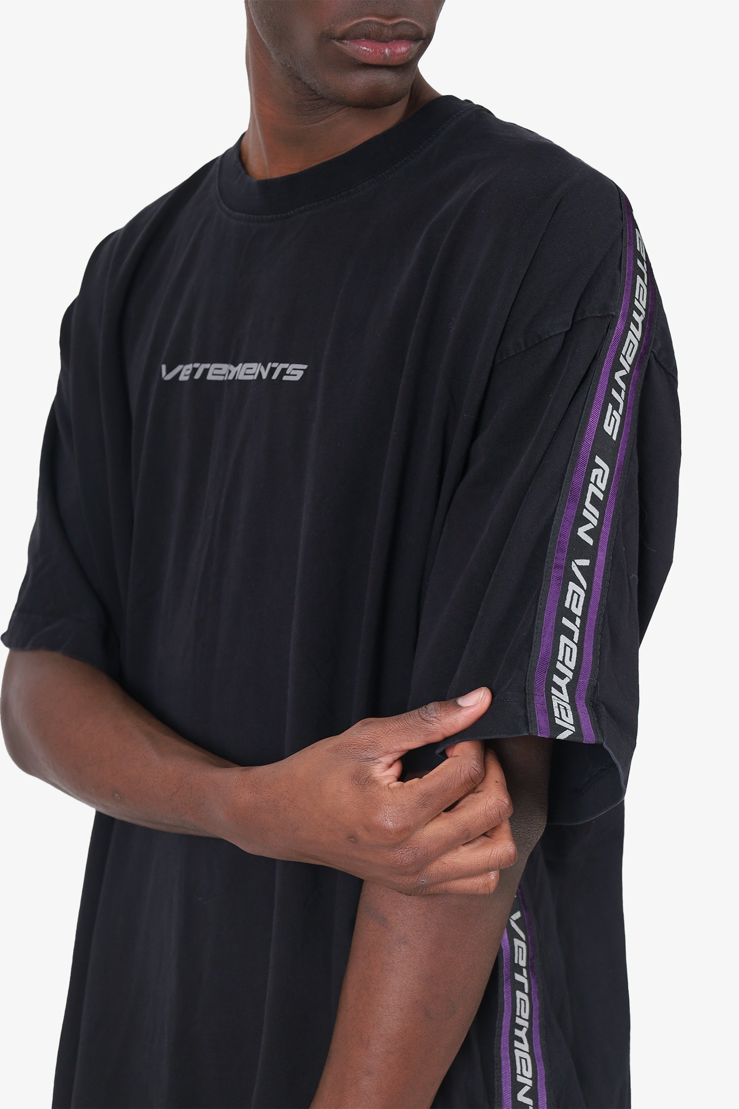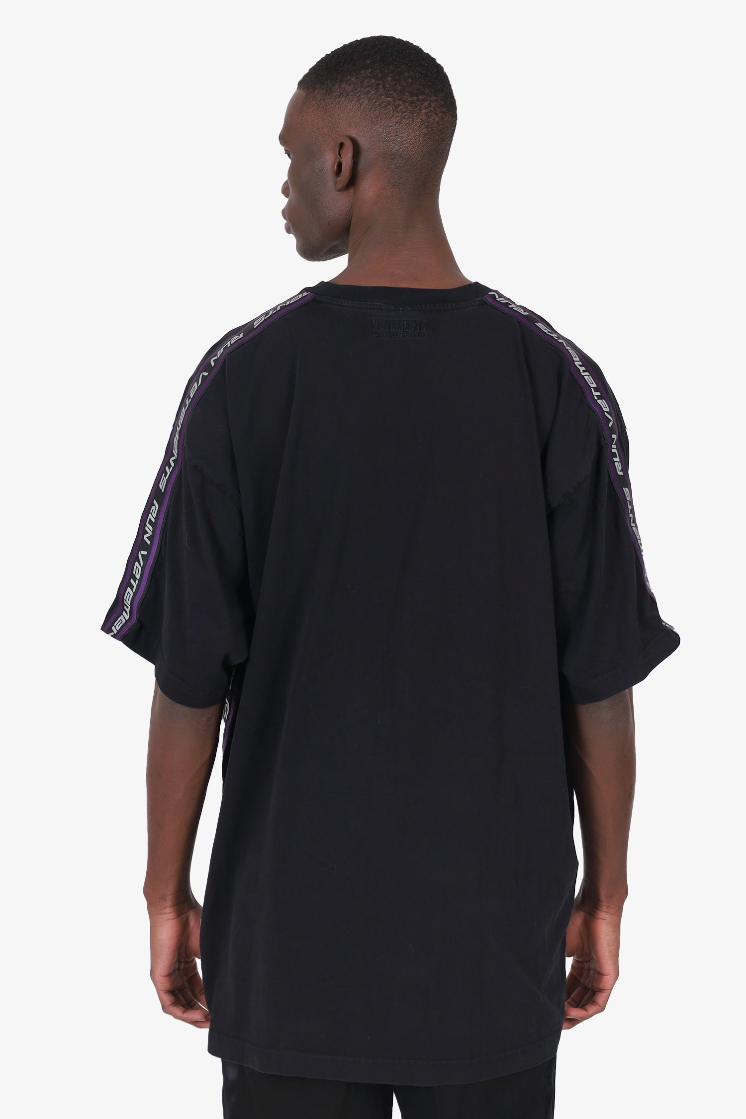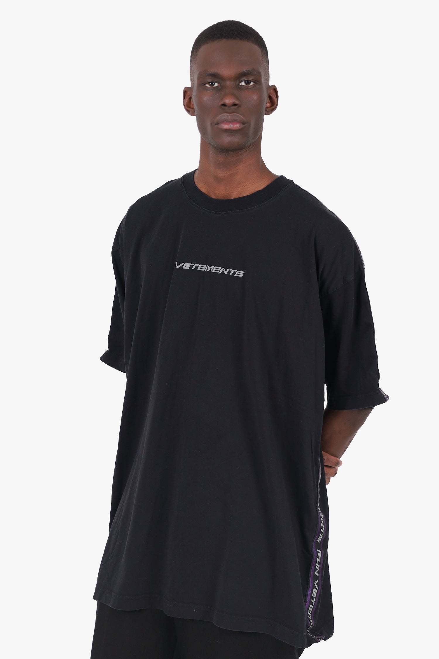 Refresh availabilityVETEMENTS Black Logo Taped Oversized T-Shirt. Pull-on. Round neckline. Tonal stitching.