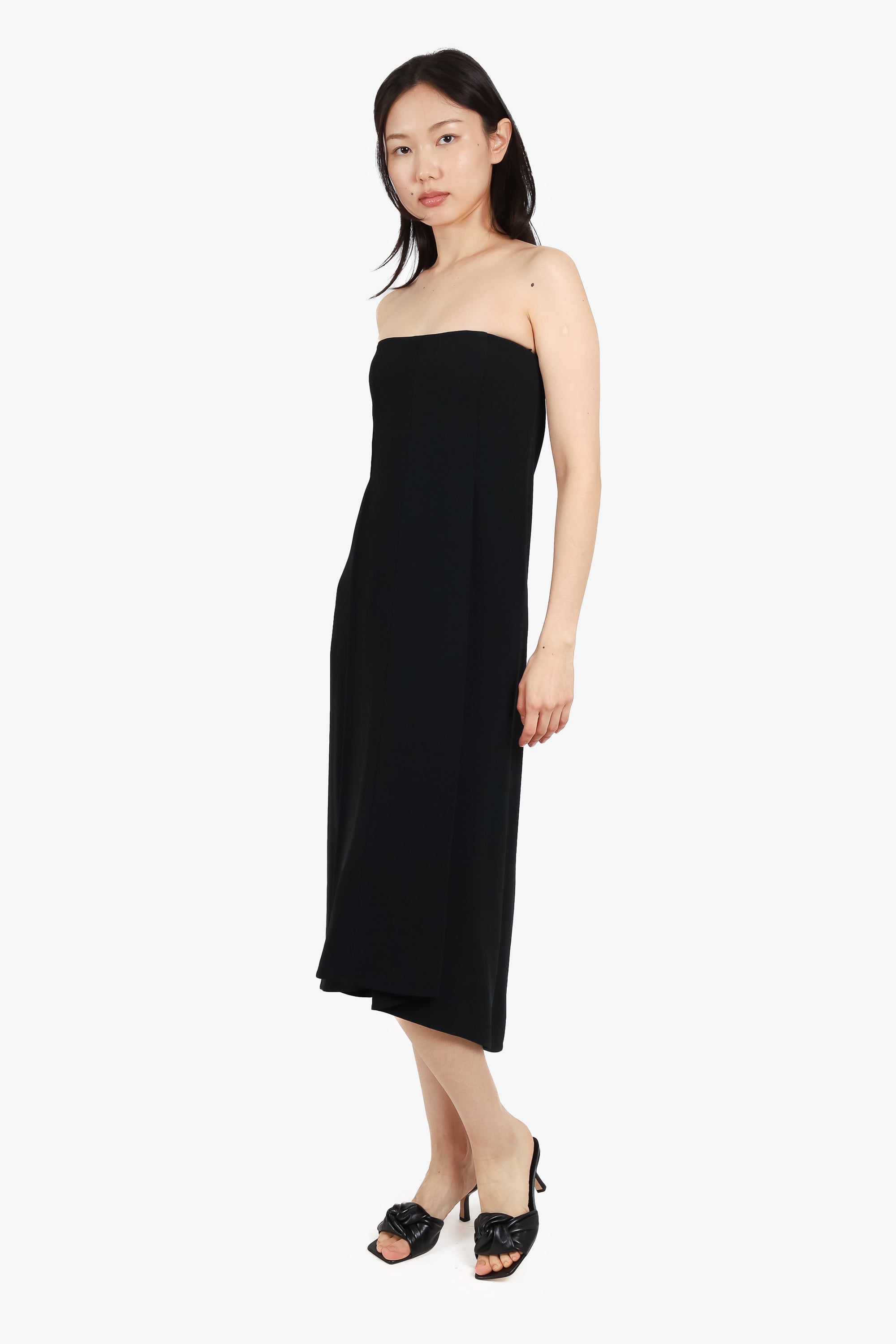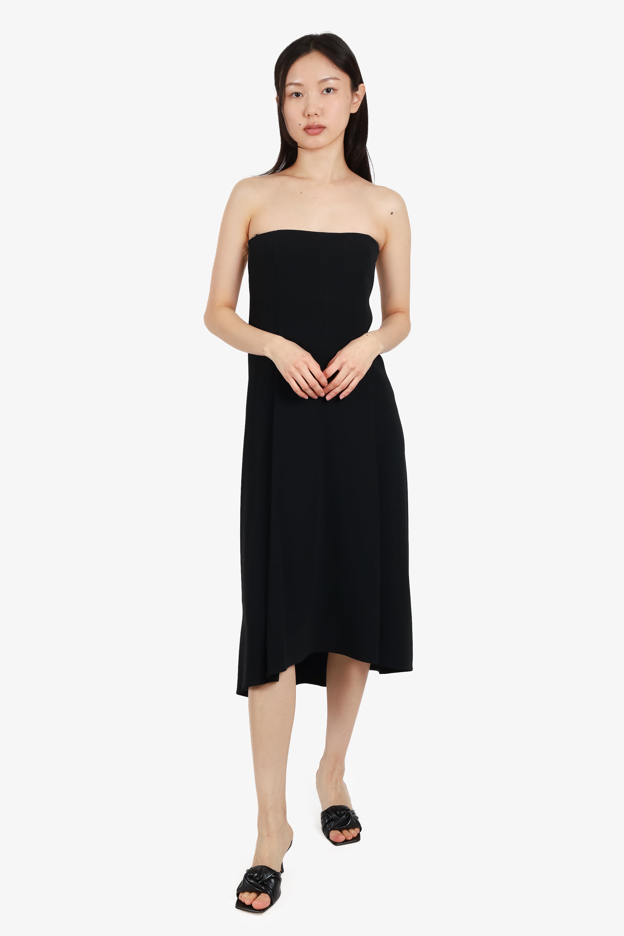 Refresh availabilityVictoria Beckham Sequin Details Black Strapless Midi Dress. Back bra clasp with double zipper closure. Lined. Tonal stitching.