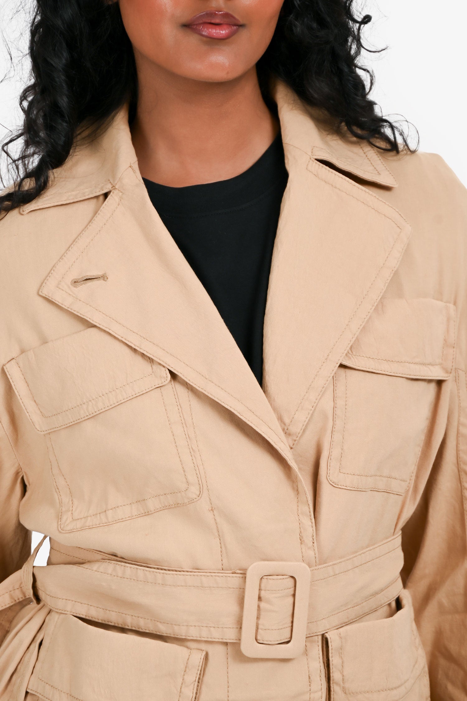 Refresh availabilityVince Brown Linen Belted Coat. Open front with single button closure. Long sleeves with buttoned cuffs. Front slip pockets. Tonal stitching.