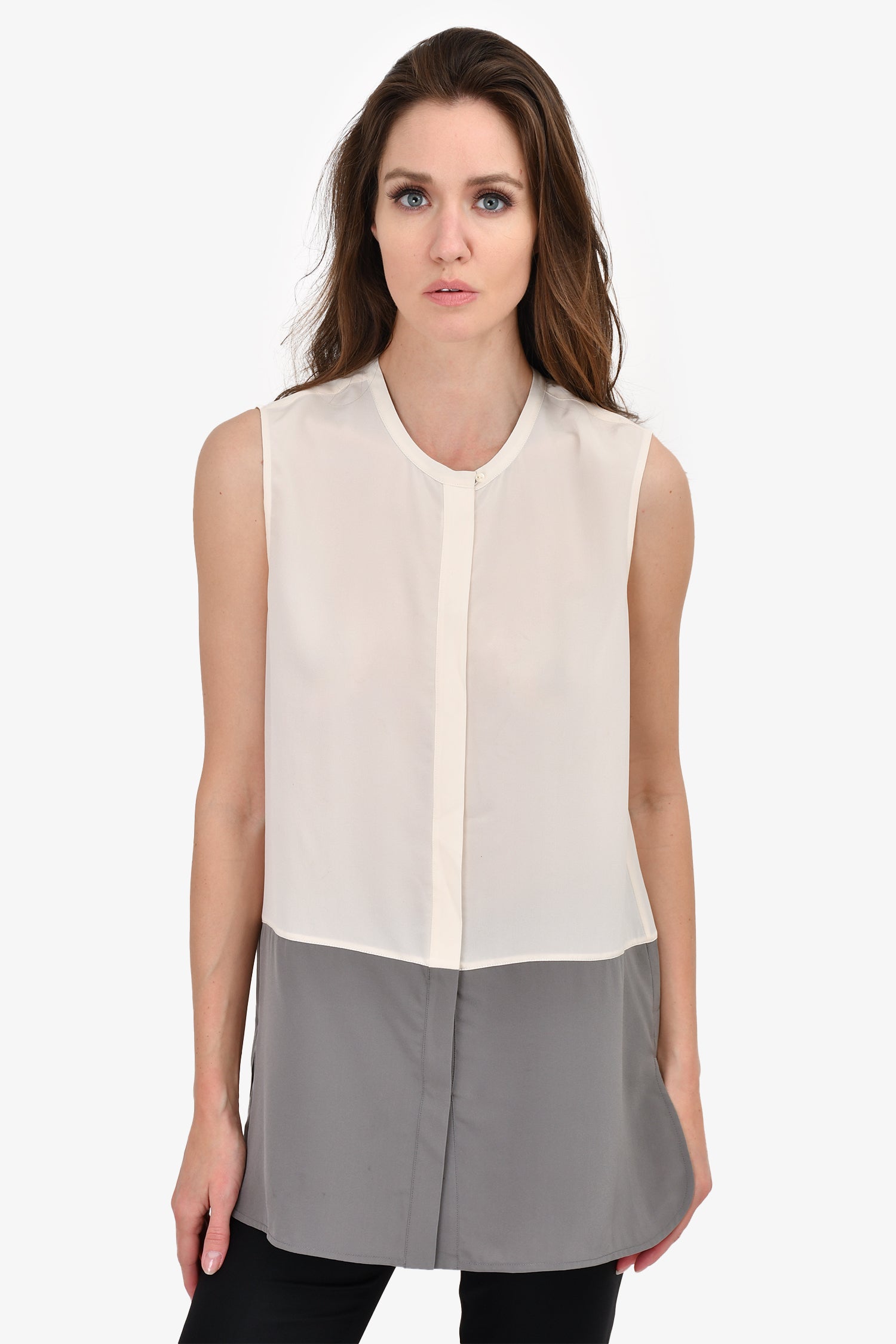 Refresh availabilityVince Cream/Grey Silk Sleeveless Dipped Hem Blouse. Front button-up closure. Round neck.