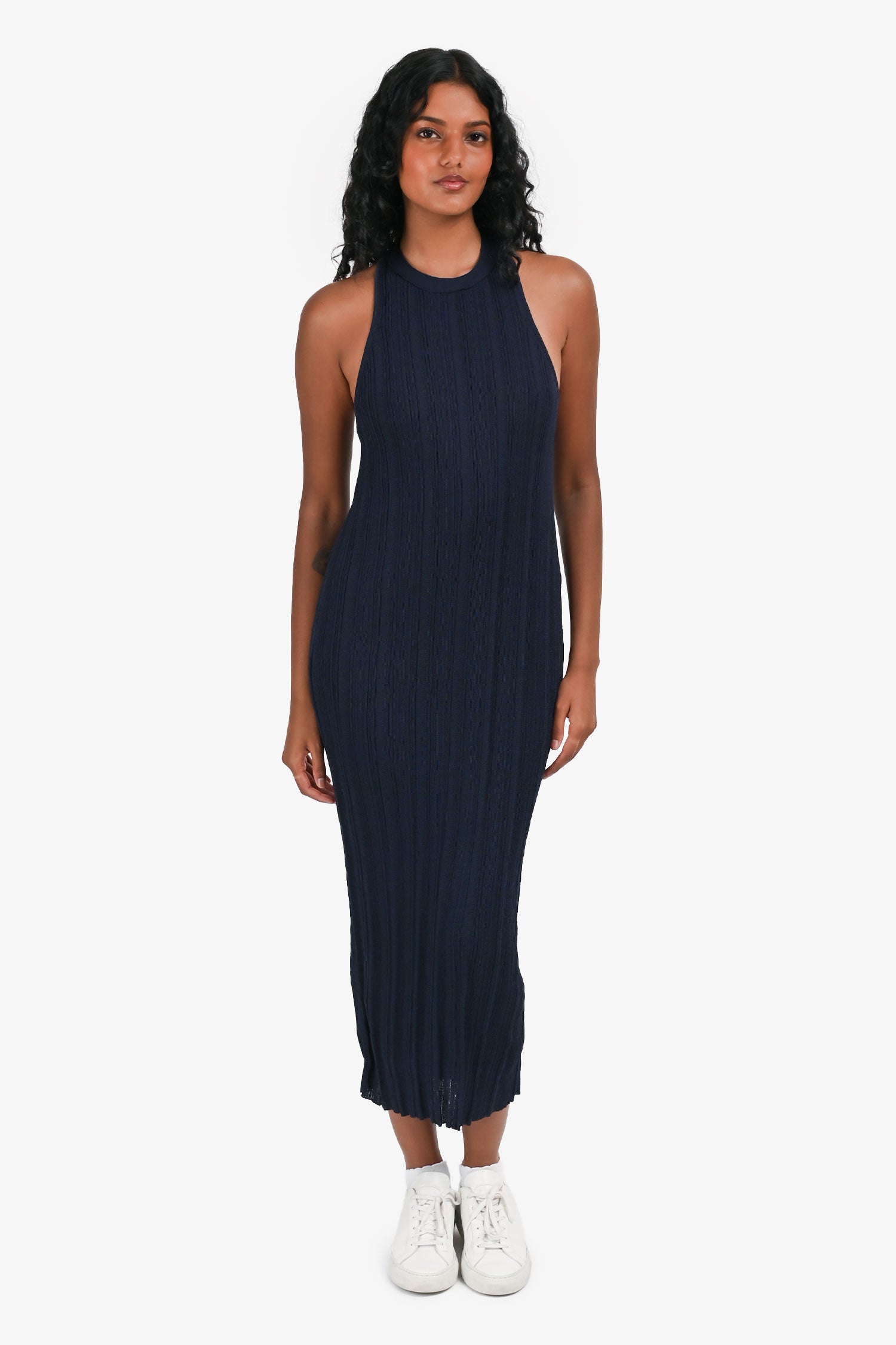 Refresh availabilityVince Navy Ribbed Sleeveless Maxi Dress. Snap button closure at the back of the neck. Unlined. Tonal stitching.
