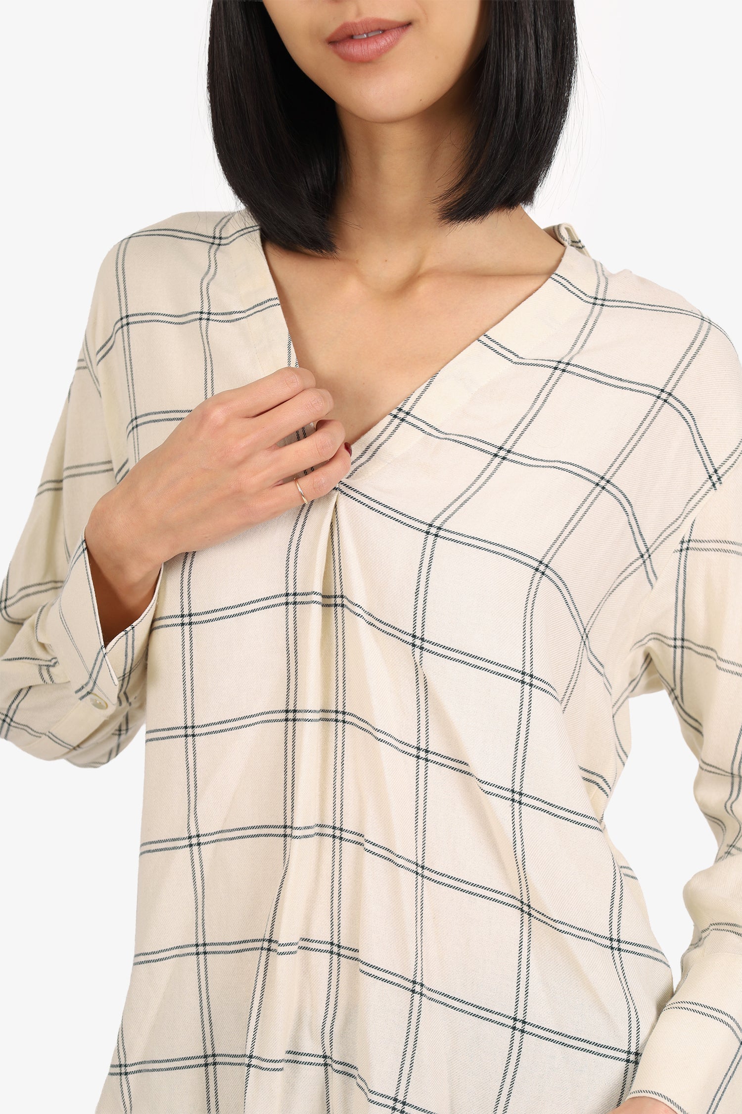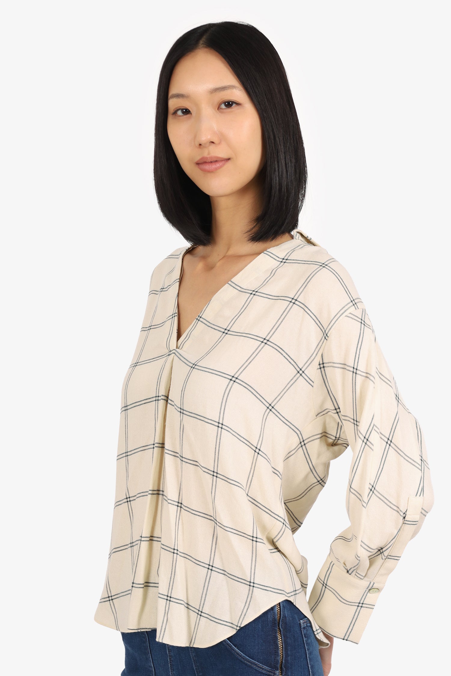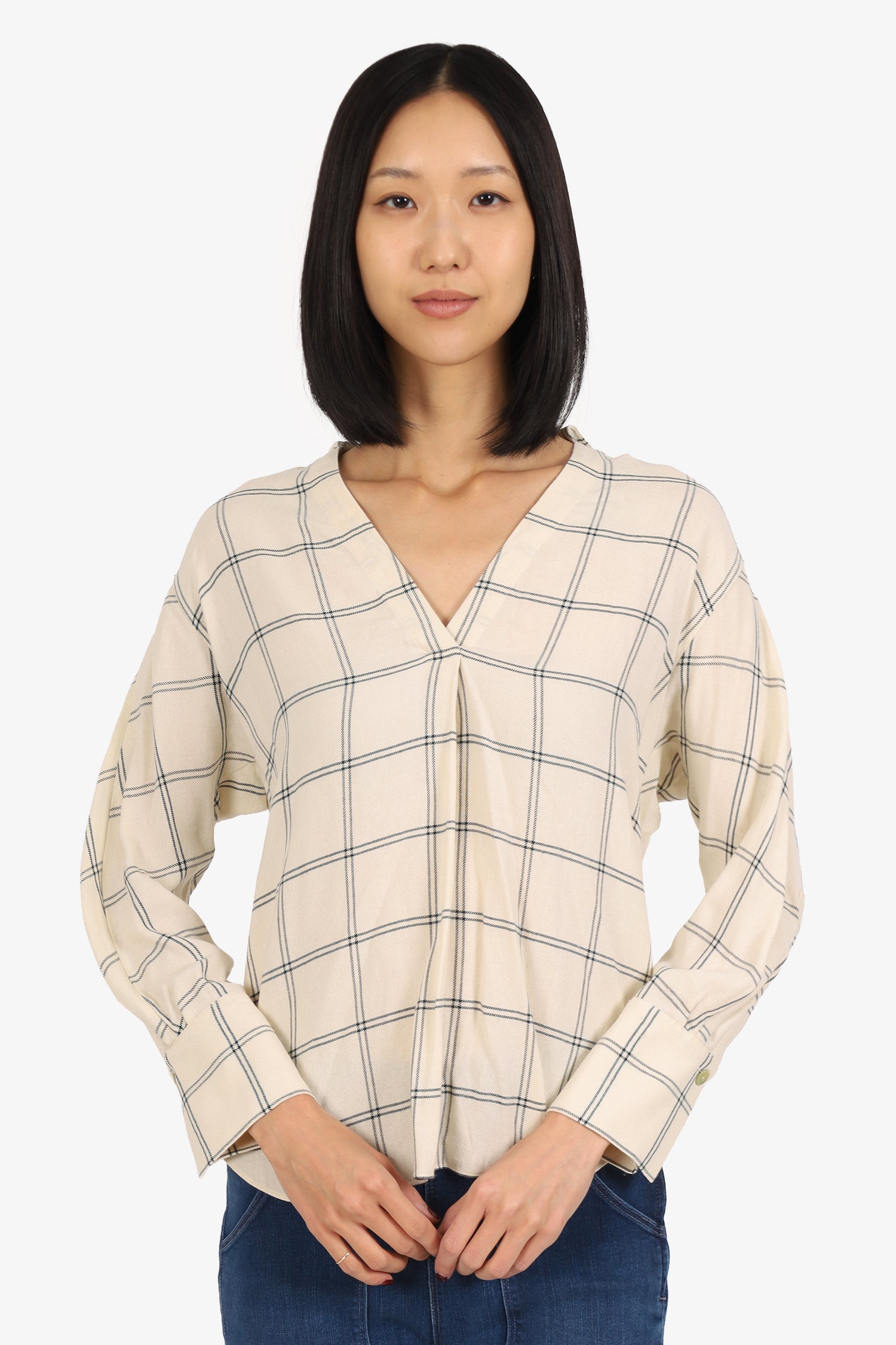 Refresh availabilityVince White Check V-Neck Top. Pull-on. V-neckline. Tonal stitching.