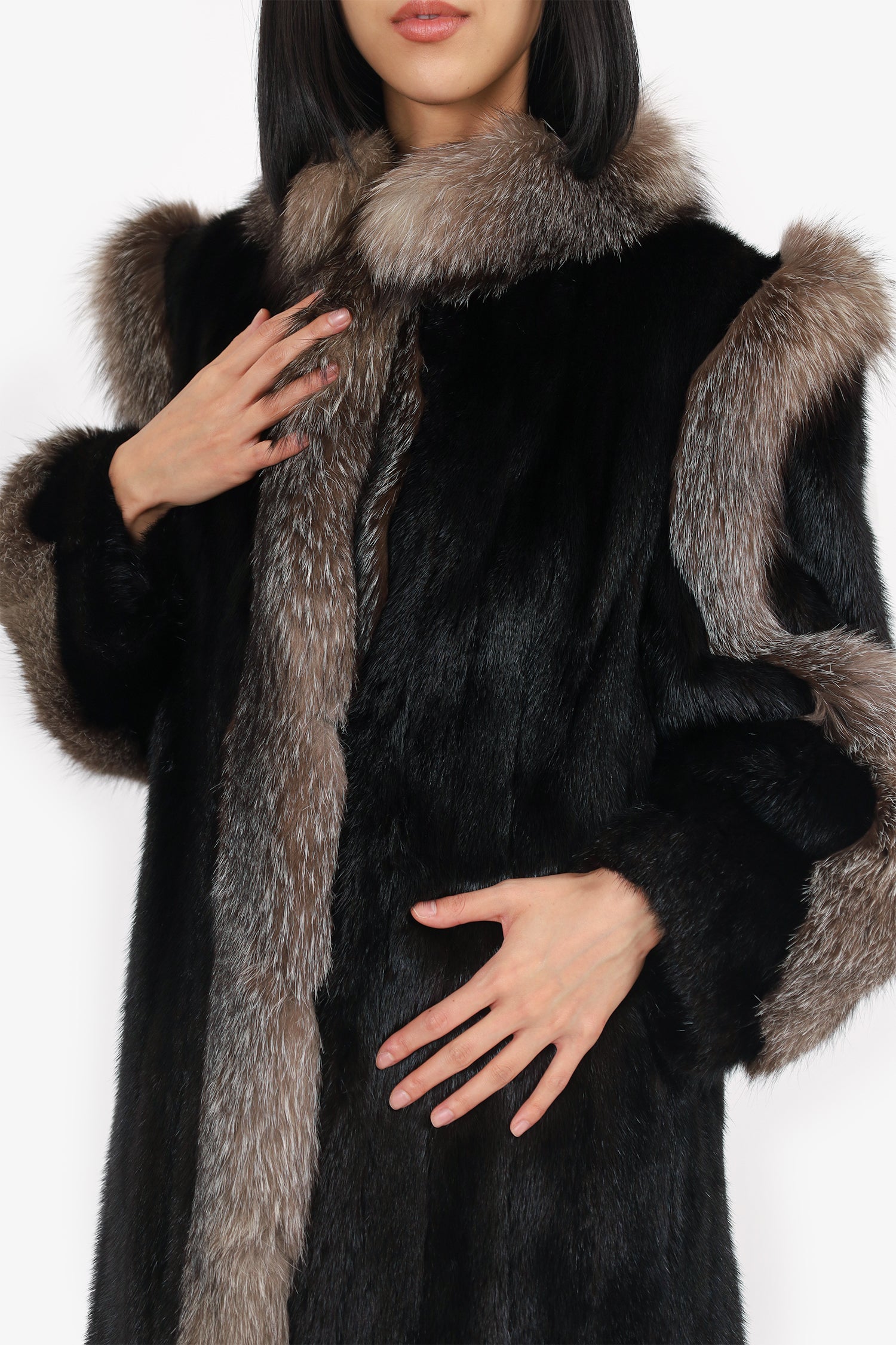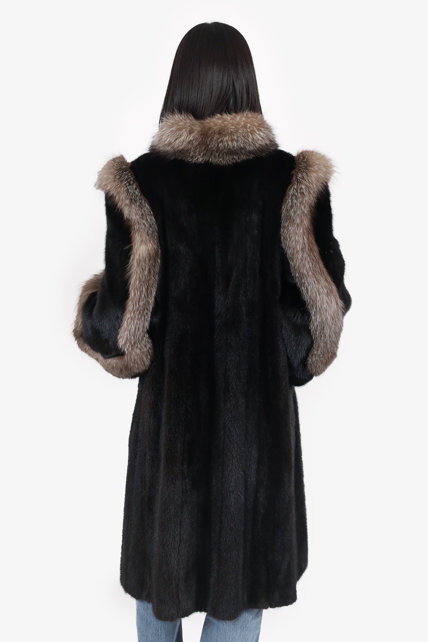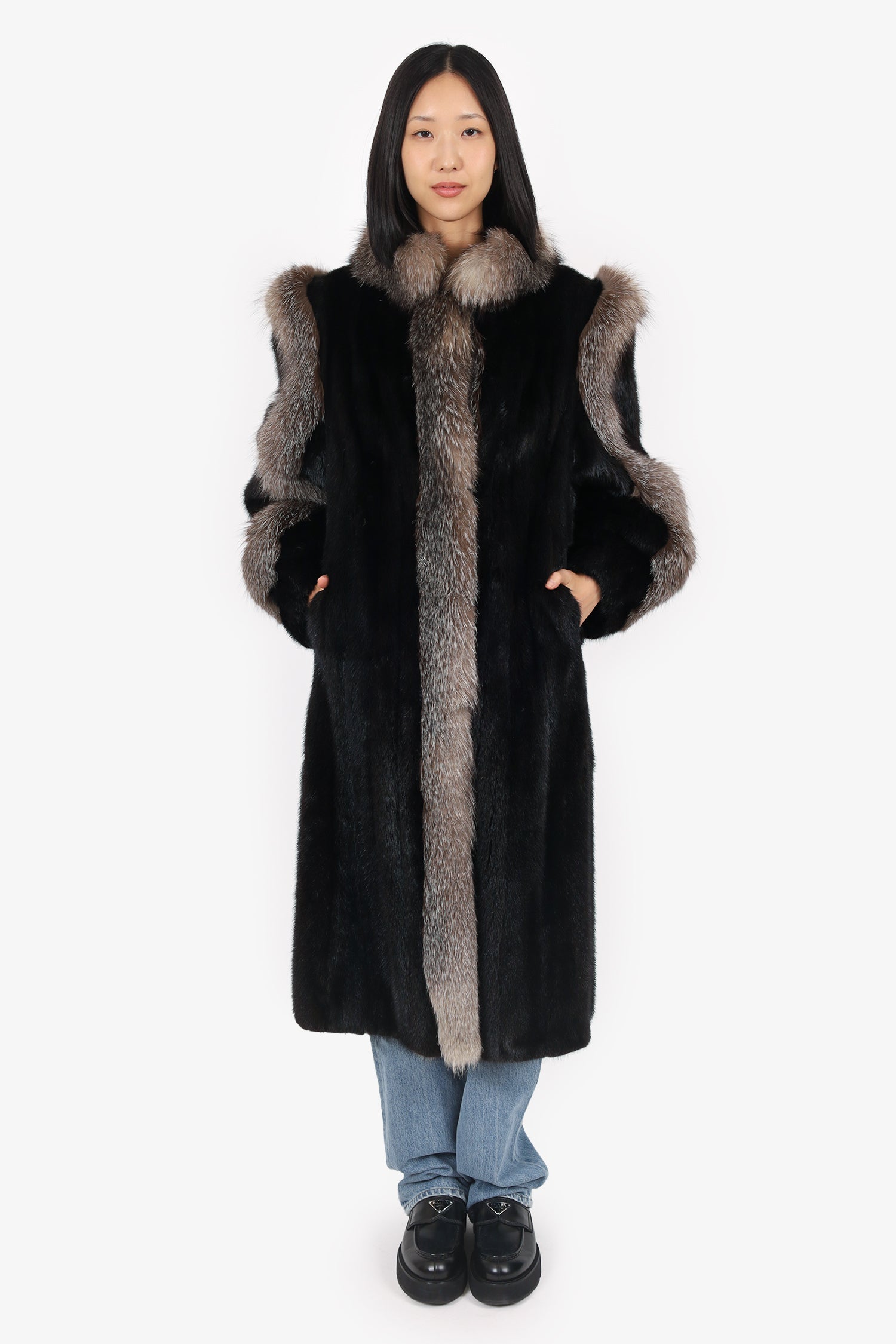 Refresh availabilityVintage Canadian Dark Ranch Mink/Fox Fur Long Coat. Pull-on. Collared neckline. Front hook closure with interior belt tie. Padding to shoulders. 2 exterior side slip pockets. Lined interior. Tonal stitching.