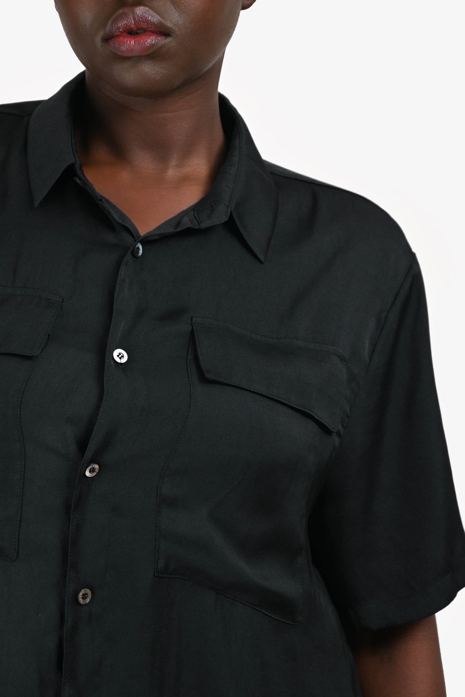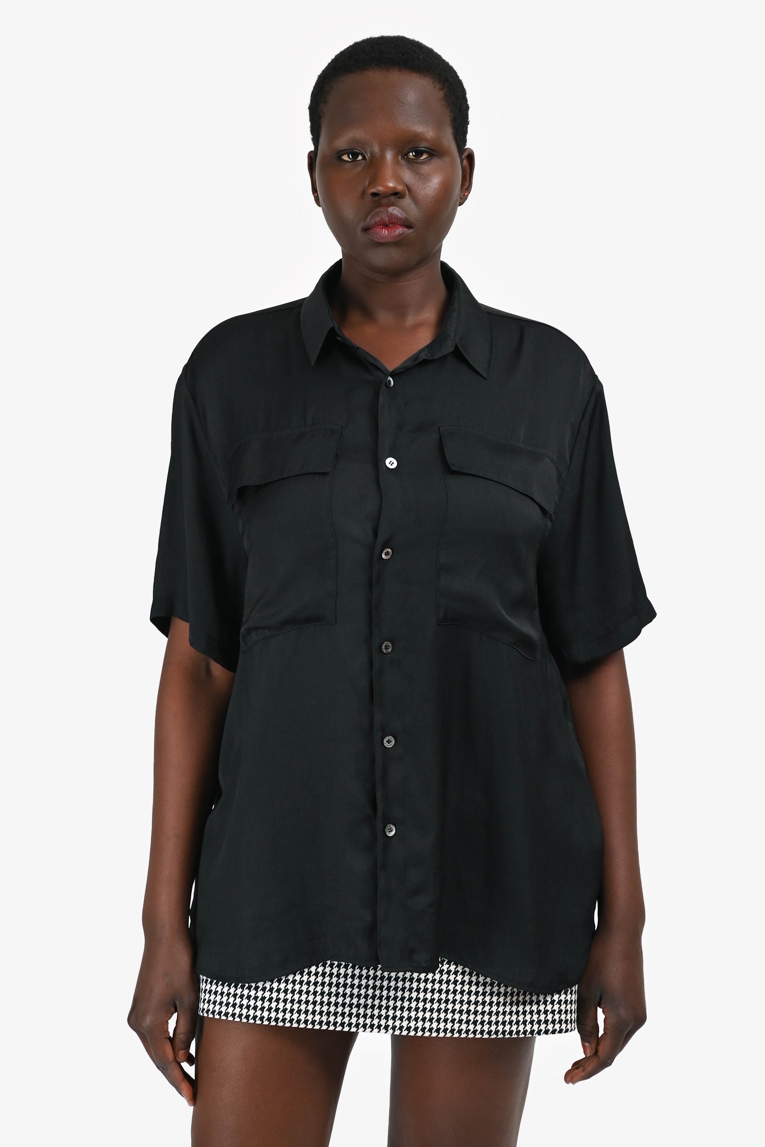 Refresh availabilityVis a Vis Black Silk Button Up Top. Collared neckline. Front button closure. Front flap pockets. Short sleeves with buttoned cuffs. Tonal stitching.