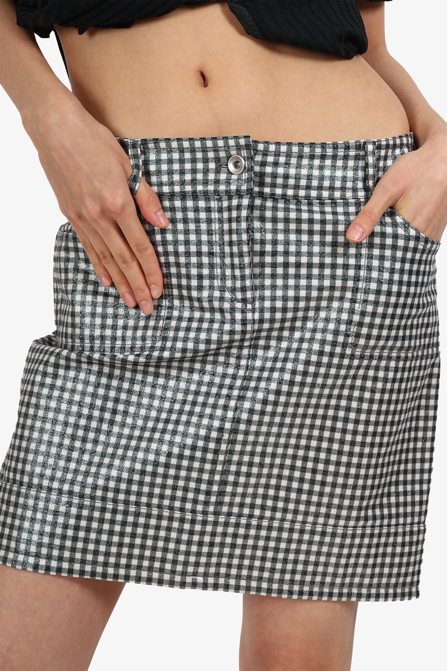 Refresh availabilityW by Worth Black/White Gingham Shimmer Skirt. Front zip with button-up closure. Waistband belt loops. 4 exterior pockets; 2 side slip and 2 rear slip. Unlined. Tonal stitching.
