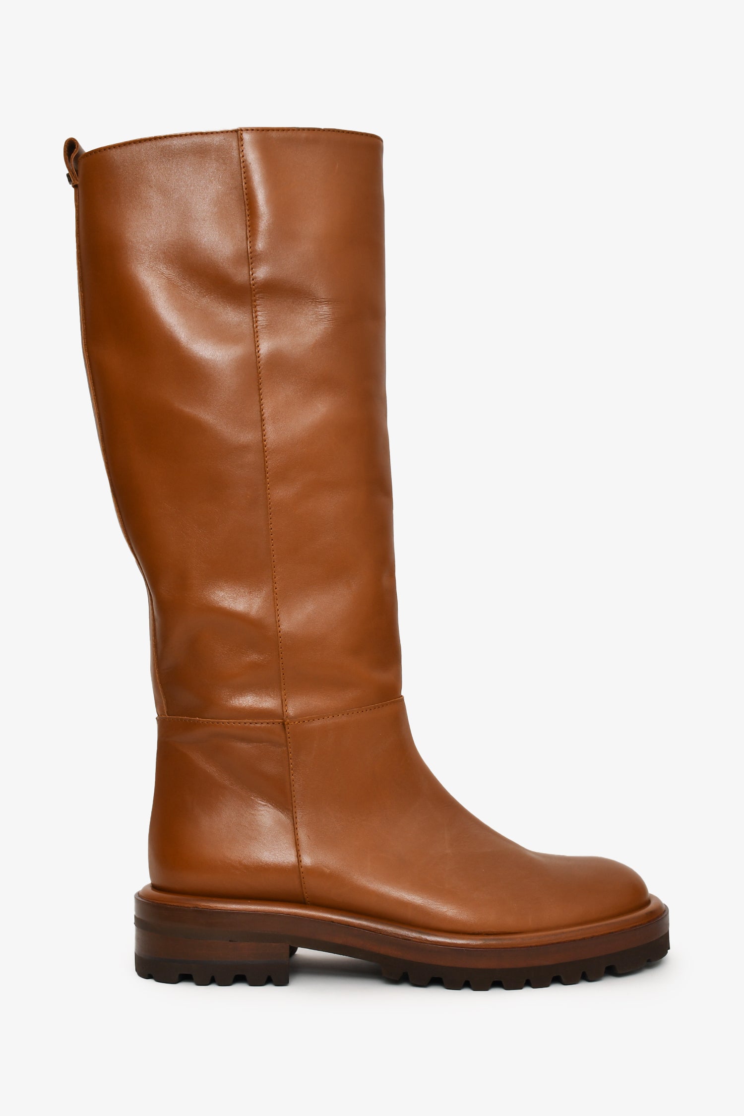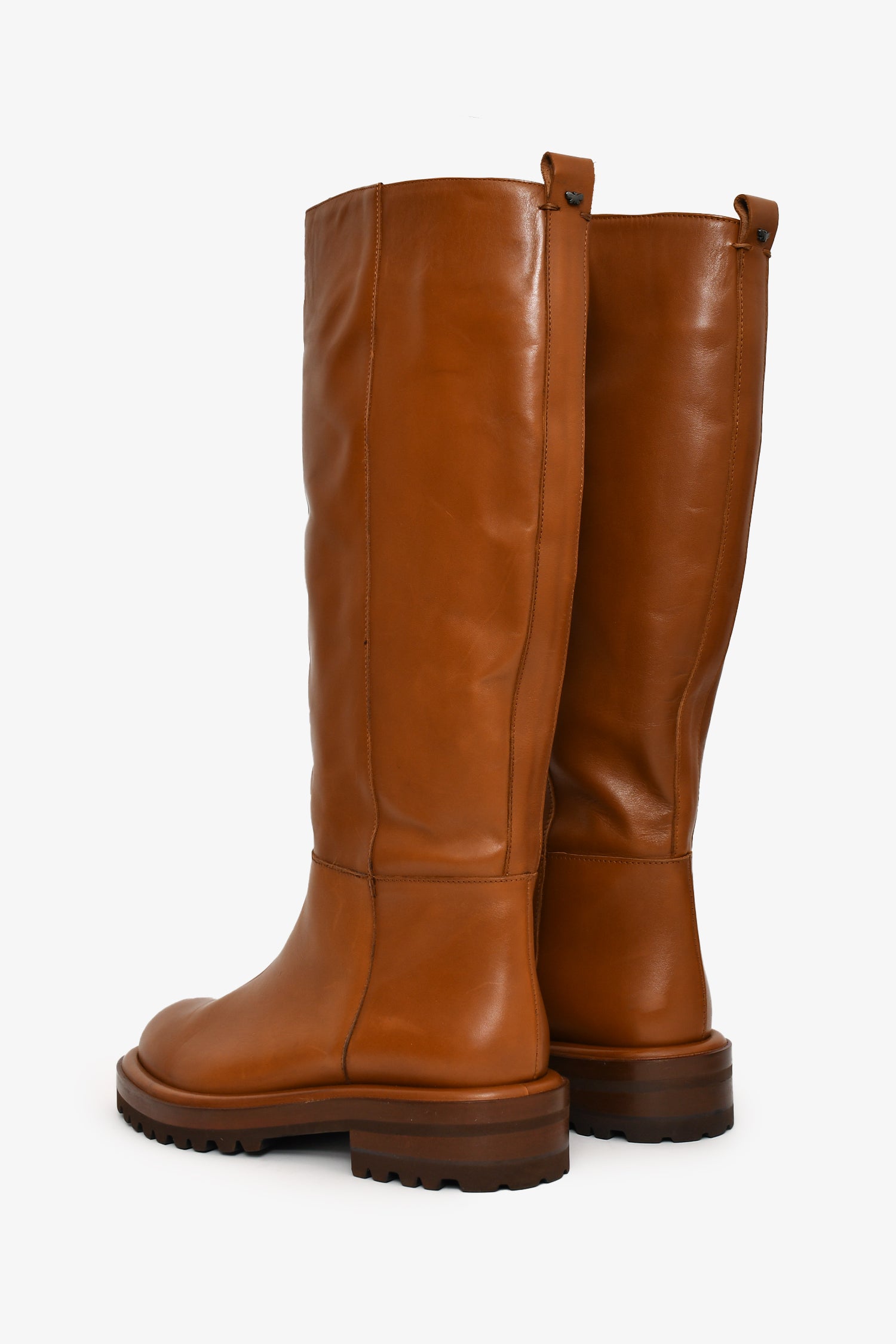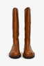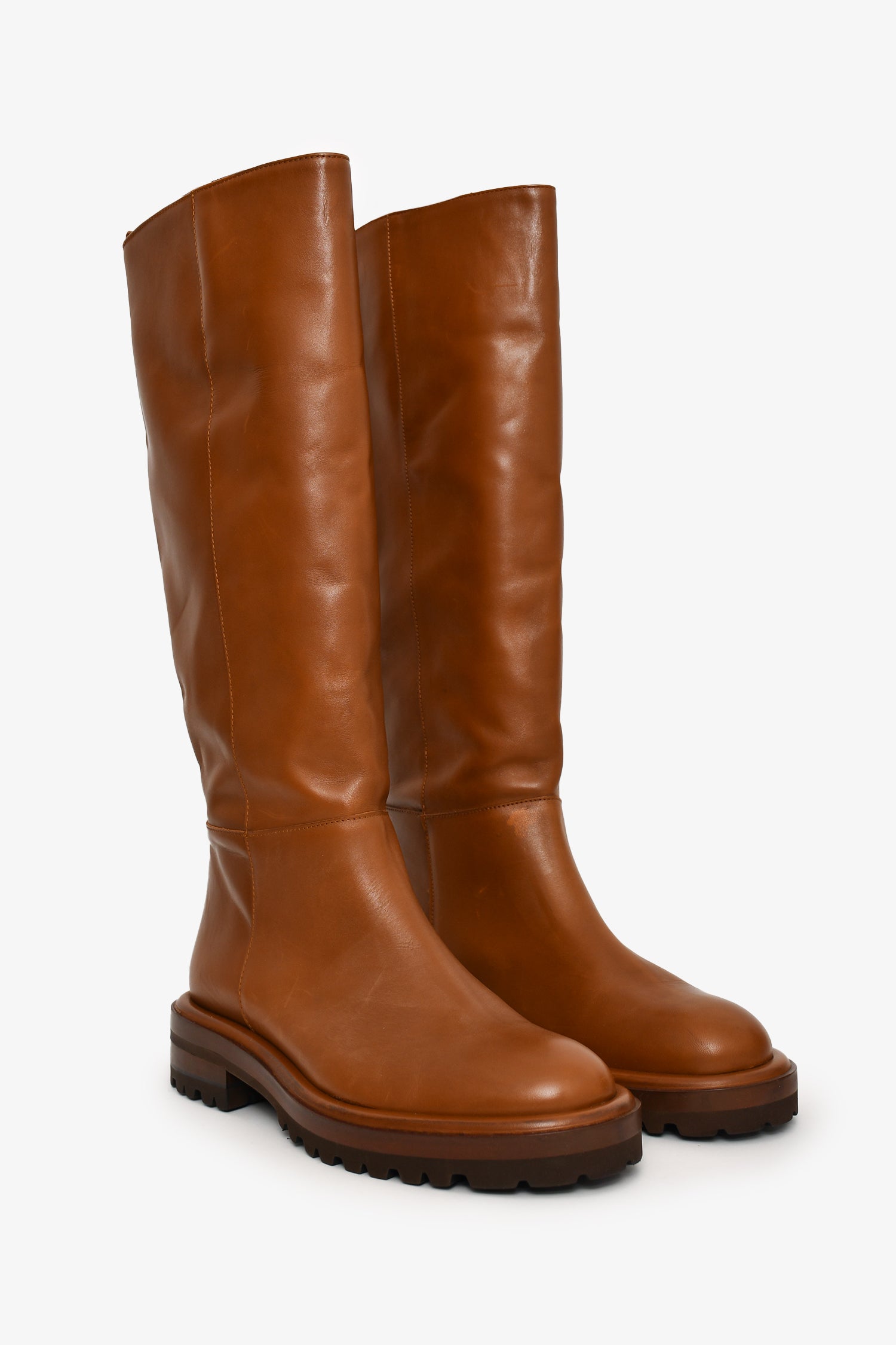 Refresh availabilityWeekend Max Mara Brown Leather Knee High Boots. Slip-on. Platform at the base. Hardware detailing on back. Grey-tonal hardware. Tonal stitching.