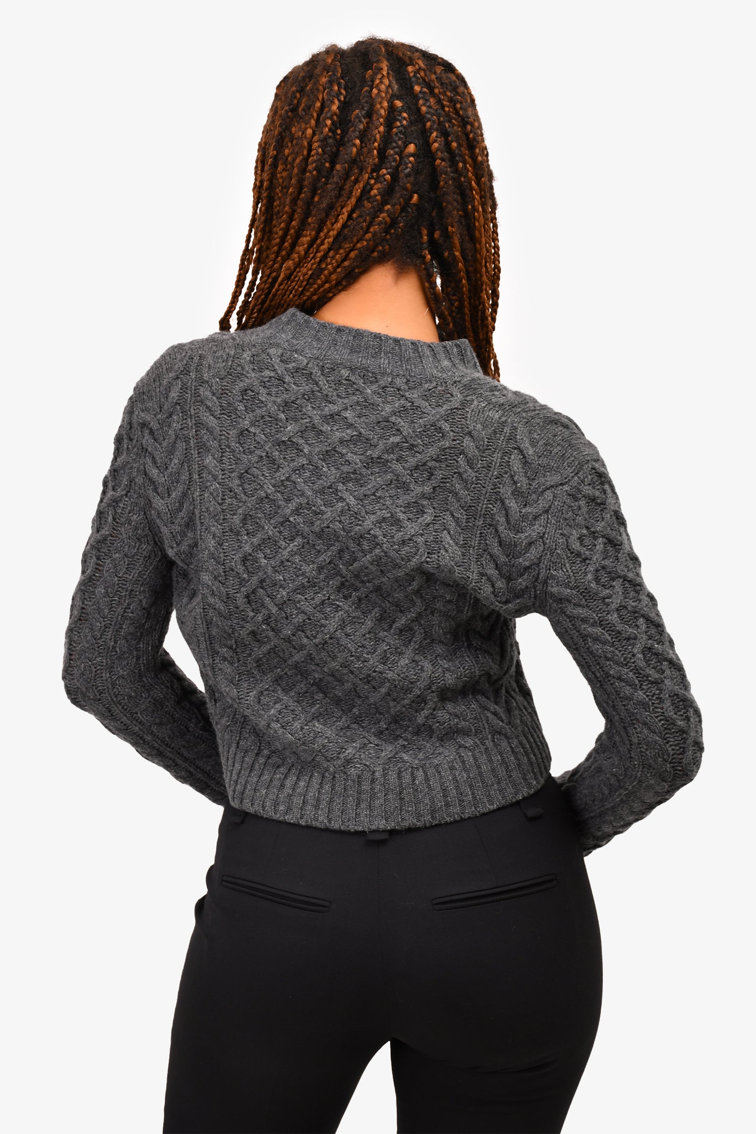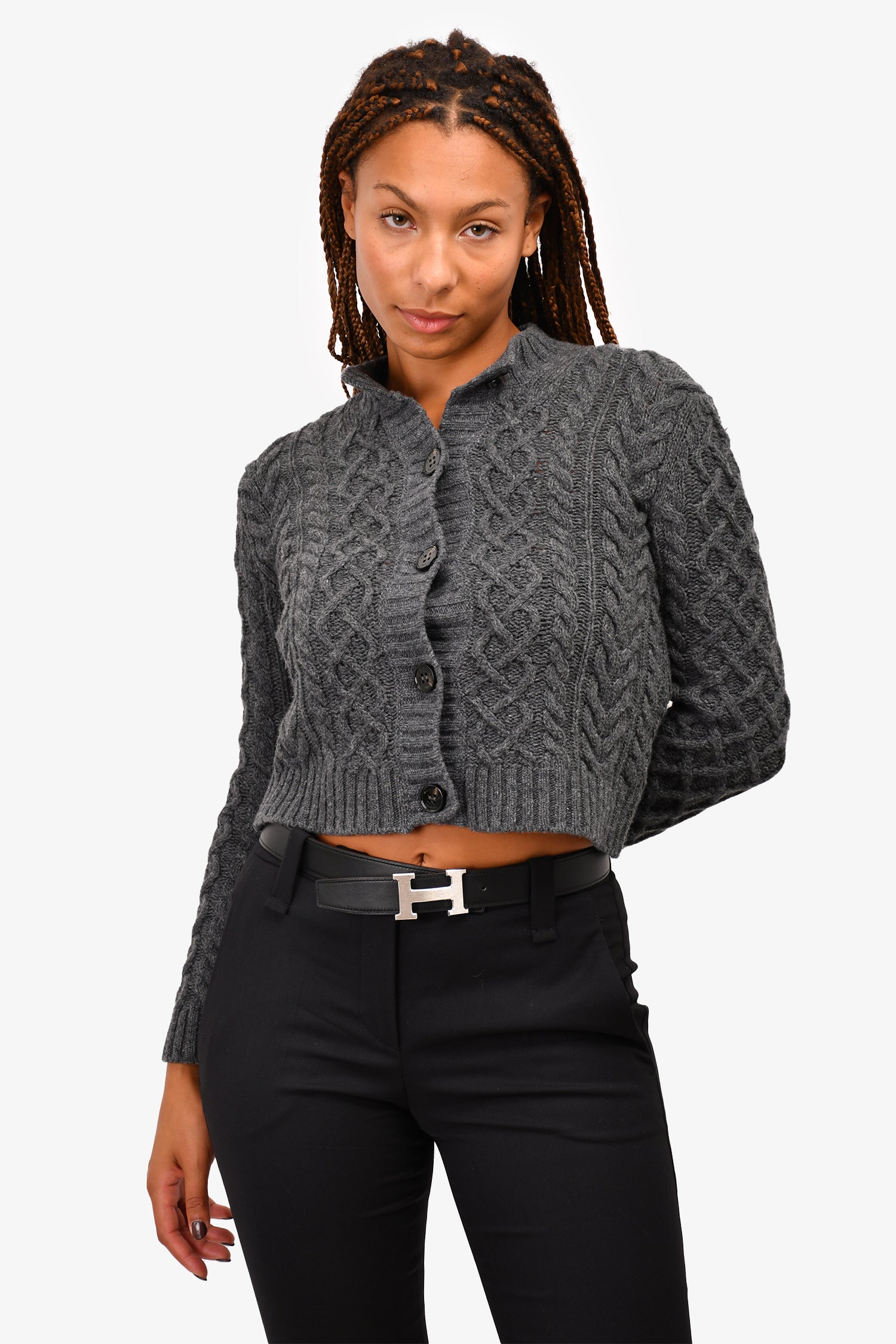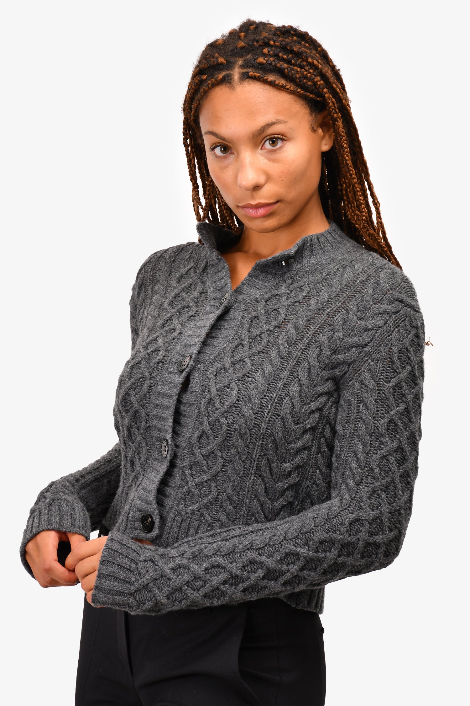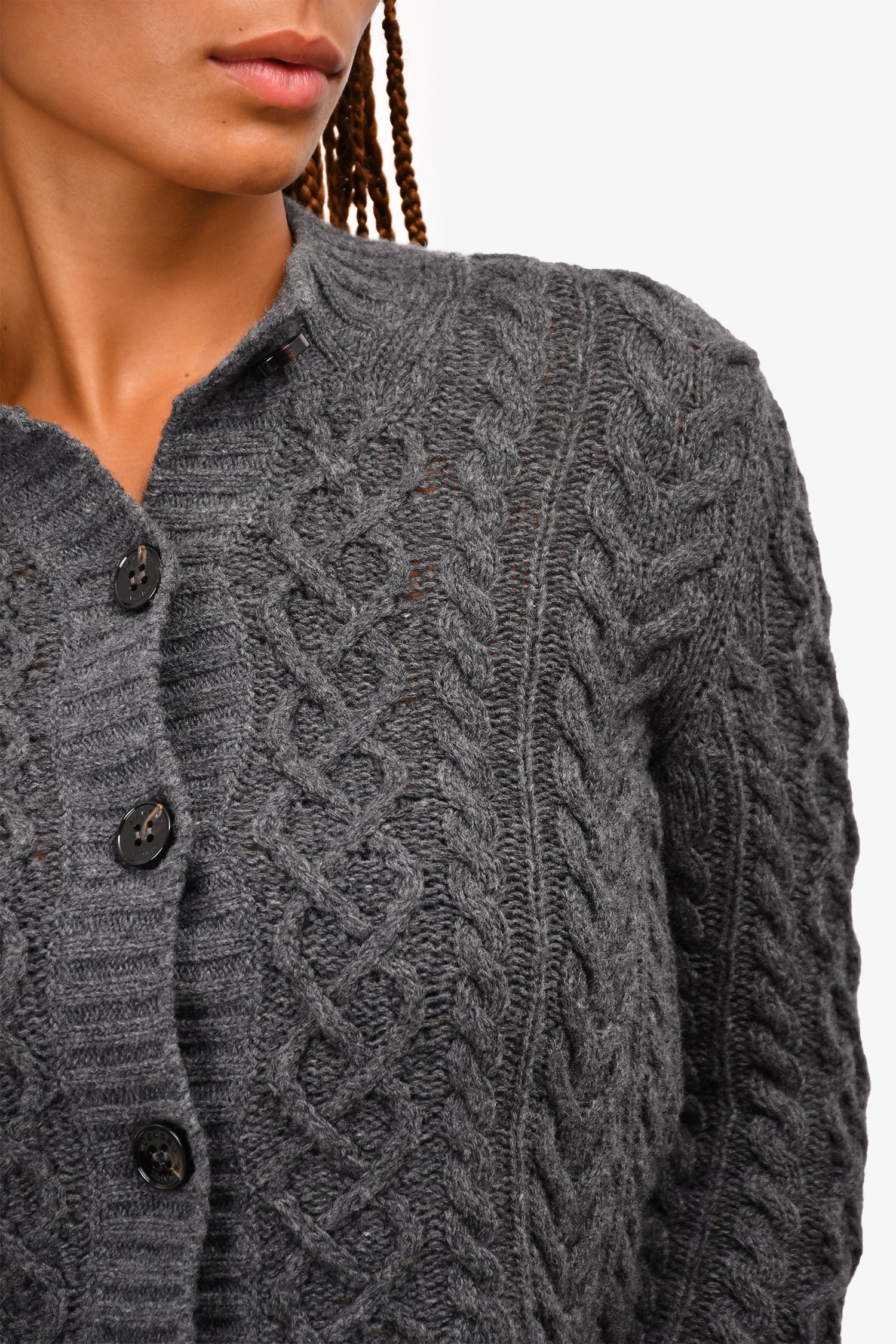 Refresh availabilityWeekend Max Mara Dark Grey Virgin Wool Cable Knit Cardigan. Front button-up closure. Ribbed hem and cuffs.