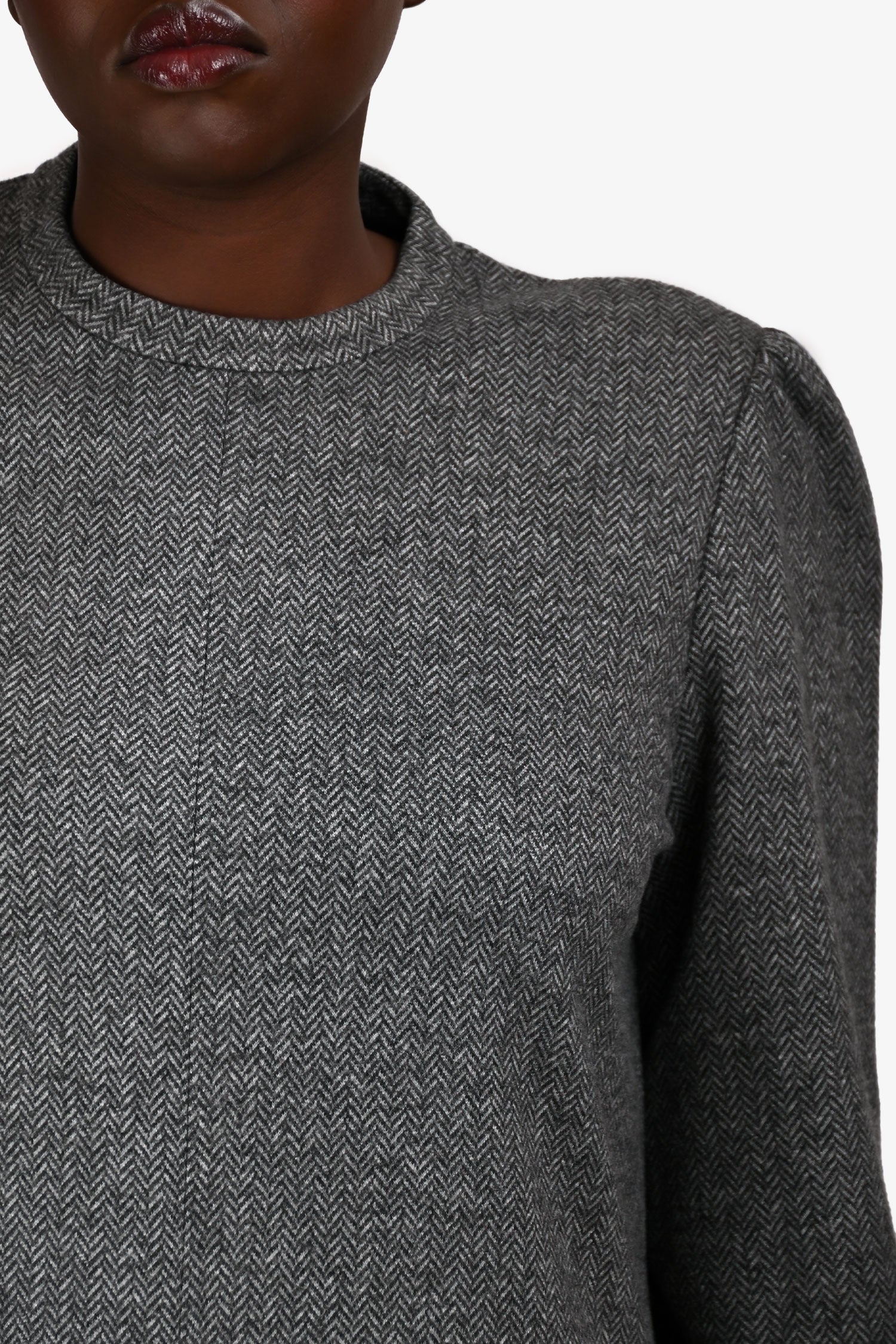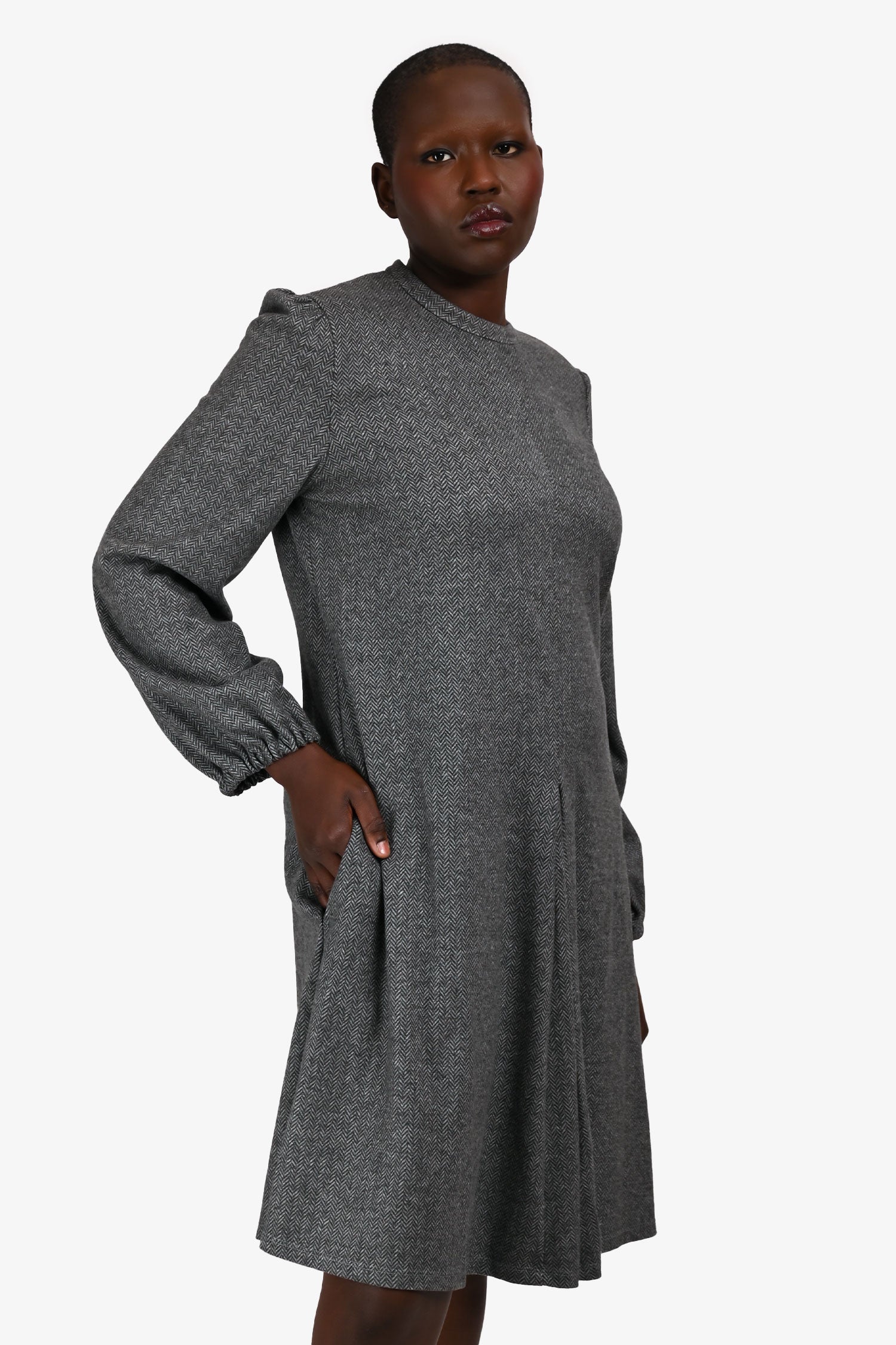 Refresh availabilityWeekend Max Mara Grey Herringbone Dress. Slip-on. Round neckline. Rear zip closure. Puckered shoulder seams. Elasticized cuffs. 2 exterior side seam pockets. Unlined. Tonal stitching.