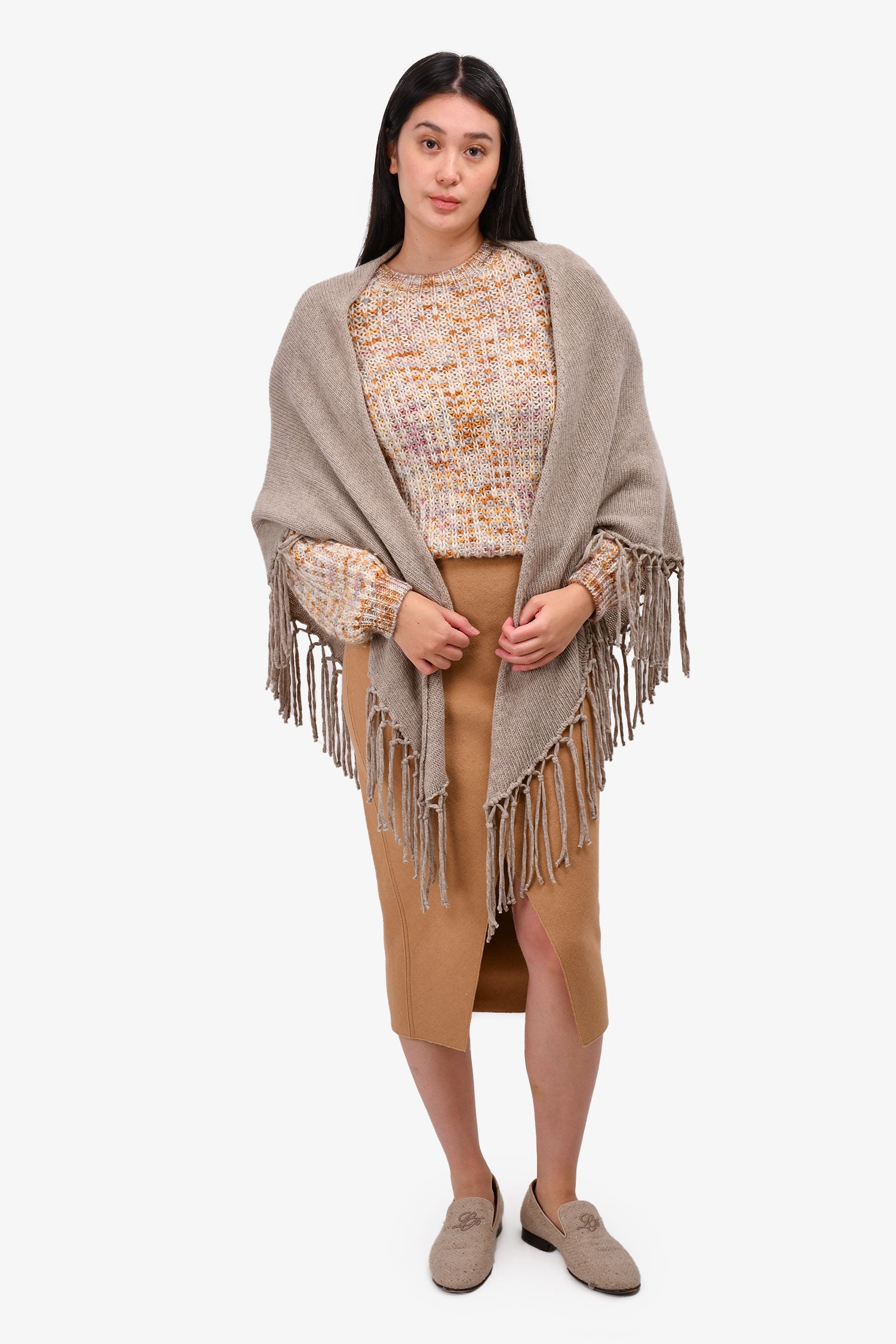 Refresh availabilityWeekend Max Mara Grey Wool Knit Shawl. Fringes at the hem. Tonal stitching.