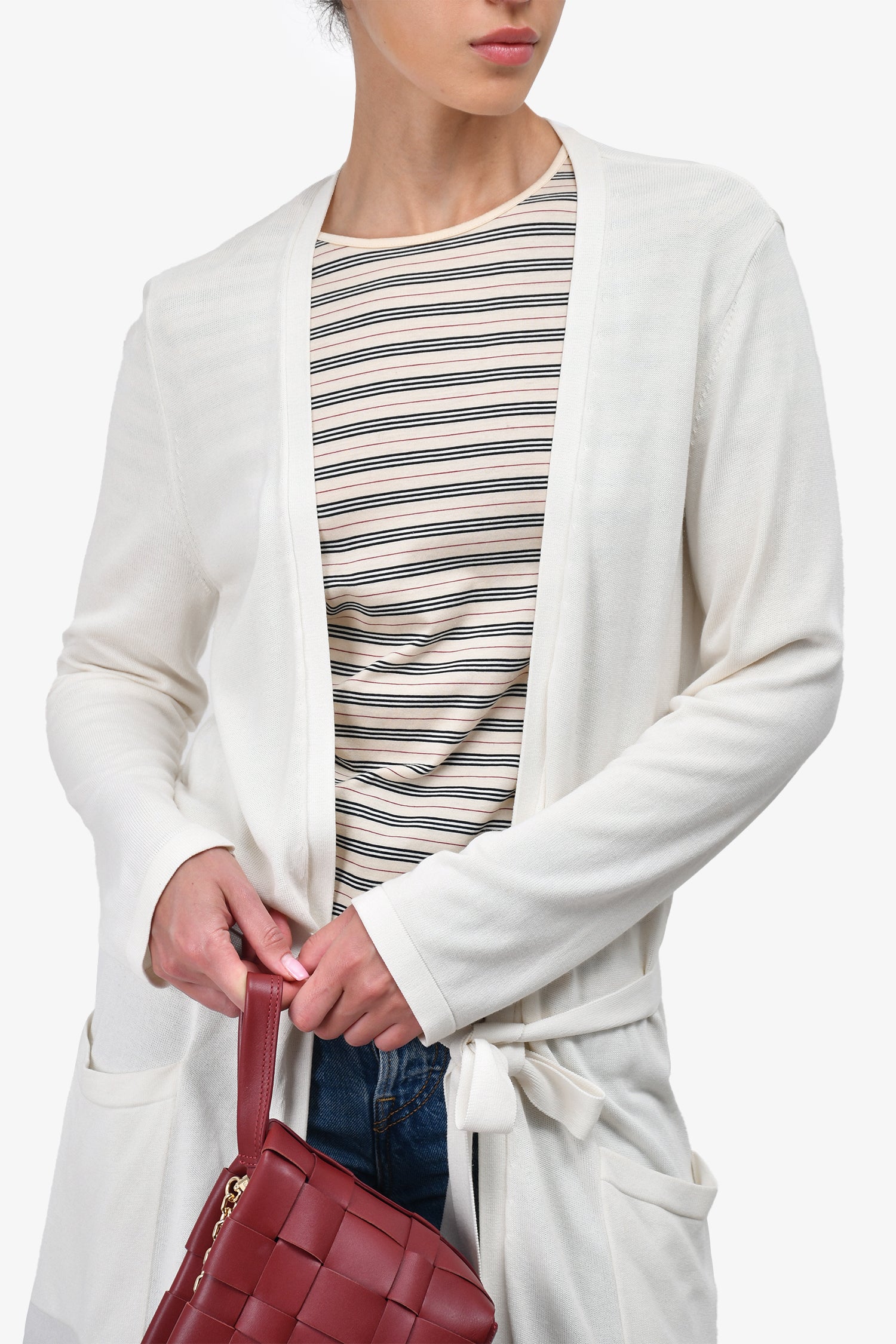 Refresh availabilityWeekend Max Mara White Sheer Waist-Tie Cardigan. Open front. Adjustable belt. Tonal stitching.