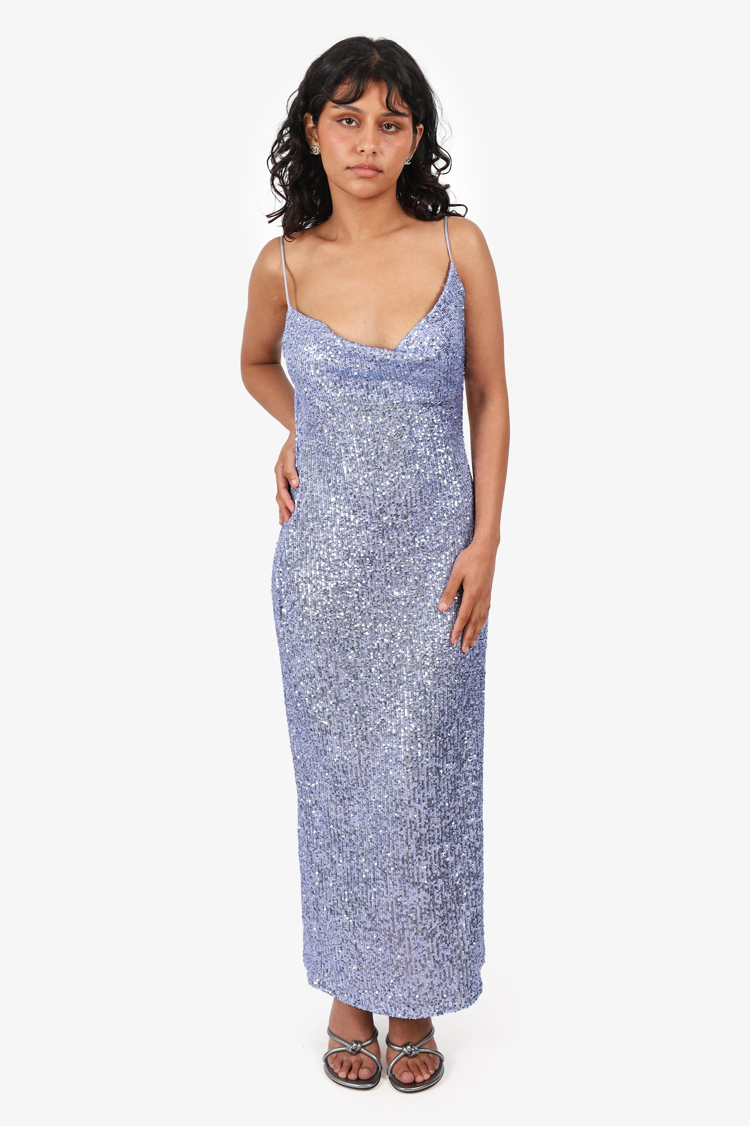 Refresh availabilityWinona Purple Sequin 'Marni' Midi Dress. Slip-on. Cowl neckline. One strap with tie-up closure. Lined interior. Tonal stitching.