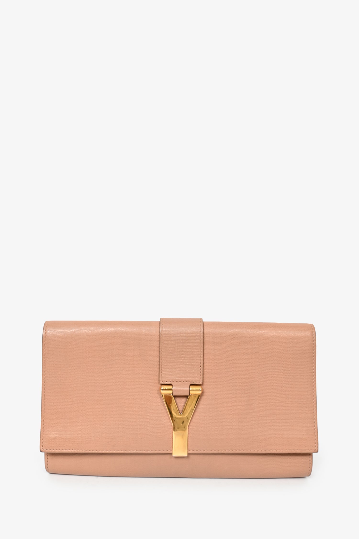 Refresh availabilityYves Saint Laurent Beige Leather Gold 'Y' Ligne Clutch. Front flap with magnetic closure. Interior slip pocket. Beige satin lining. Tonal stitching. Gold-toned hardware.
