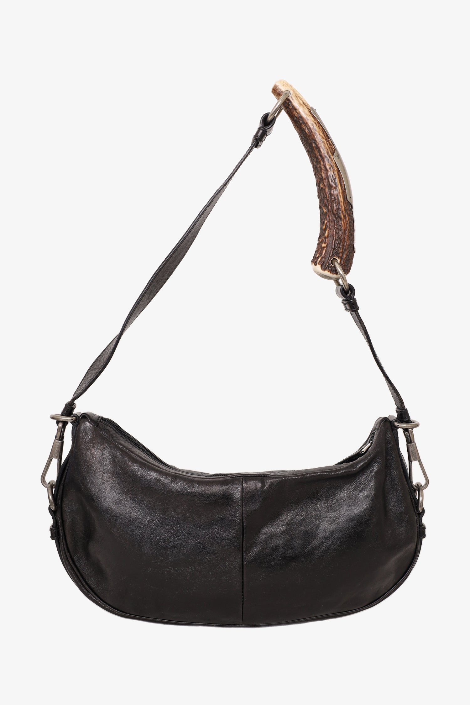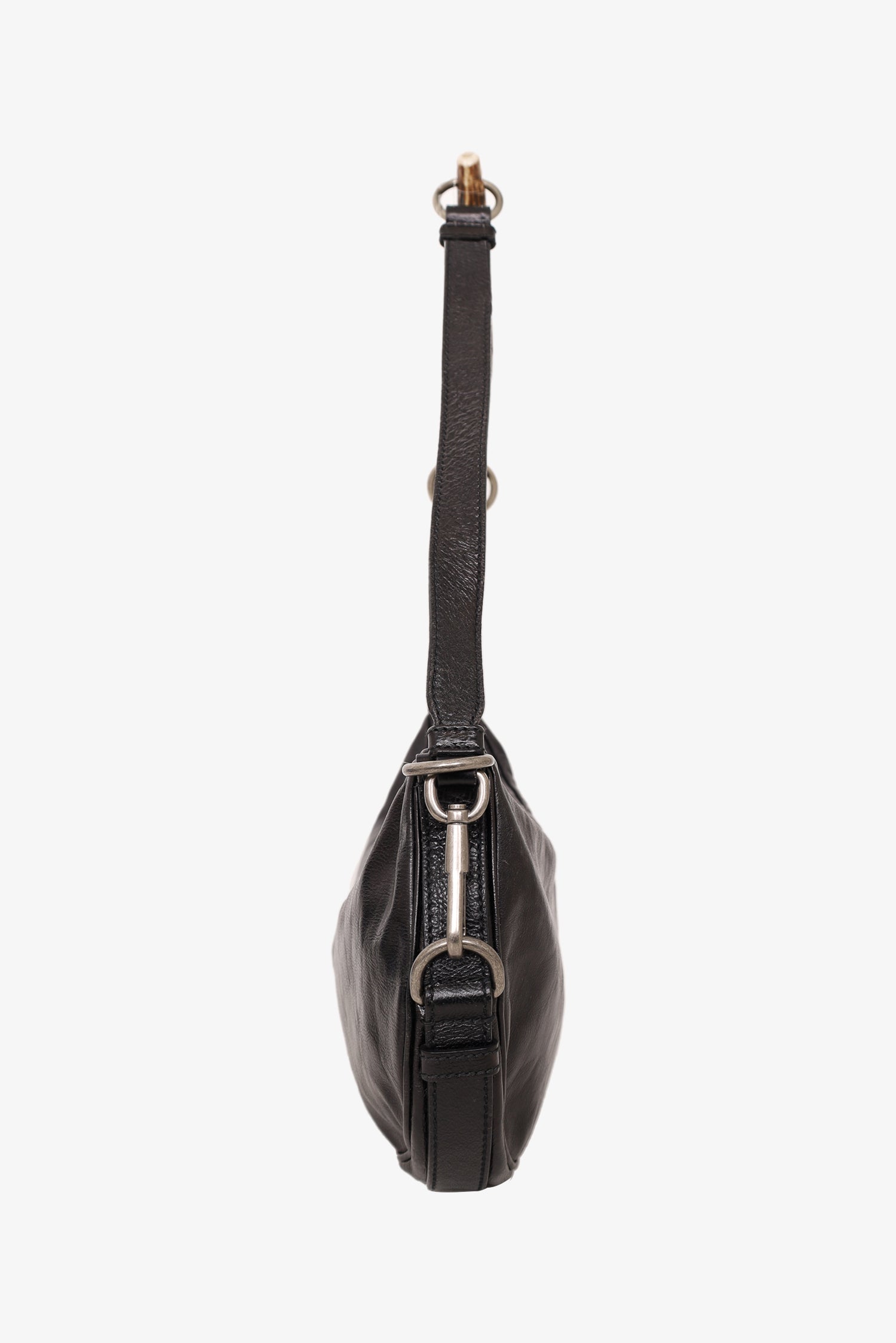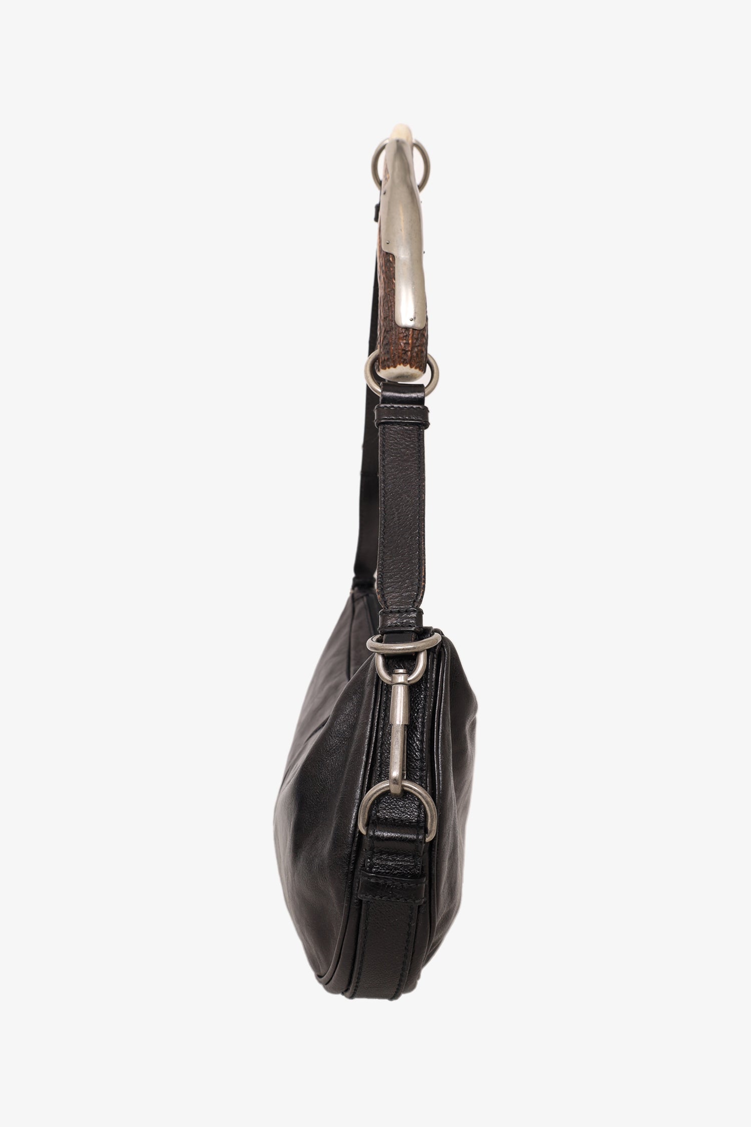 Yves Saint Laurent Black Leather Mombasa Bag. Removable top handle with lobster clasp and bone detailing. Top zip-up closure. Suede interior lining. Singular interior zip pocket. Silver-toned hardware. Tonal stitching.