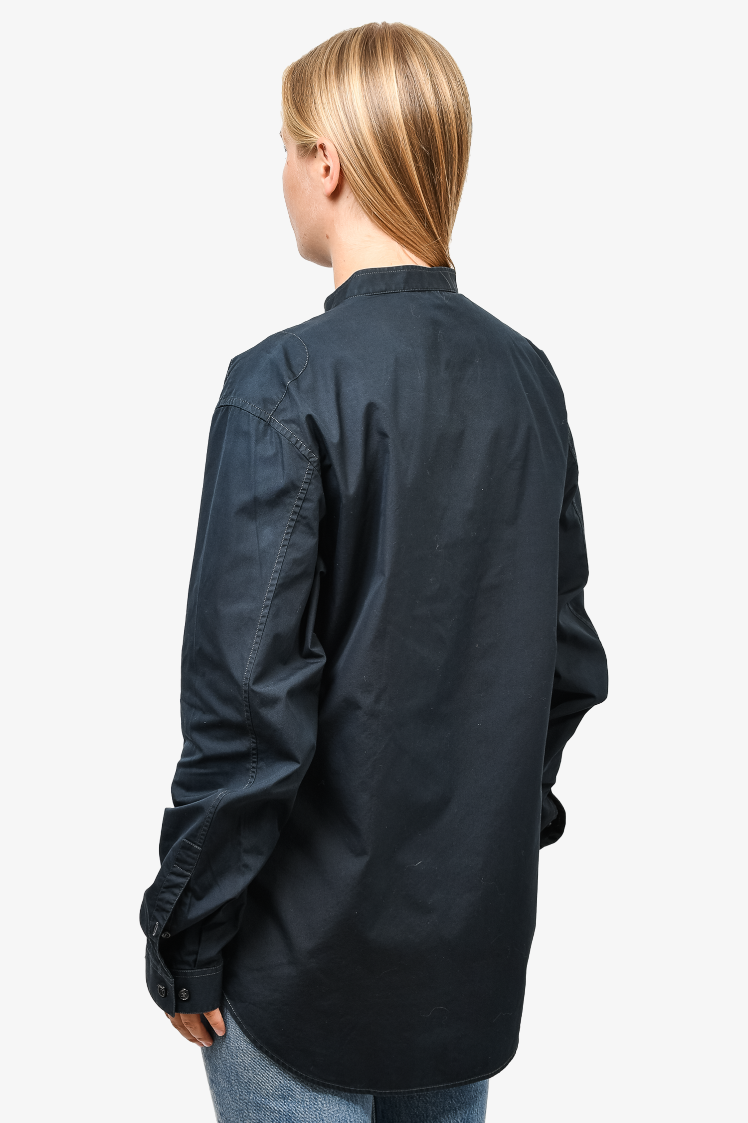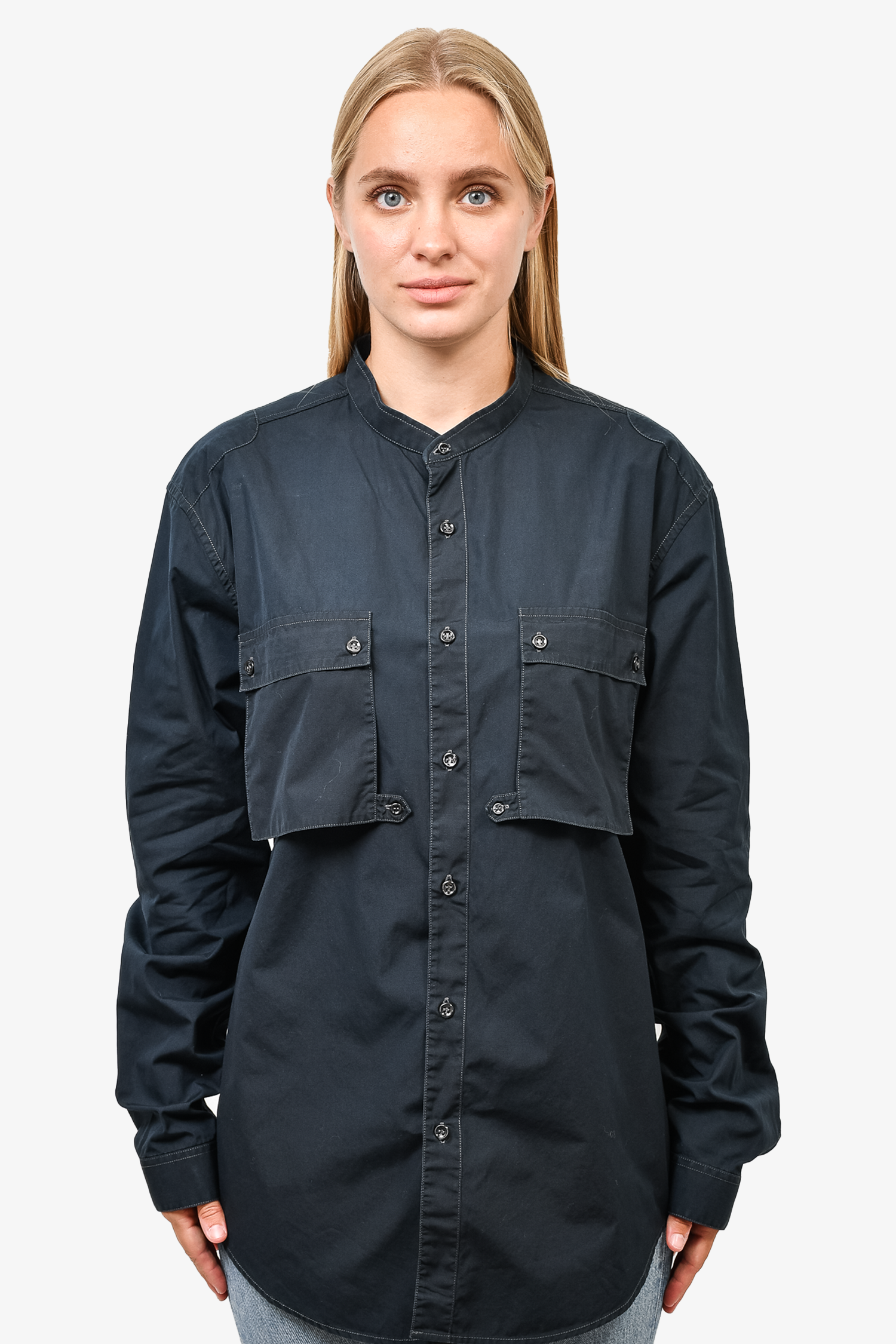Refresh availabilityYves Saint Laurent Black Utility Dress Shirt With Mandarin Collar. Front button-up closure. Tonal stitching.