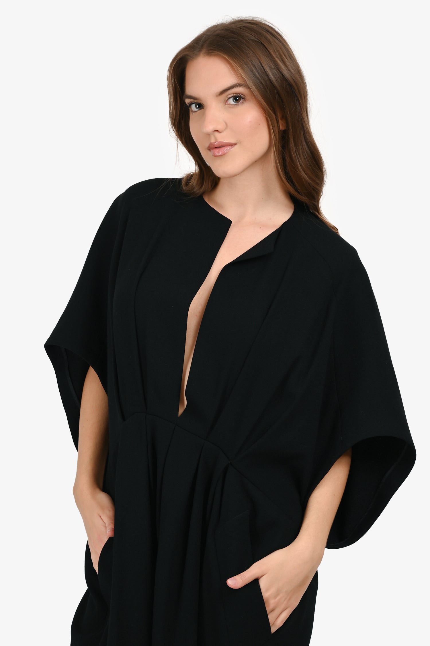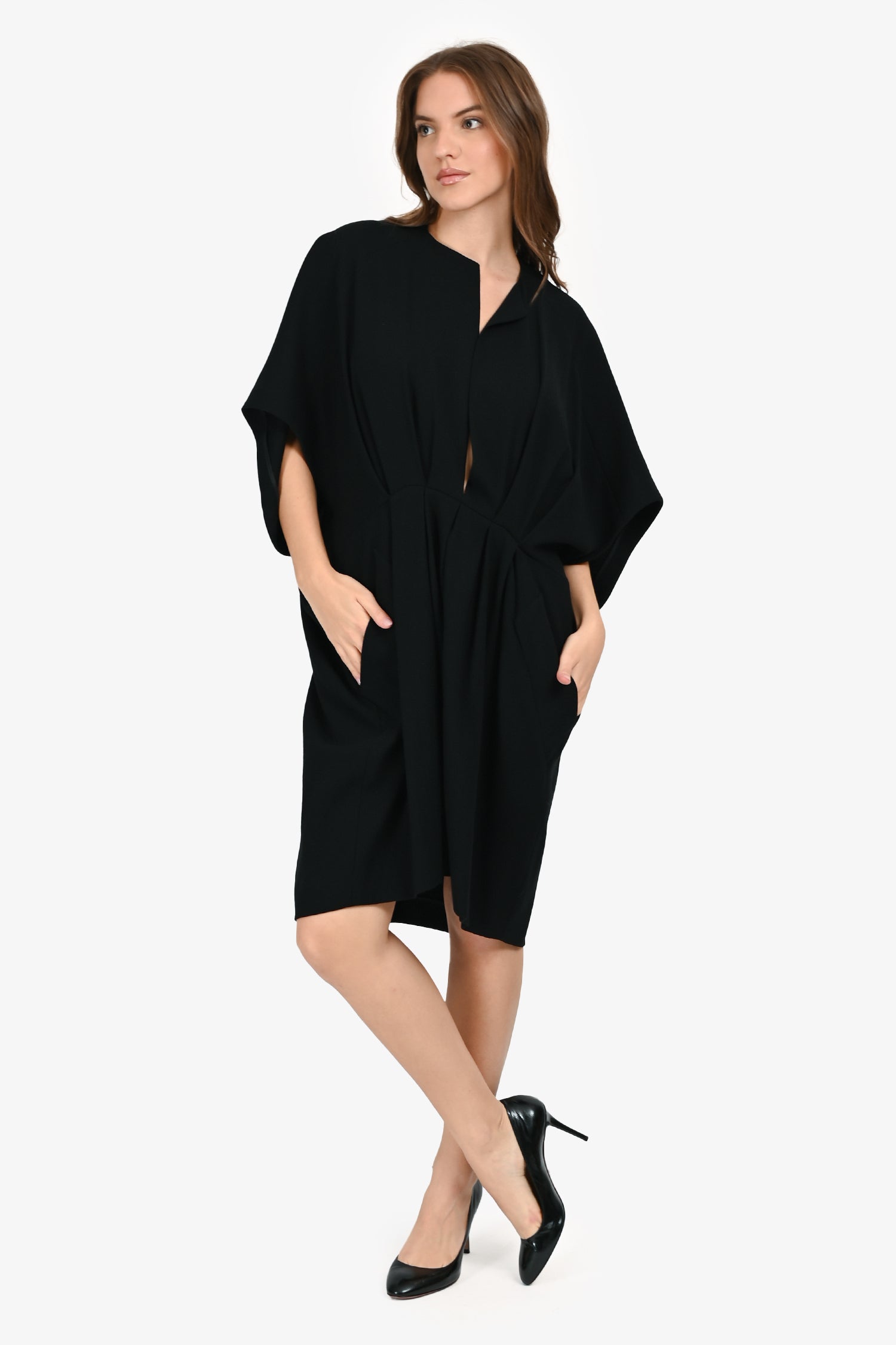 Refresh availabilityYves Saint Laurent Black Wool V-Neck Pleated Detail Dress. Slip-on. 2 exterior faux side slip pockets. Unlined. Tonal stitching.