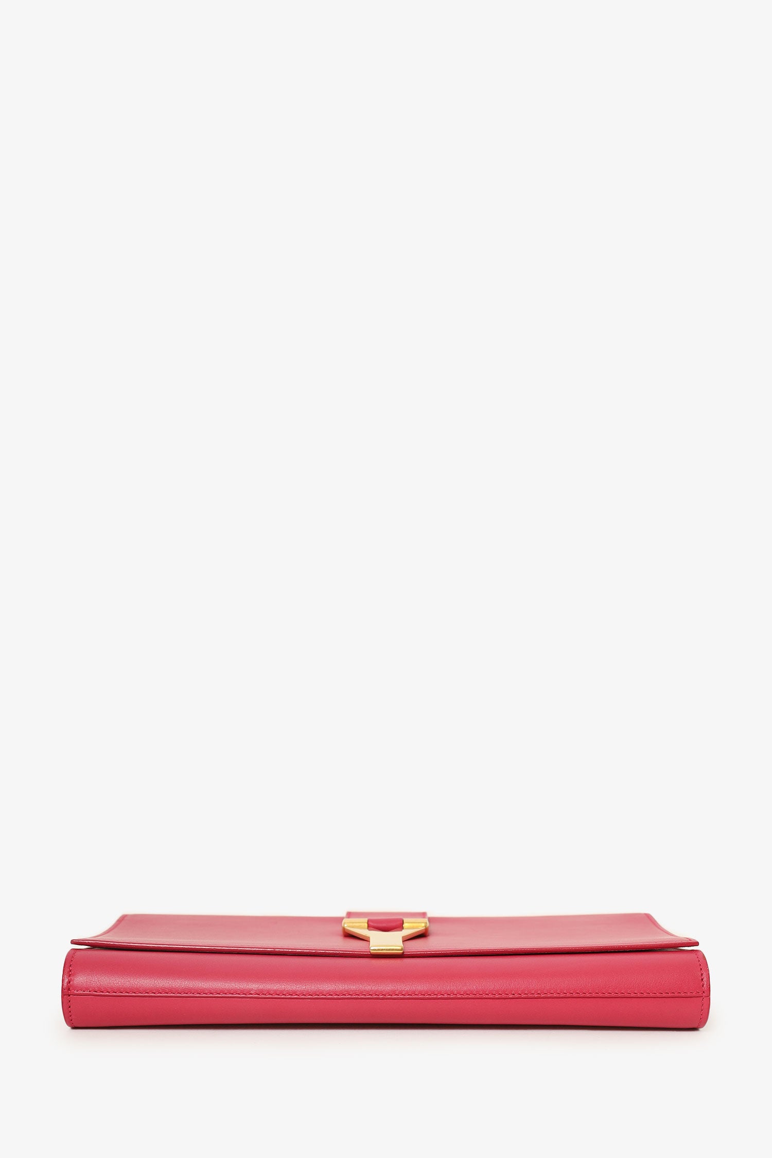 Refresh availabilityYves Saint Laurent Hot Pink Leather Ligne Clutch. Front fold-over flap with magnetic button closure. Interior wall slip pocket. Gold tone hardware. Tonal stitching